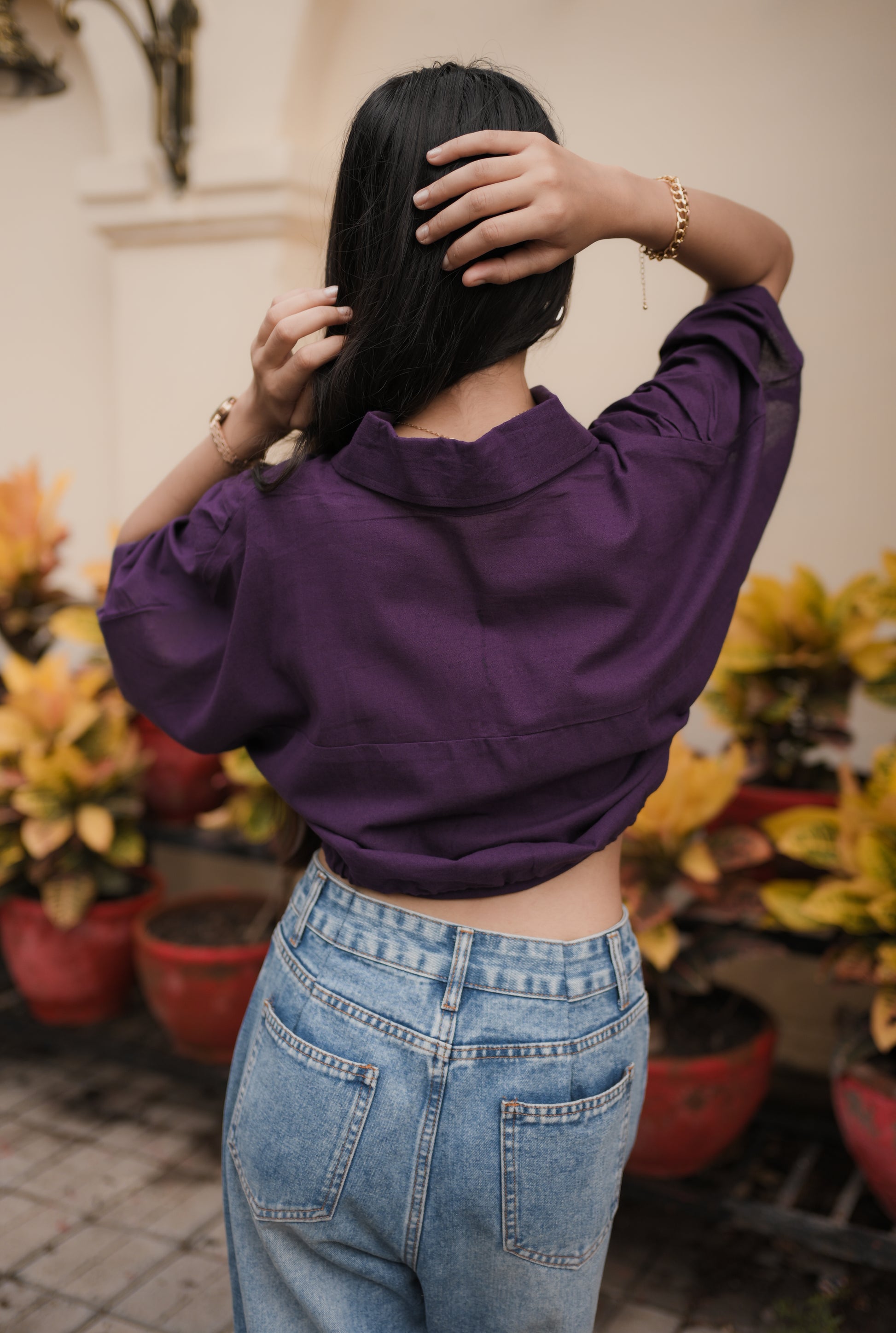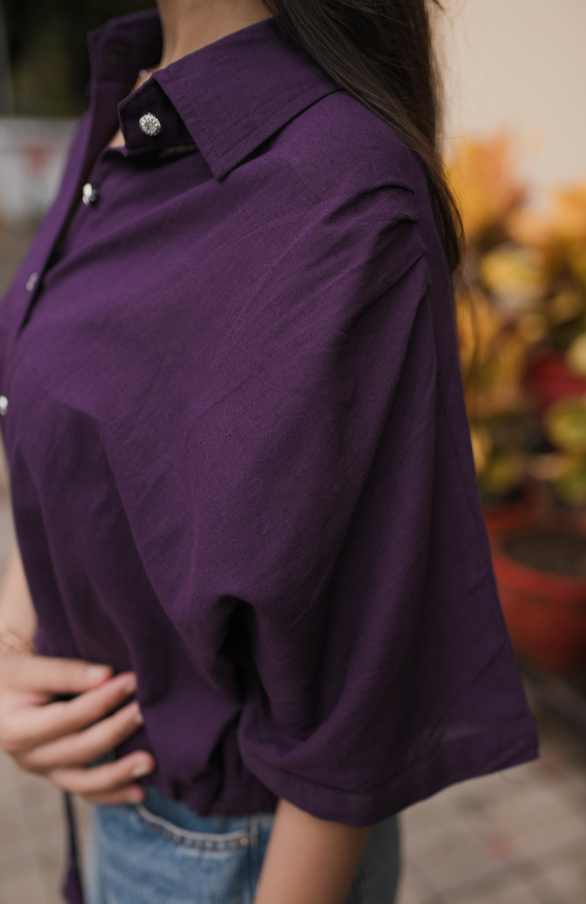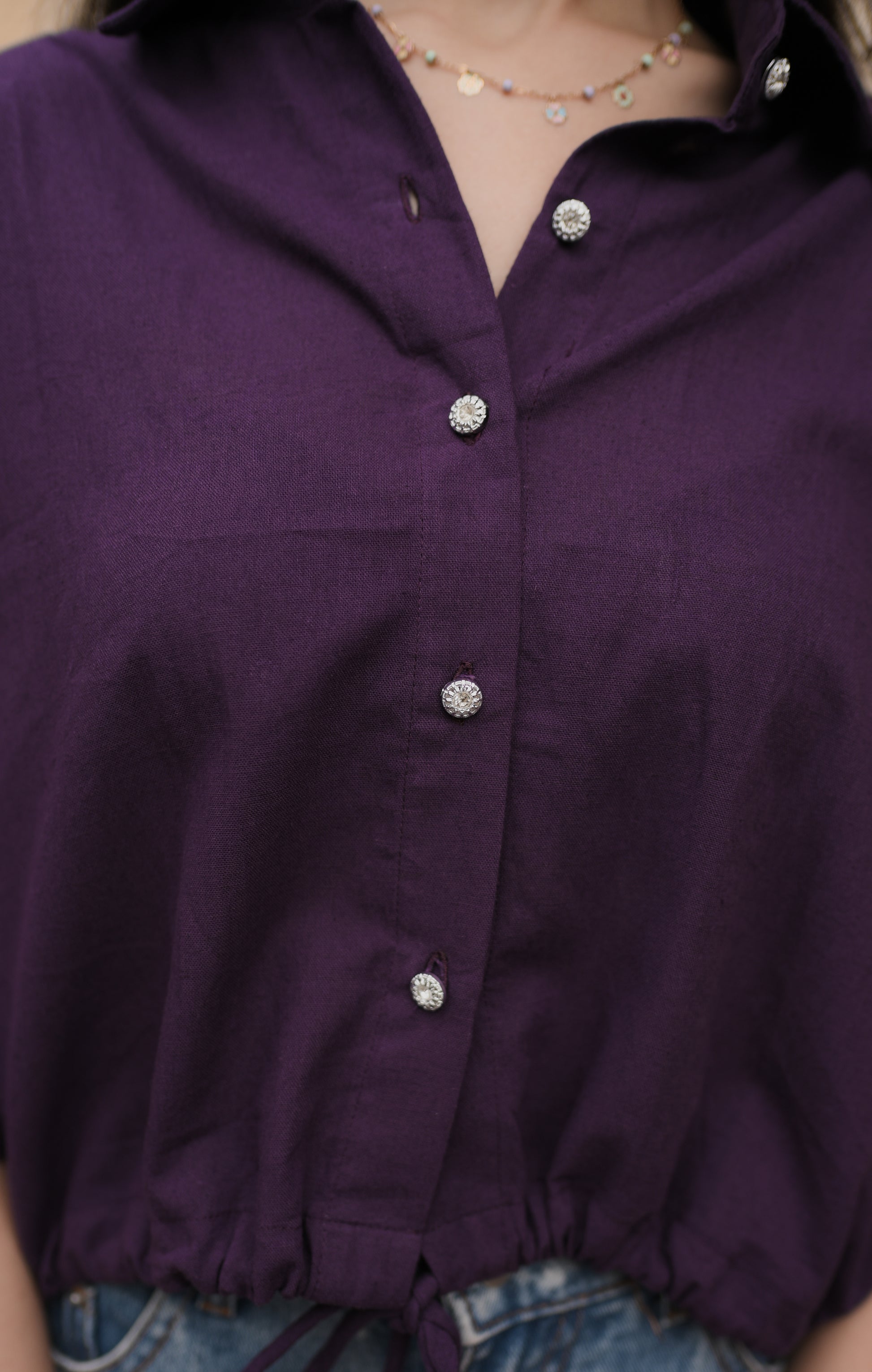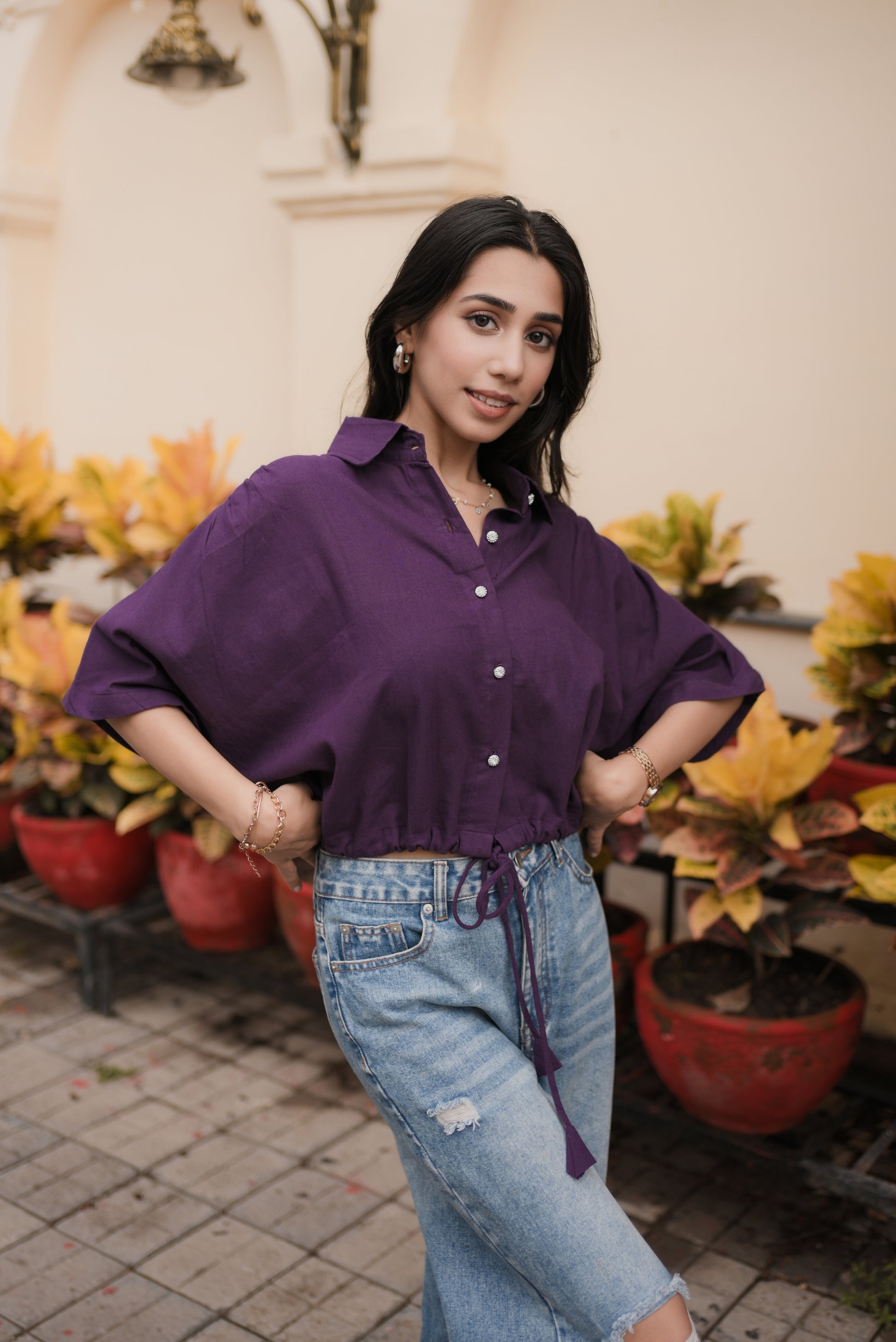 Bold yet effortlessly chic, the Plum Pop Cotton Drawstring Shirt features a rich plum hue, soft breathable cotton, and a relaxed drop-shoulder fit. With a button-down front and adjustable drawstring hem, it's perfect for layering or standout solo style.