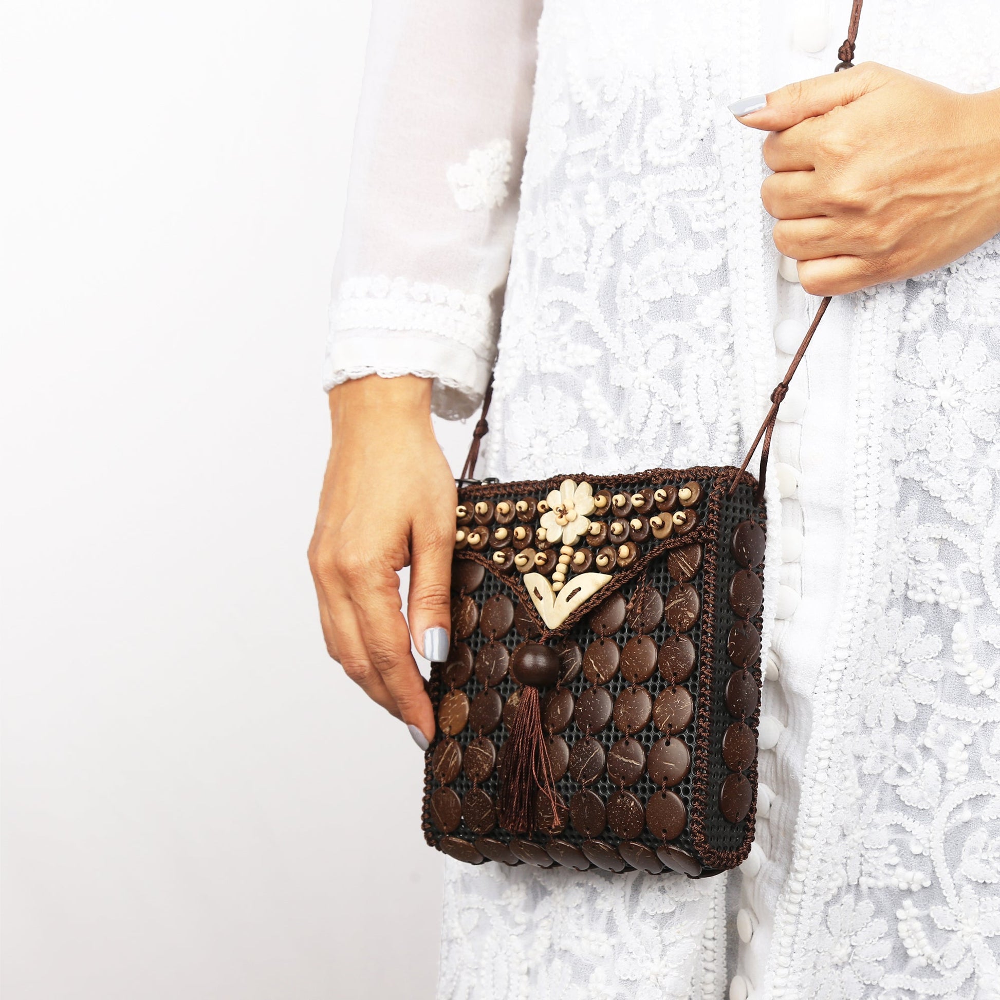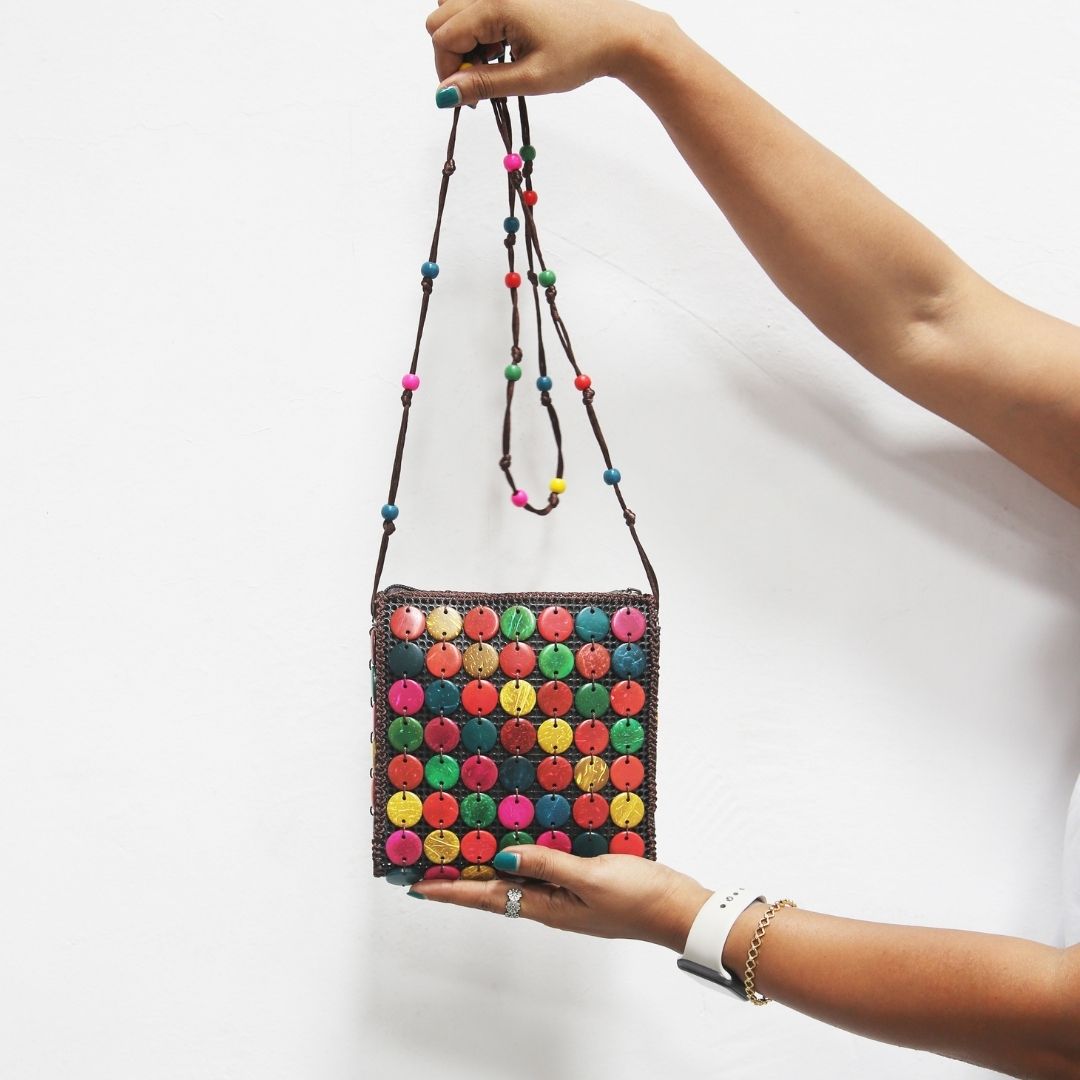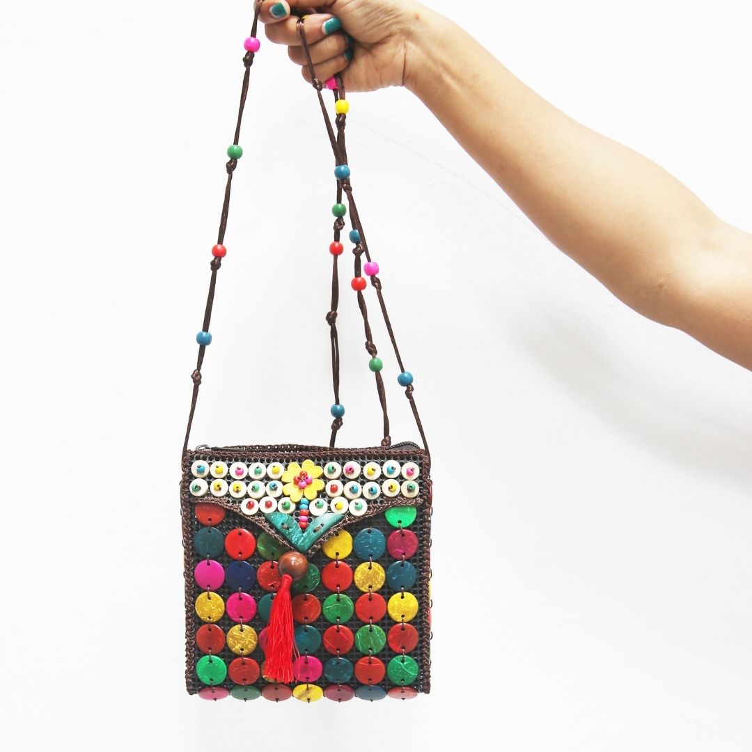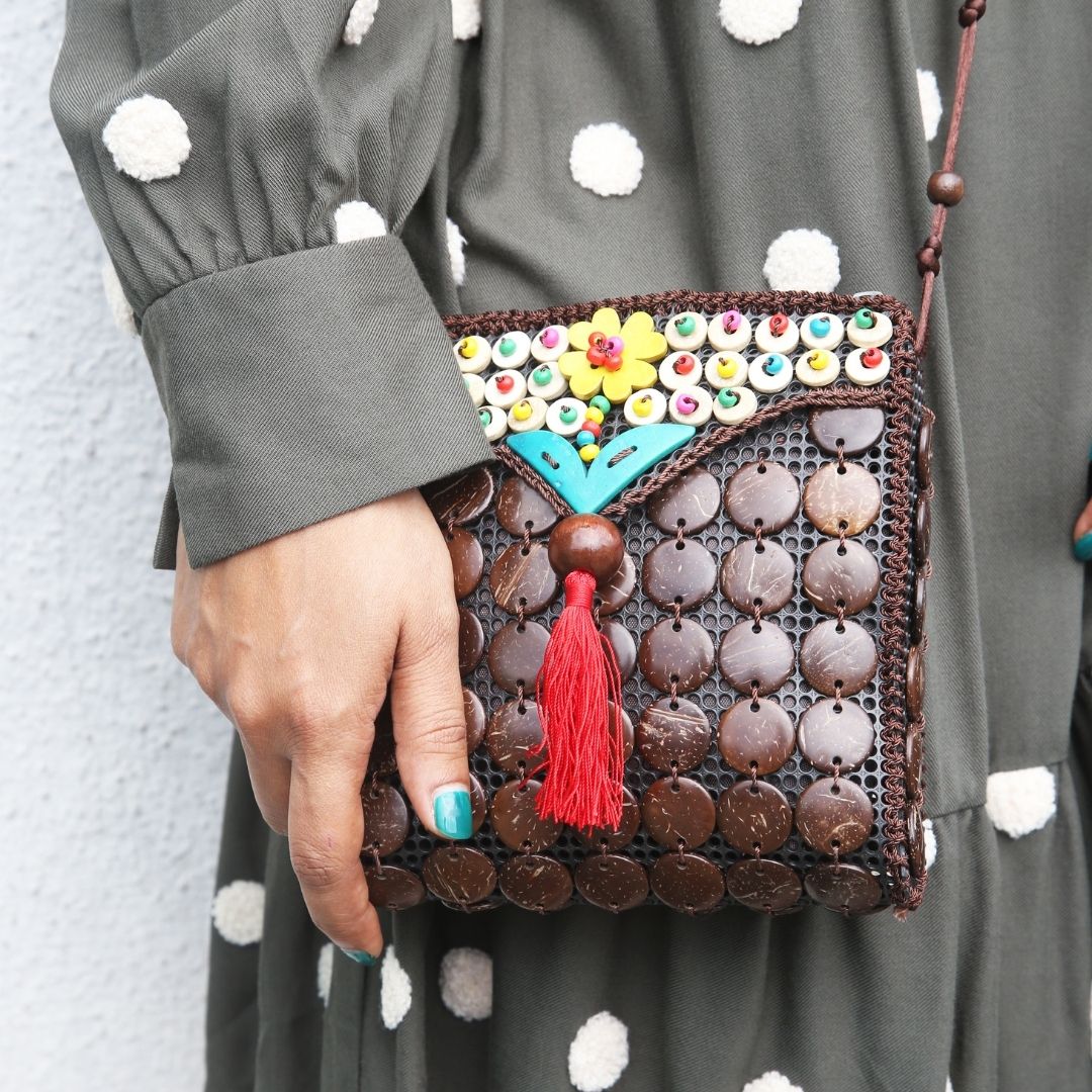 Real coconut shells handcrafted into floral motifs, buttons, discs and cubes with smooth, glowing finish in various colours is hand-stitched on recycled PU mesh