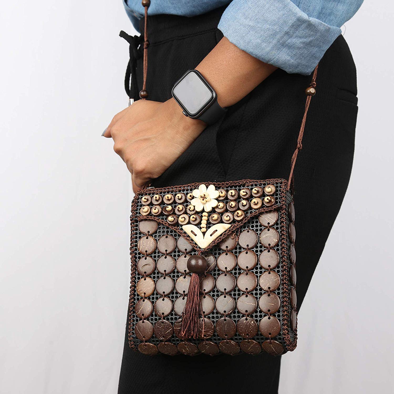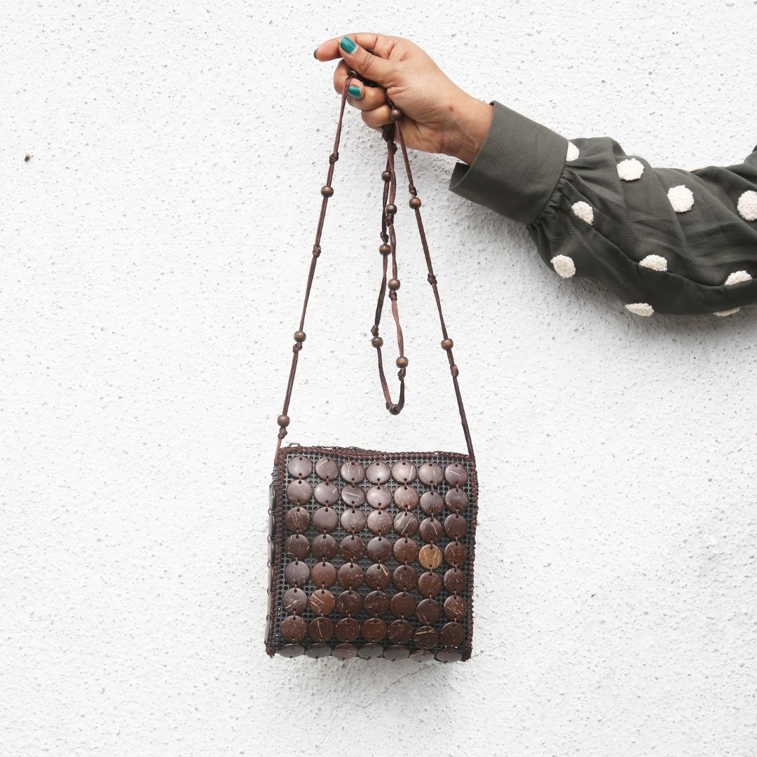 Materials: Outer surface: Coconut Shells on recycled PU surface, Inner lining: Recycled polyester, Zipper: Metal zip and chain, Strap: Easy tie adjustable strap