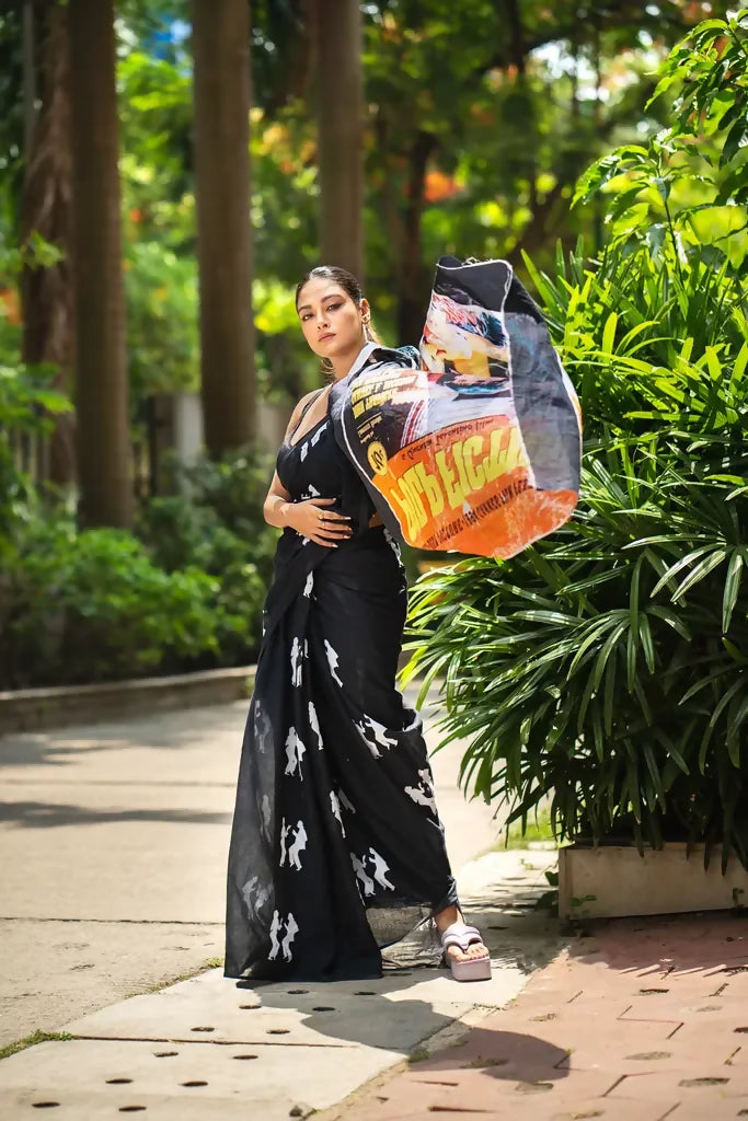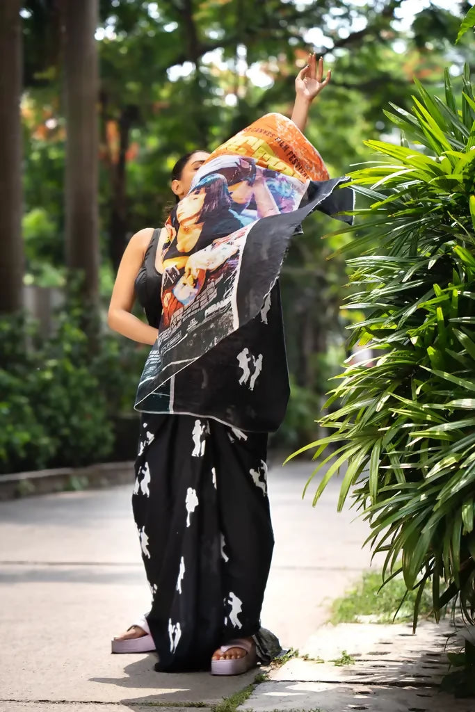 It is a Pulp Fiction saree guys! Inspired from the legendary Quentin Tarantino's cult classic. A unique one with a classy look! The film's poster is printed on the pallu and small figurines of Mia and Vincent dancing are printed all over the body.
