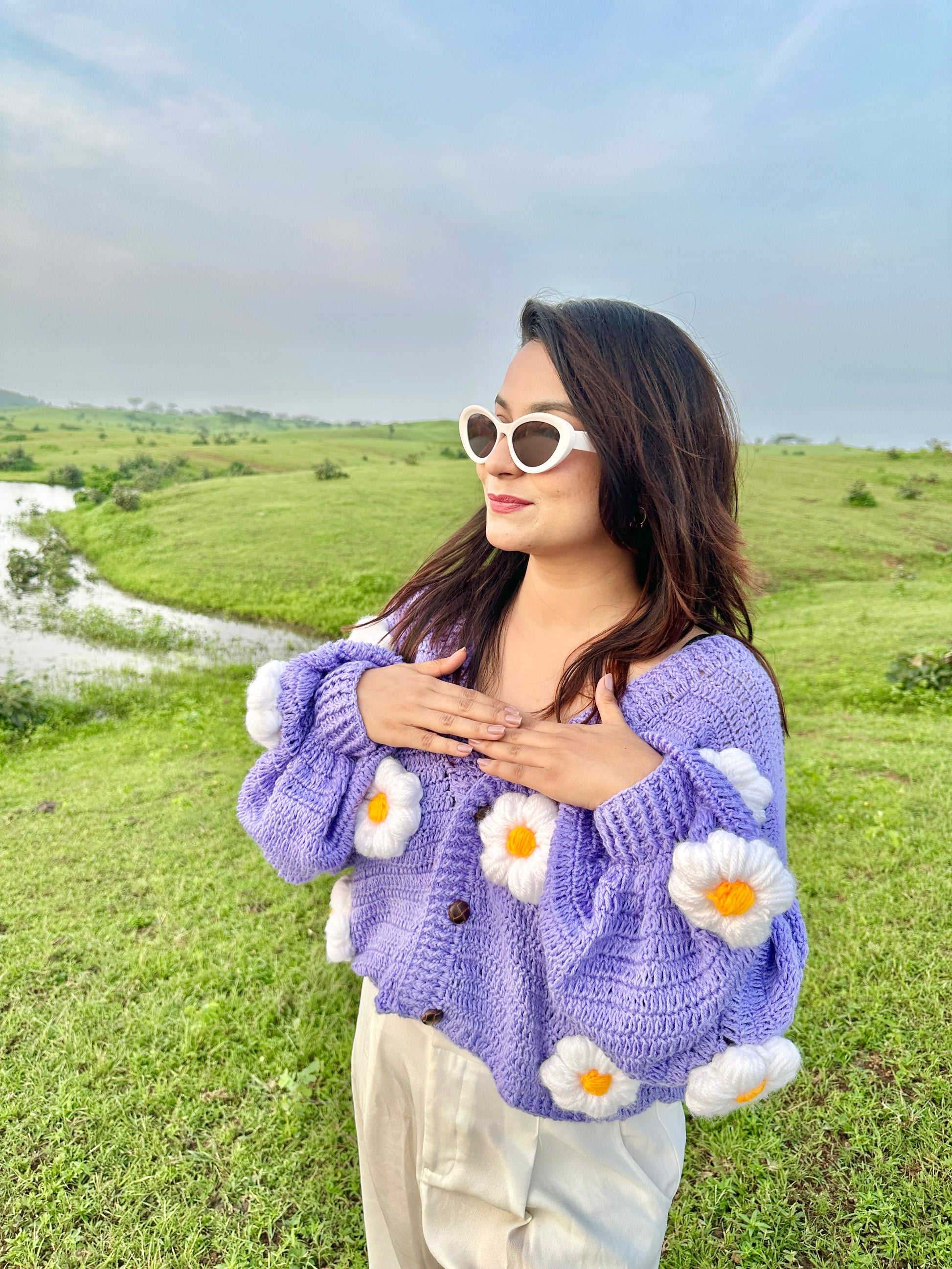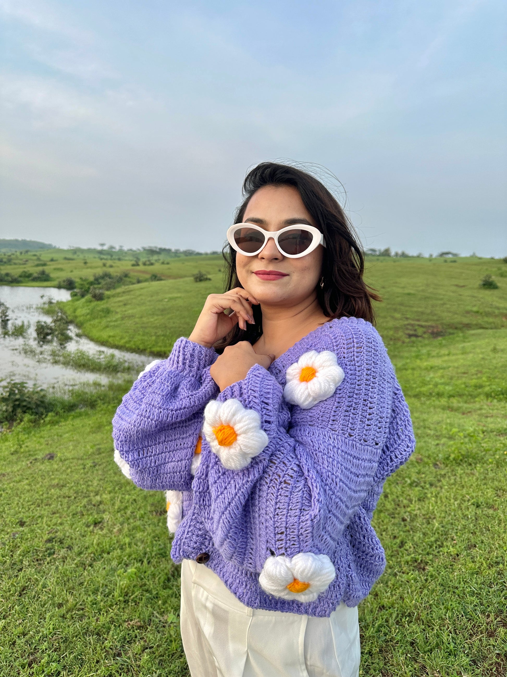 Stay cozy and stylish with our Daisy Cardigan! This beautiful cardigan is handcrafted with care, making each piece unique. The soft purple color adds a lovely touch to any outfit, and the comfortable, warm fabric is perfect for cooler days.