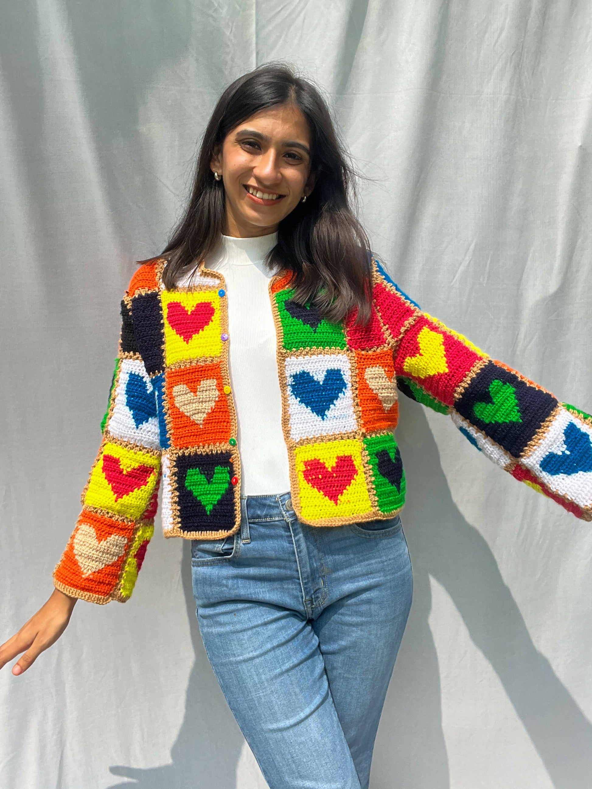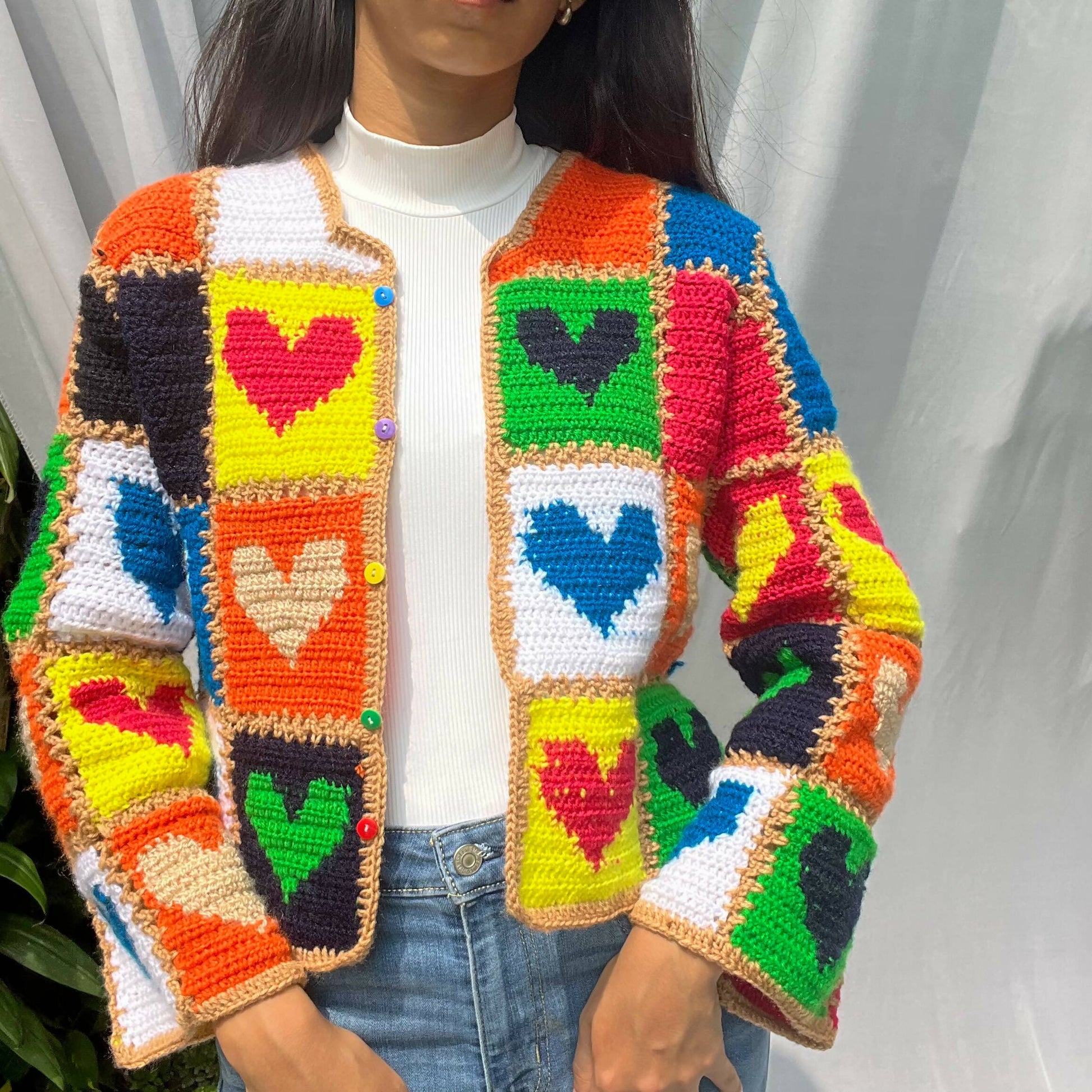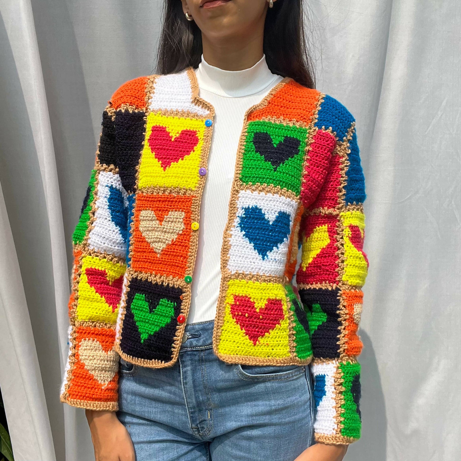 Made with 100% acrylic yarn. Patches of hearts crocheted and then stitched together piece by piece.Also inspired by the famous cardigan alia bhatt wore.