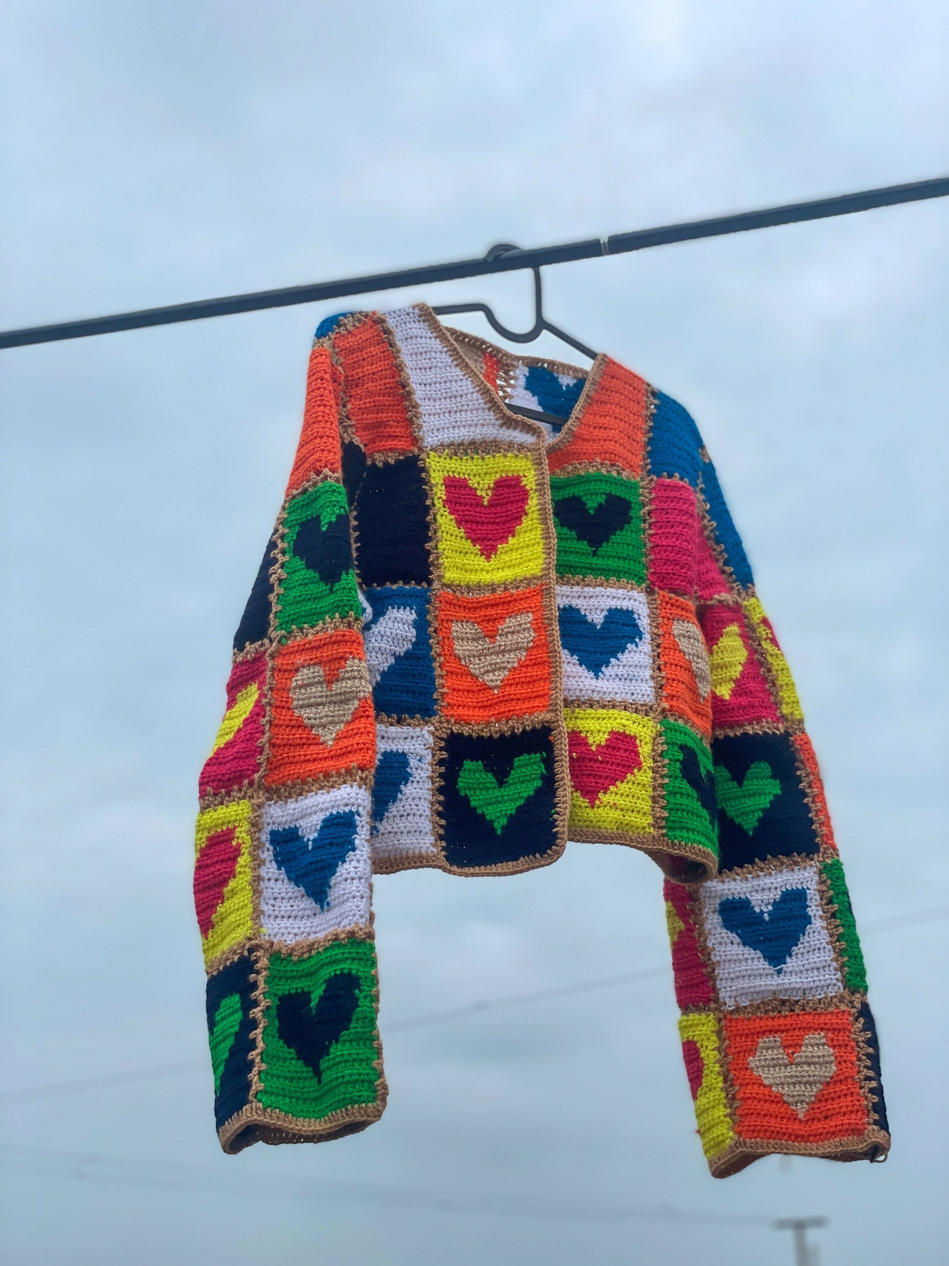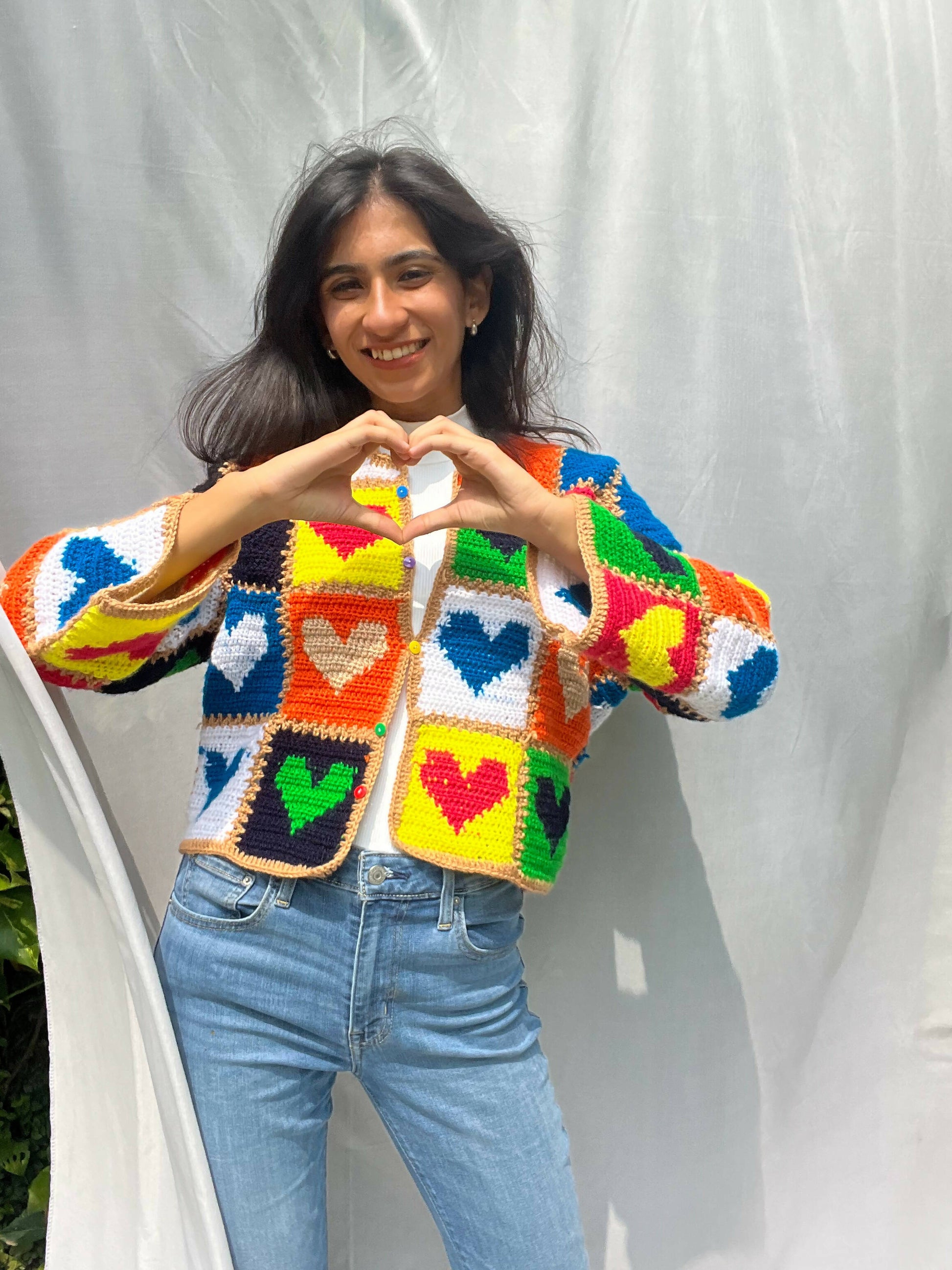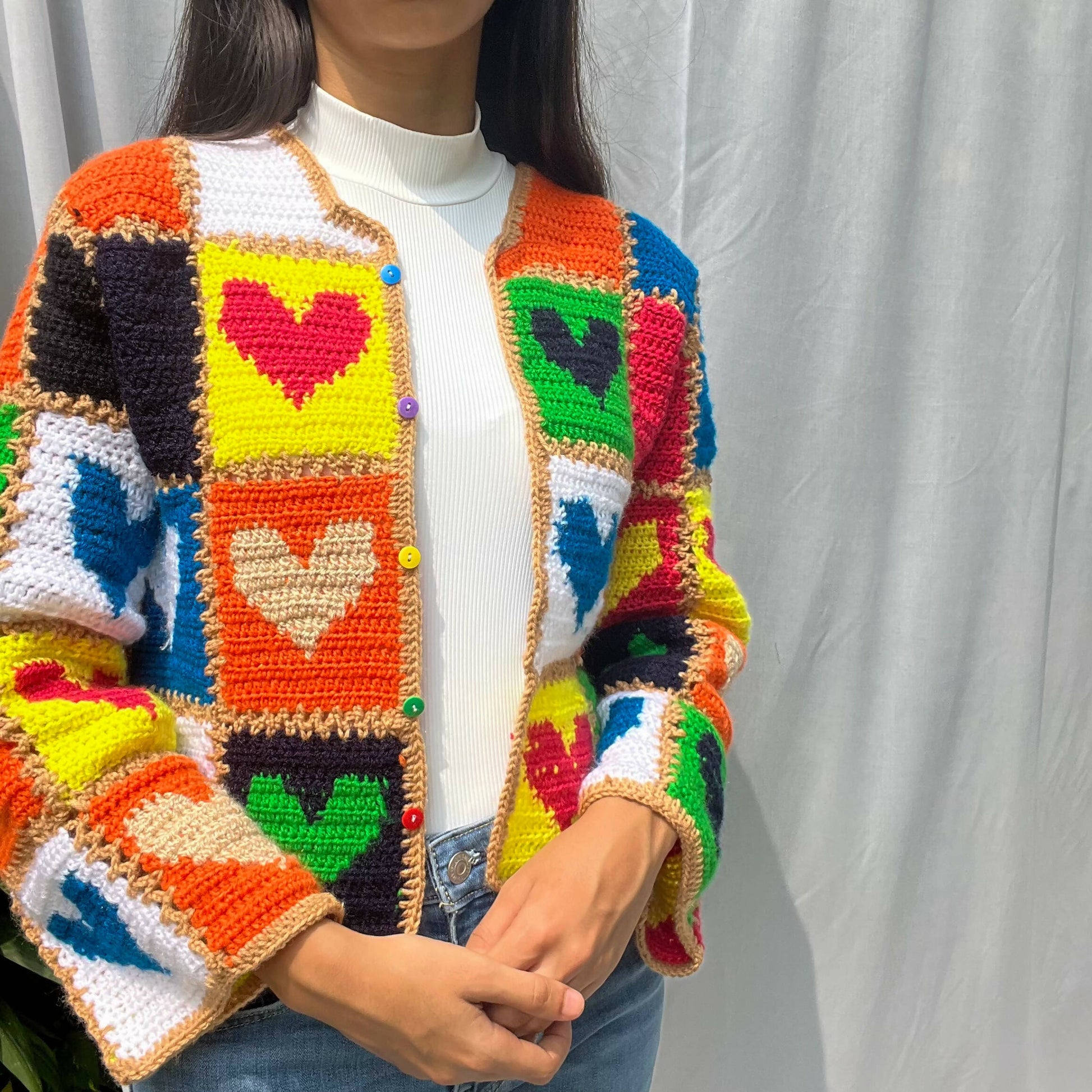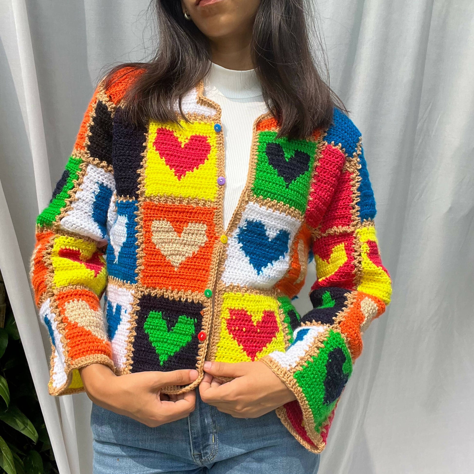 Made with 100% acrylic yarn. Patches of hearts crocheted and then stitched together piece by piece.Also inspired by the famous cardigan alia bhatt wore.