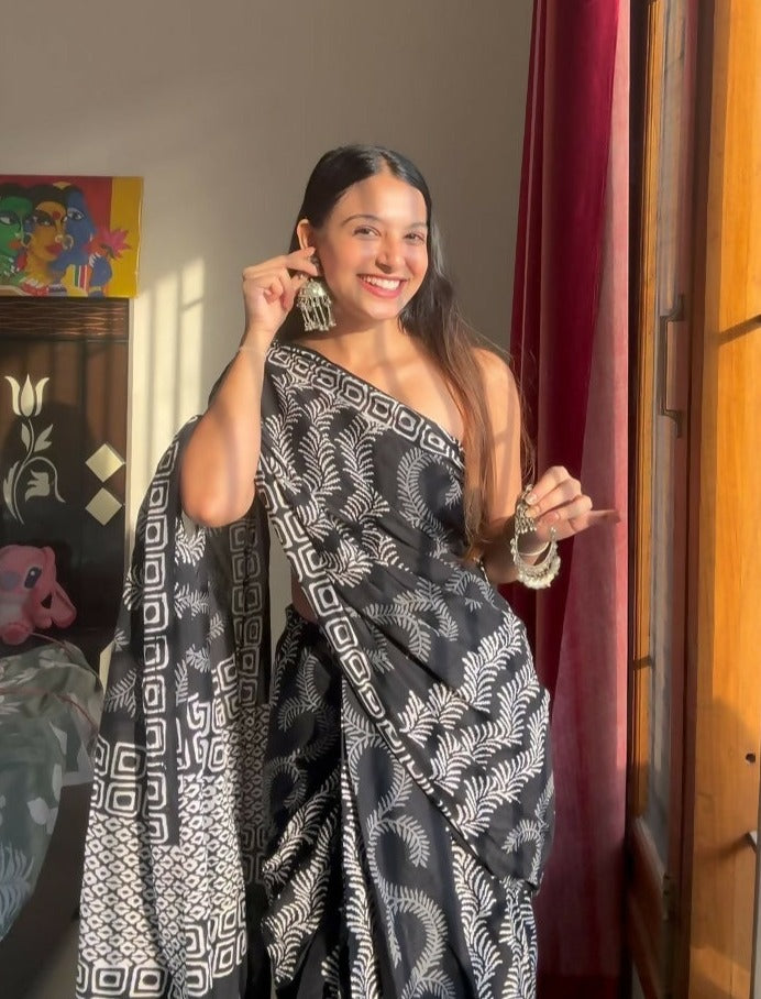 Ready to wear hassle-free handblock printed saree that can be worn within 30 seconds without any help. The saree comes with lining and has a hidden pocket attached to provide functionality and comfort.