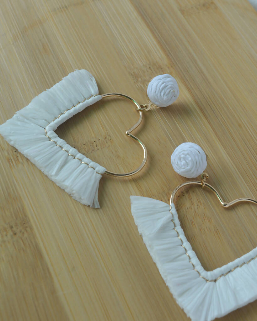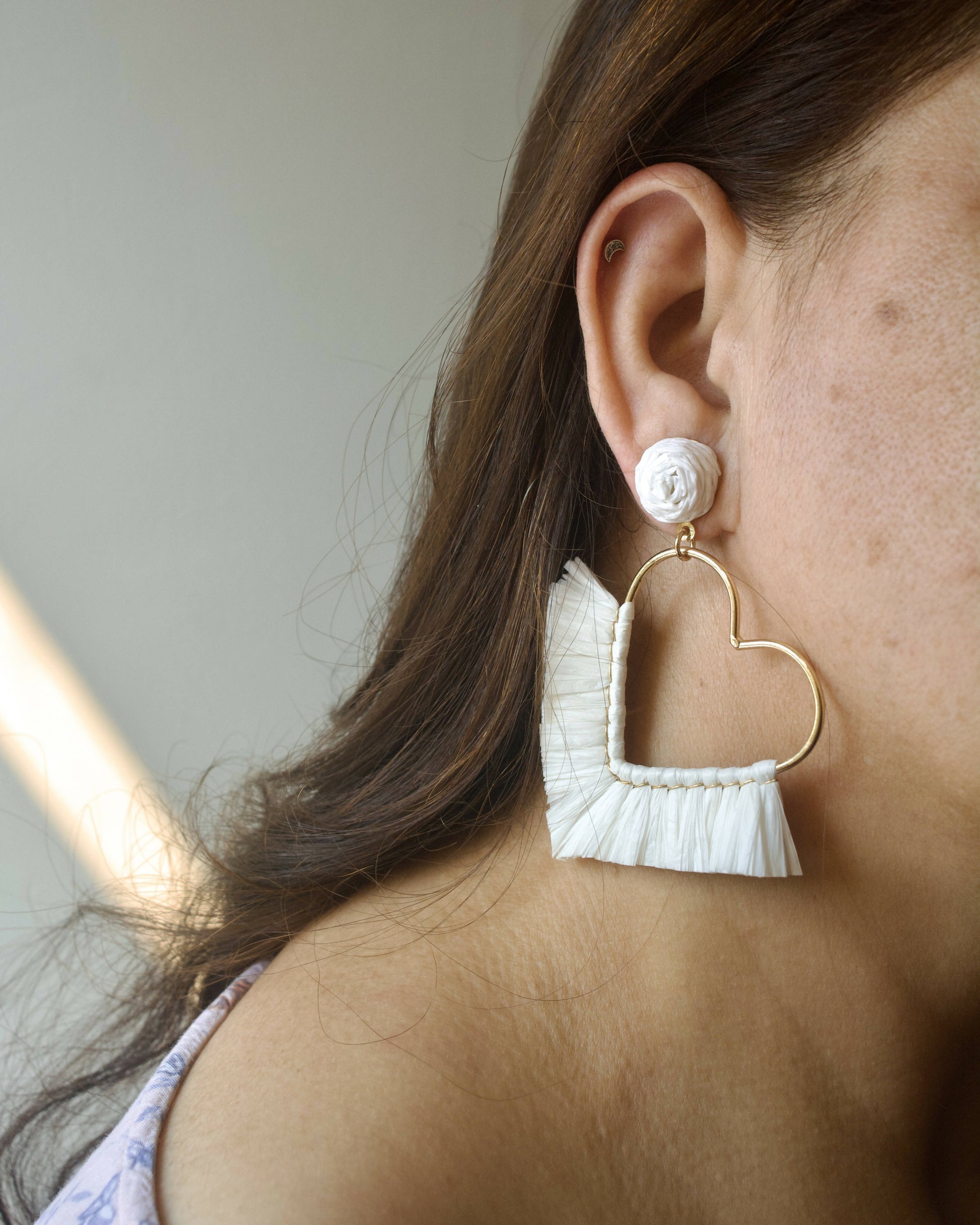 The Raffia Heart earrings are perfect statement pieces. These earrings are metal plated and made with raffia yarn. These are the perfect pair of statement ivory earrings that can elevate the plainest of outfits.