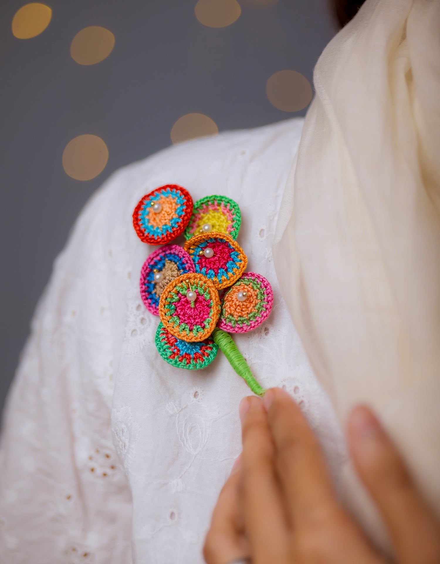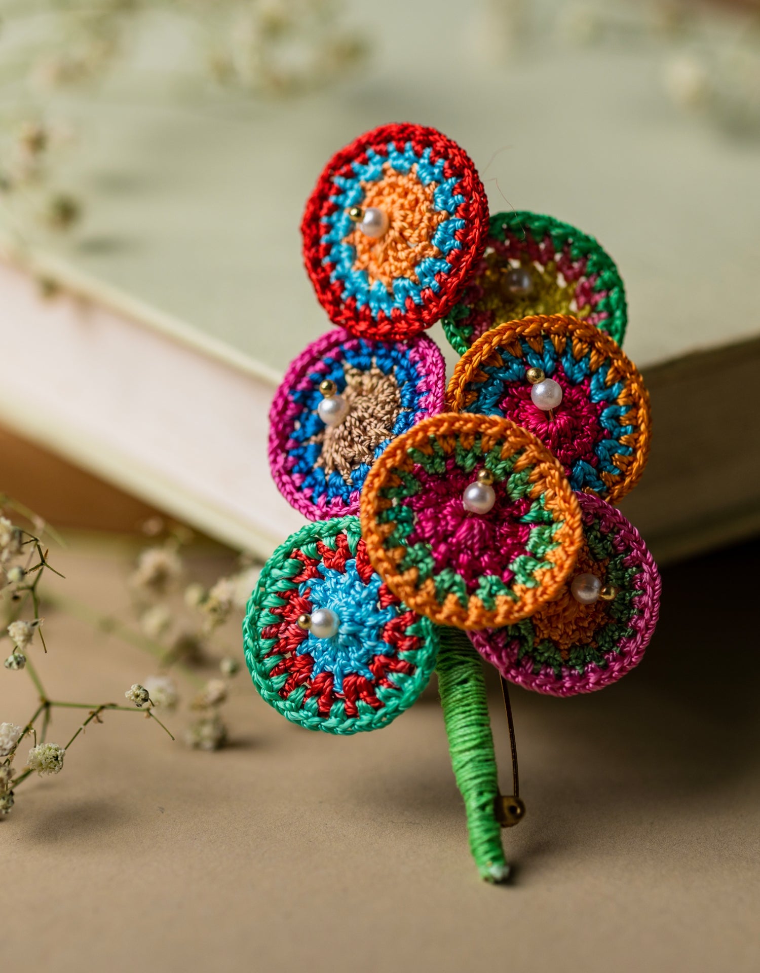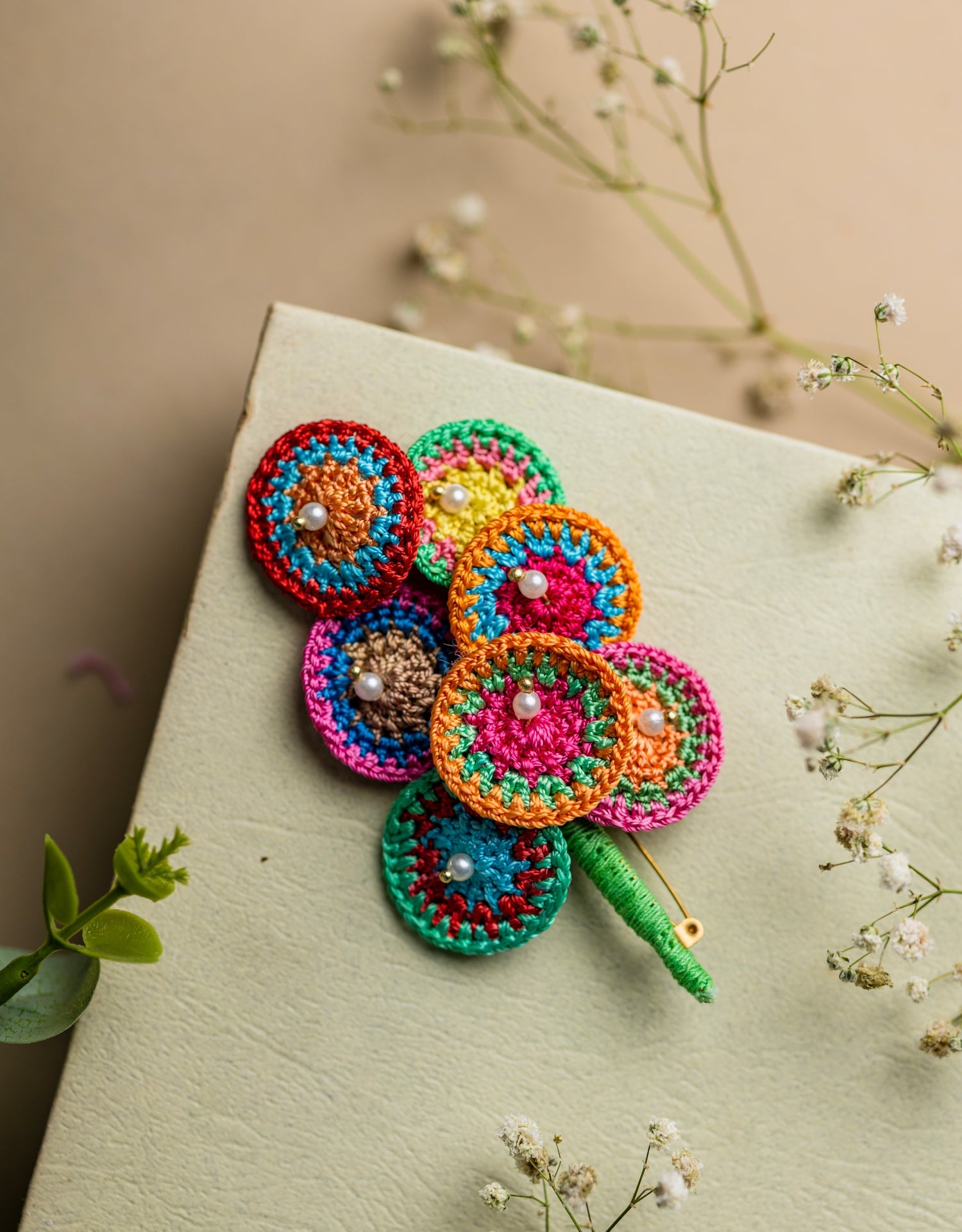 Materials: Viscose thread, Cotton thread, Pearl beads, Brass, Brooch pin