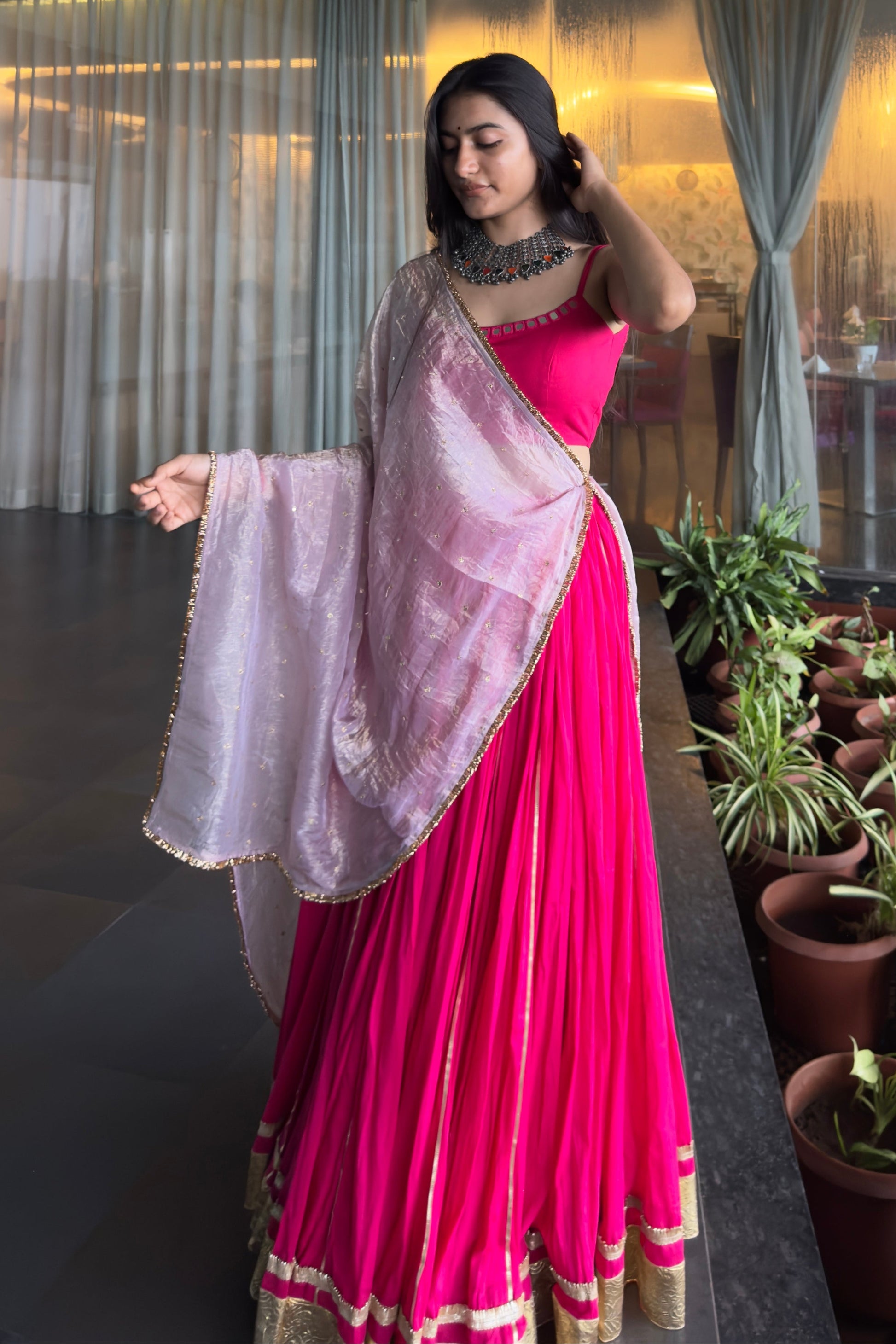 This shimmer lehenga shines with intricate mirror work and golden lace adding glamour to your outfit. With its comfortable fabric and elegant design, it's perfect for any celebration or gathering, making you stand out beautifully.