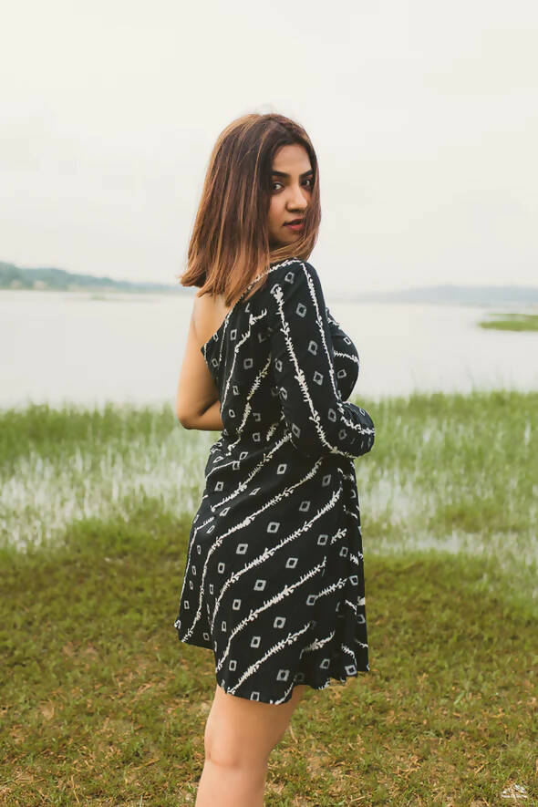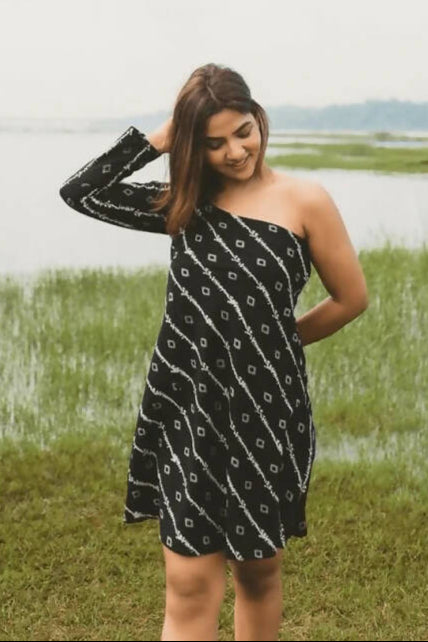 This is what a sleek style made with expertise looks like. It is a hand block printed one shoulder dress with a semi flare below the bodice.
