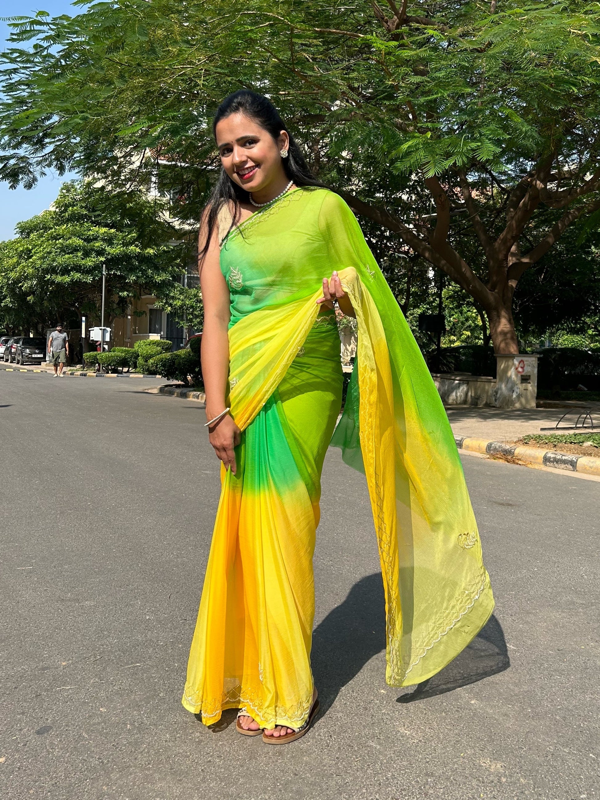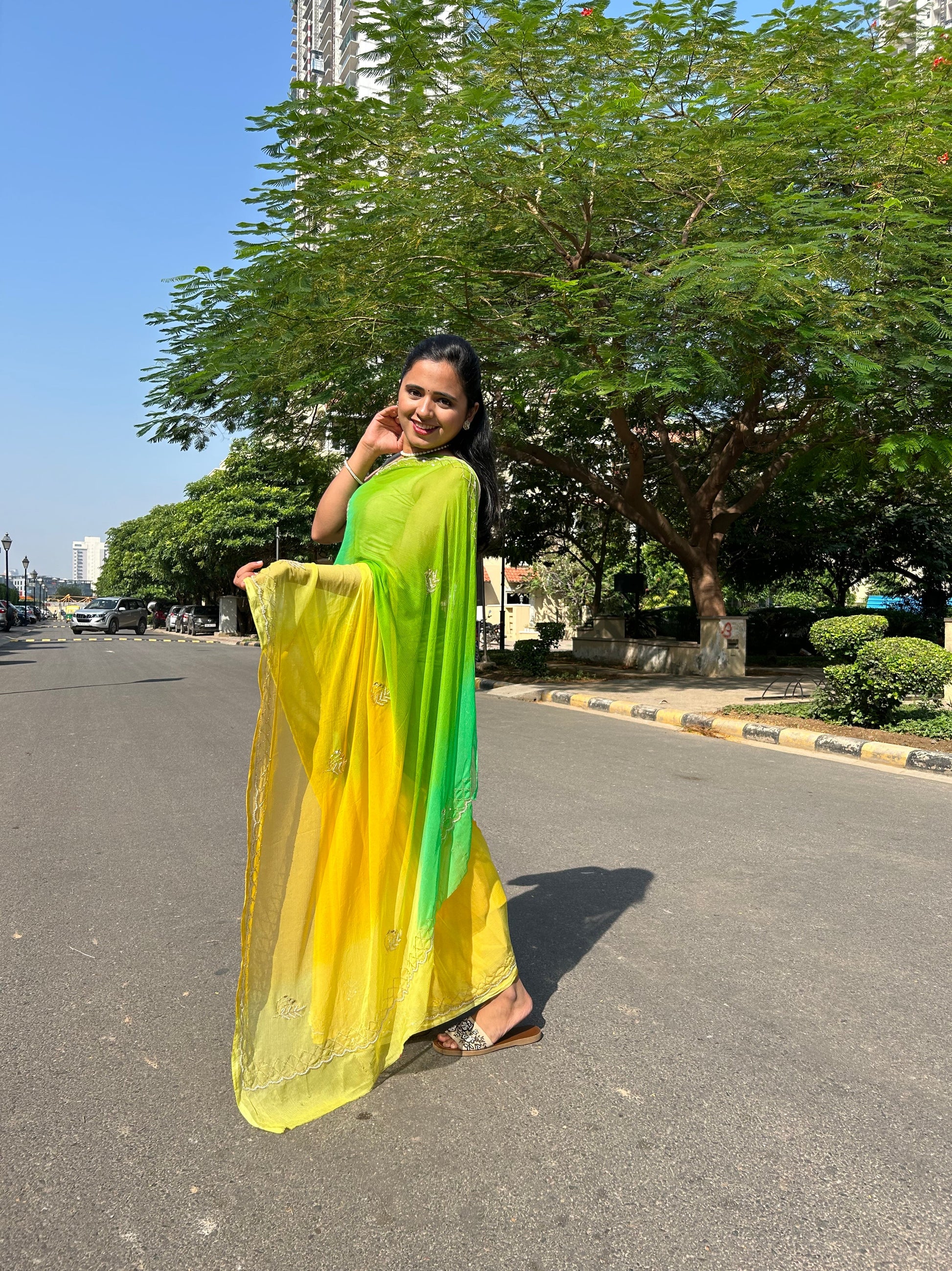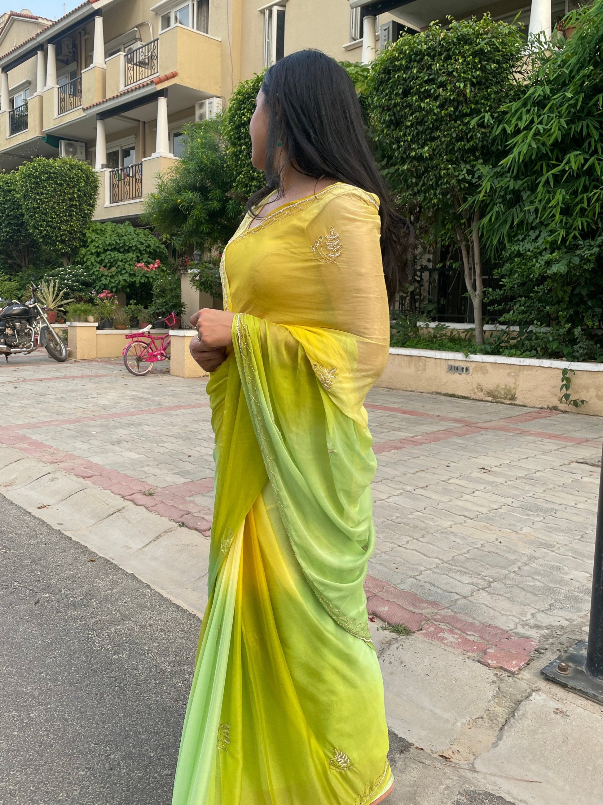 This Rani chiffon saree features a stunning ombre effect with rich, contrasting hues. Hand-embroidered motifs enhance its elegance, while the soft, flowing fabric drapes gracefully, flattering your figure. Paired with a matching blouse piece, complete with intricate embroidery on the sleeves.