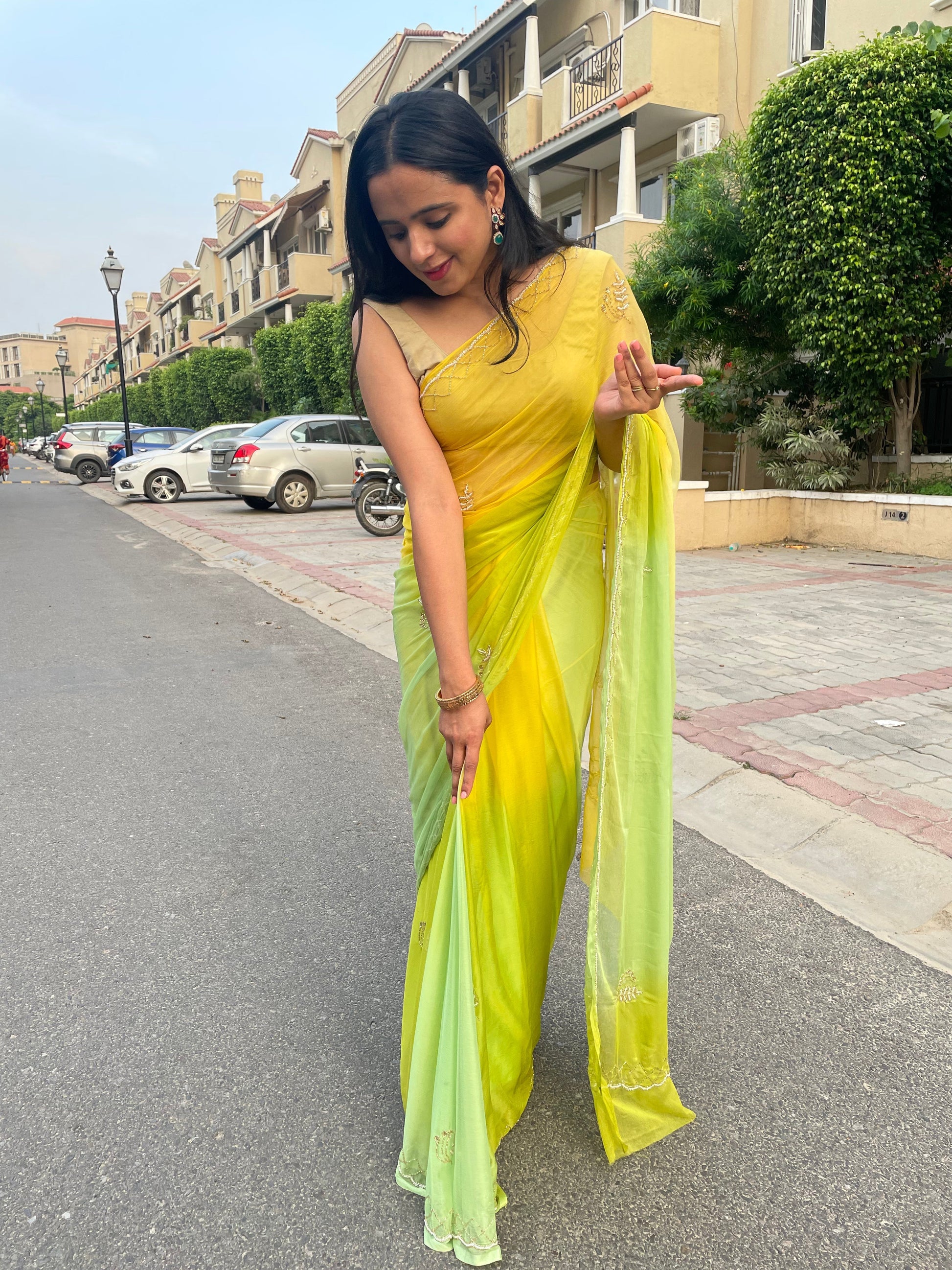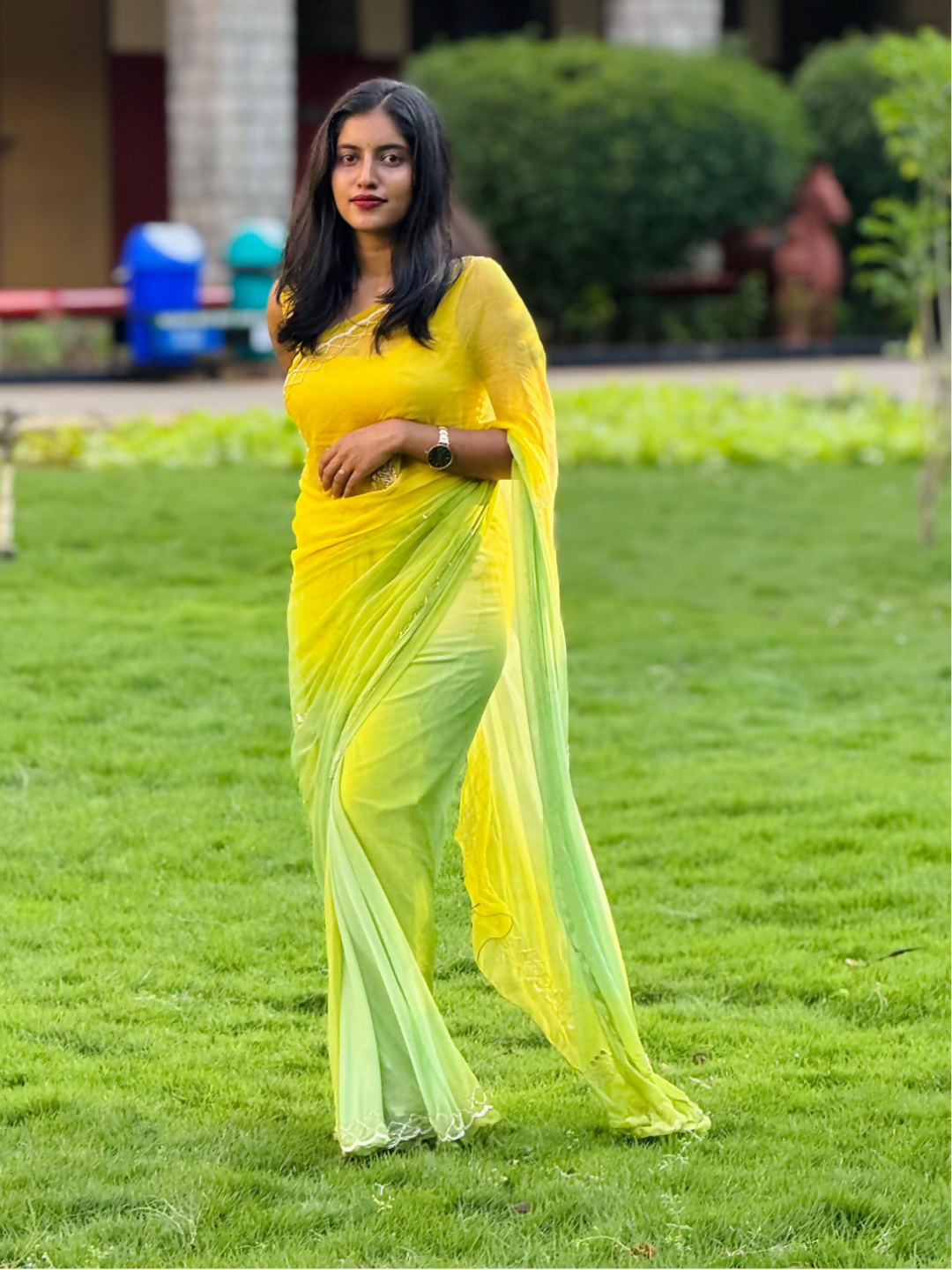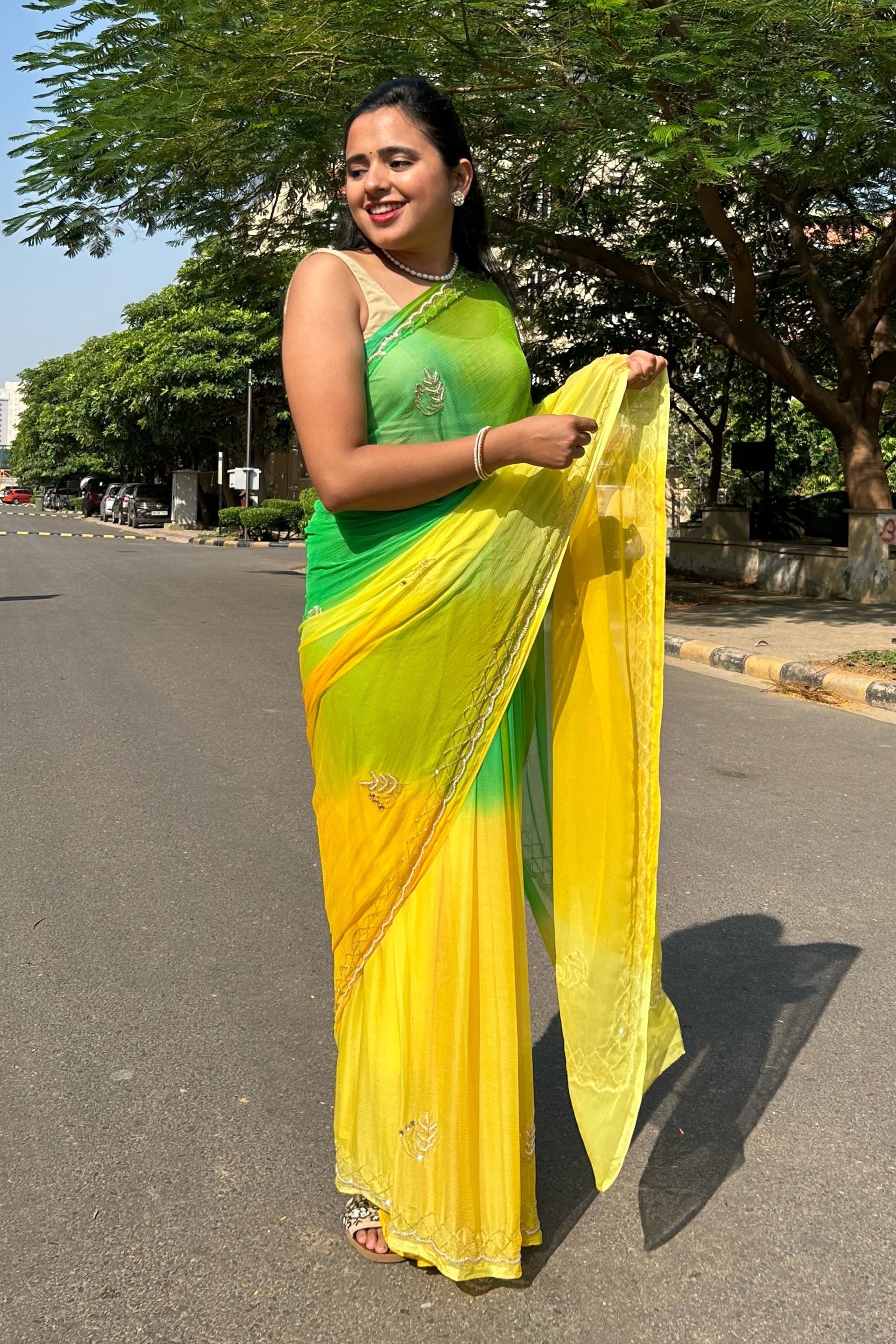 This Rani chiffon saree features a stunning ombre effect with rich, contrasting hues. Hand-embroidered motifs enhance its elegance, while the soft, flowing fabric drapes gracefully, flattering your figure. Paired with a matching blouse piece, complete with intricate embroidery on the sleeves.