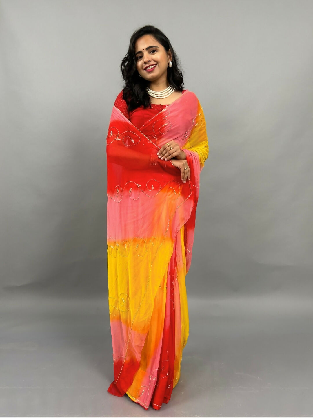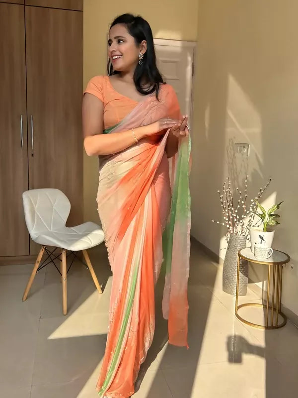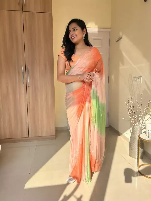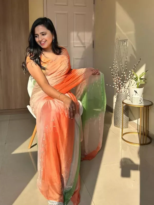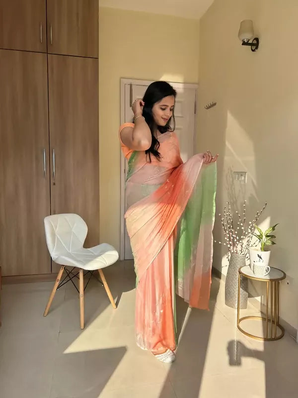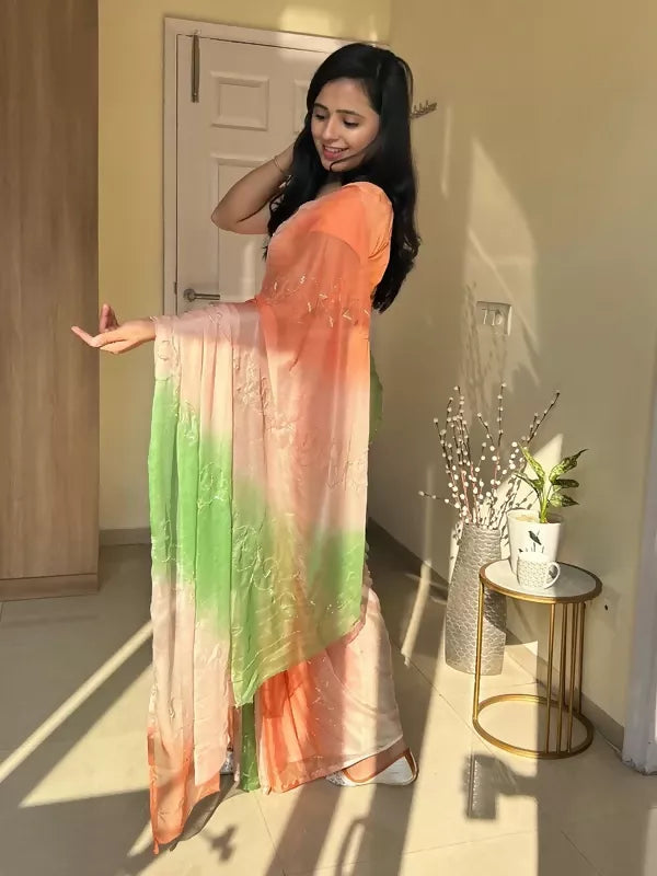 Rani Tri Color Chiffon Pre Pleated Saree