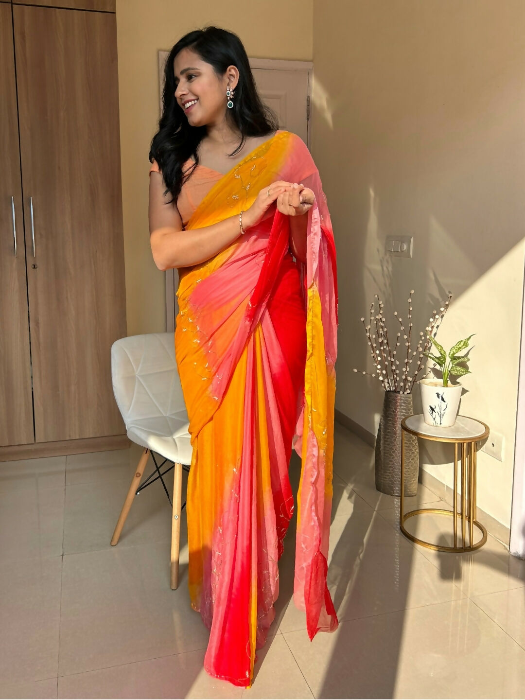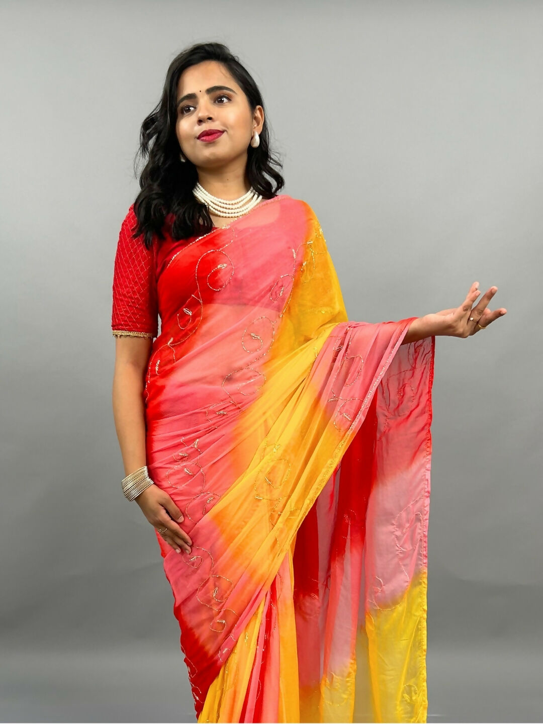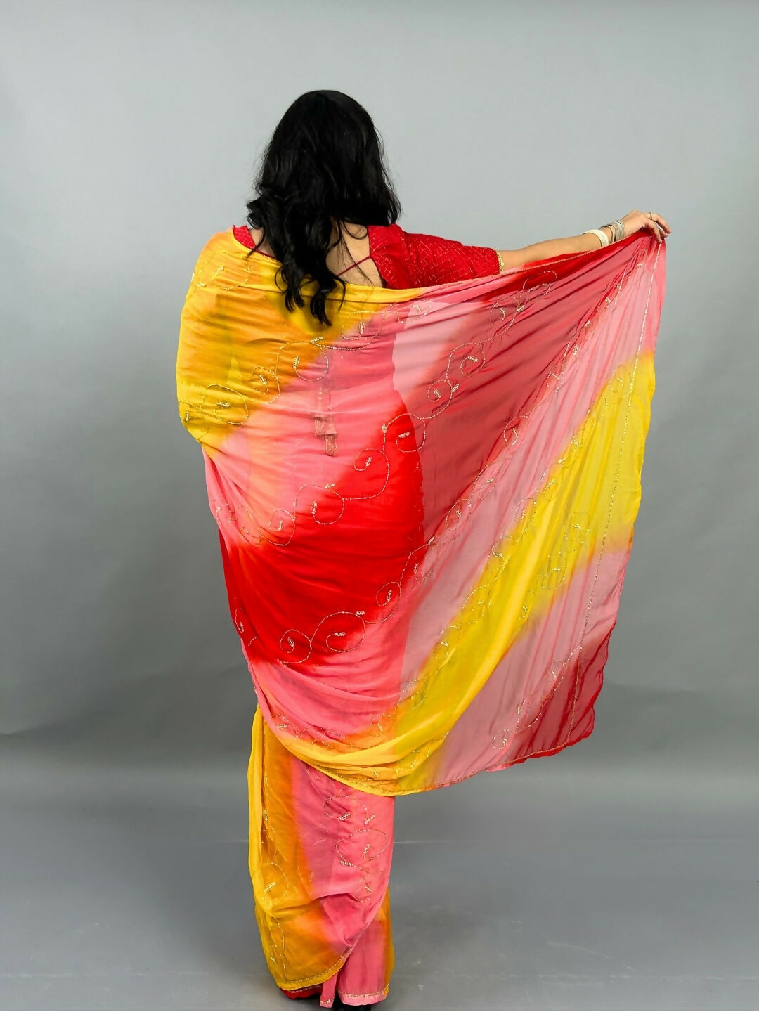 Rani Tri Color Chiffon Pre Pleated Saree