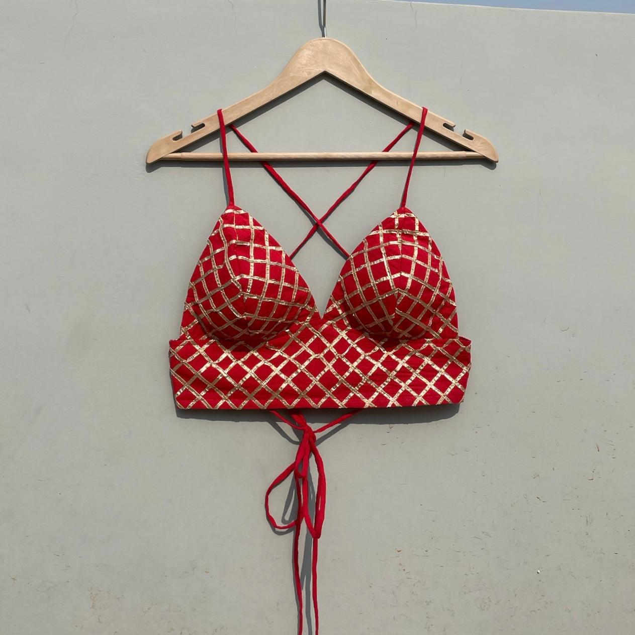 The Red Checks Gotta Gujarati Embroidery Bralette is a vibrant fusion of traditional craftsmanship and modern design. Featuring a bold red checkered pattern, this top is adorned with intricate Gotta Patti Gujarati embroidery, adding a touch of rich heritage. The bralette-style silhouette is both flattering and comfortable, perfect for pairing with high-waisted pants or skirts.
