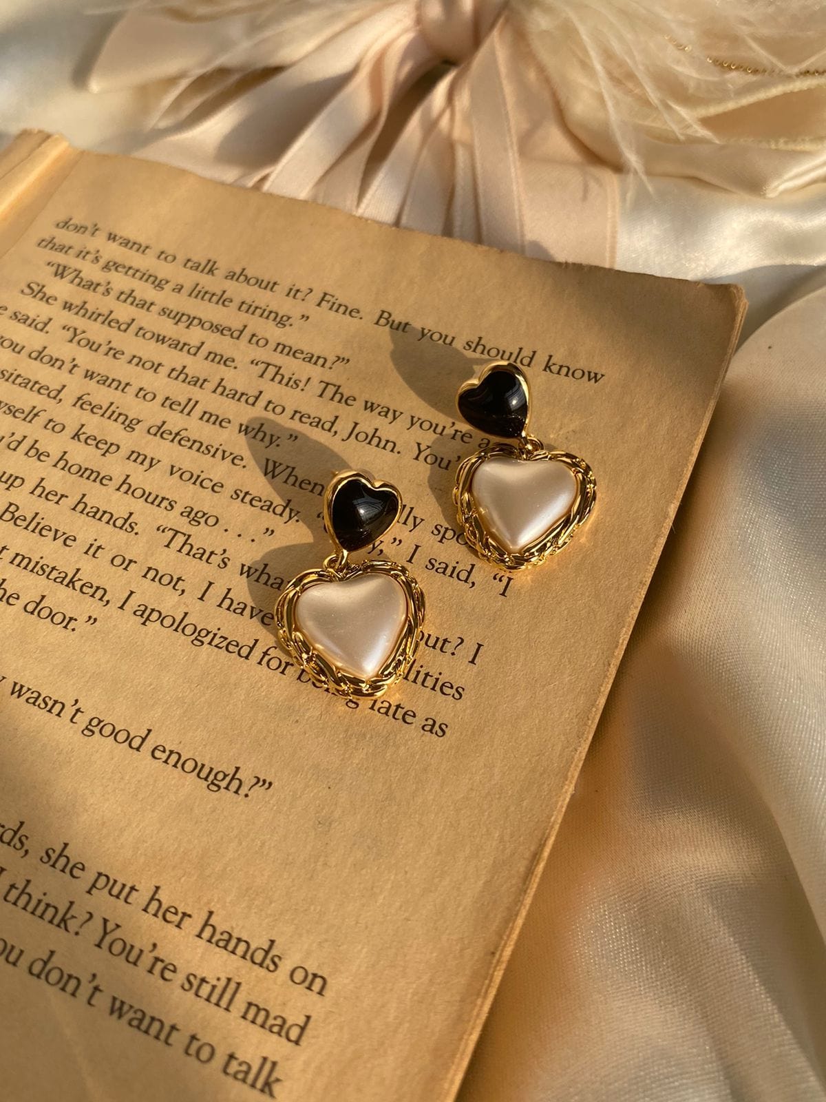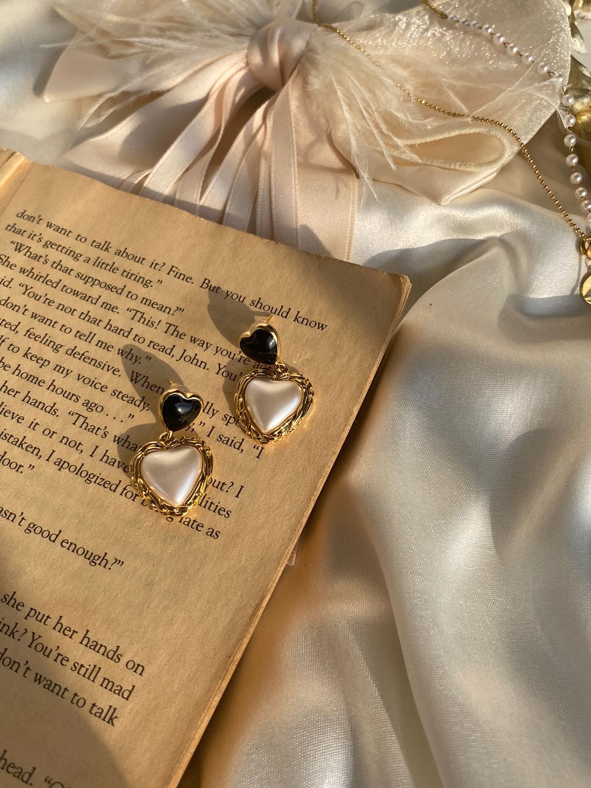 A regal blend of romance and mystique. Featuring luminous pearls nestled in heart-shaped elegance, these earrings capture the enchanting glow of twilight, making every moment feel magical.