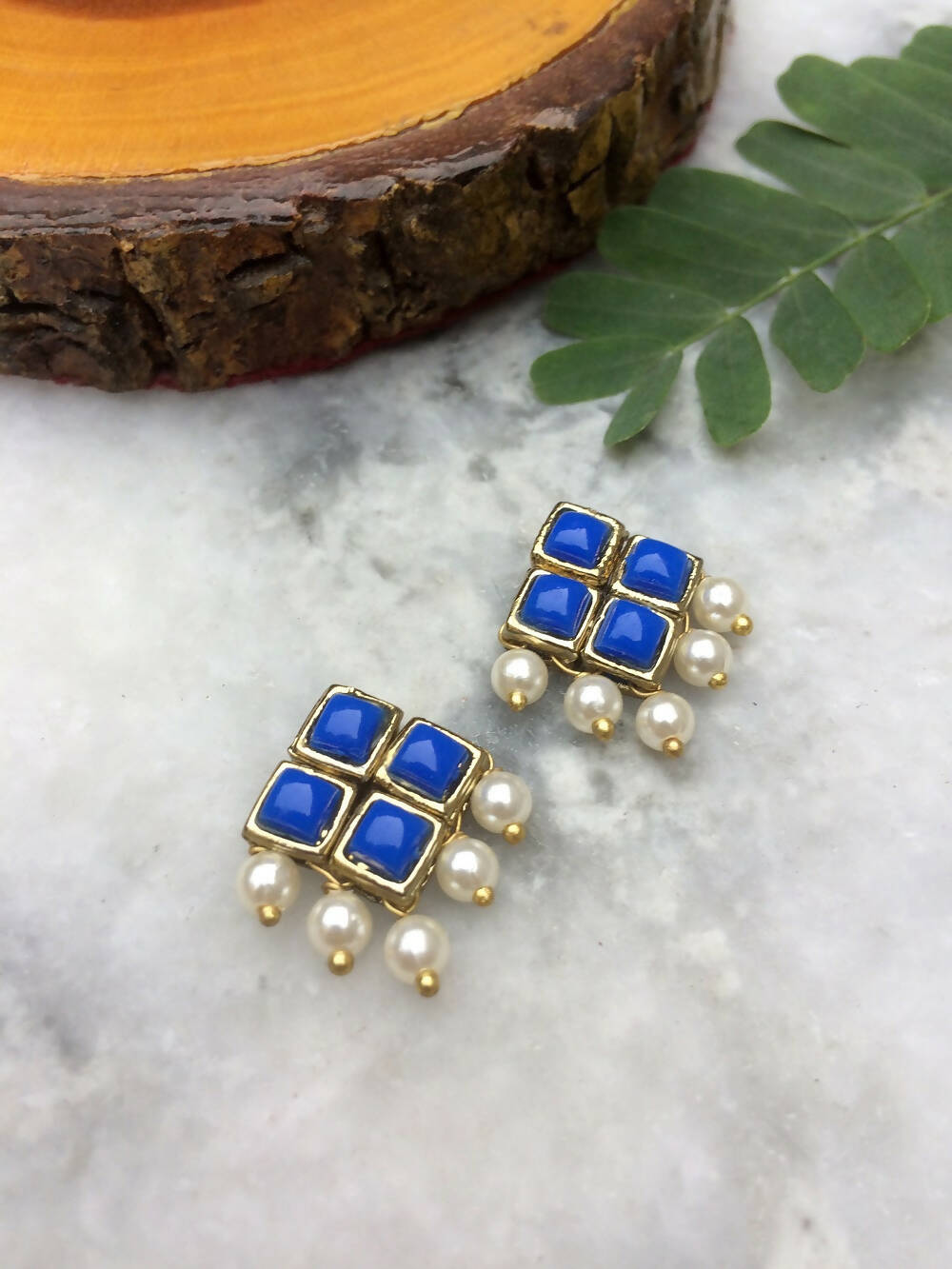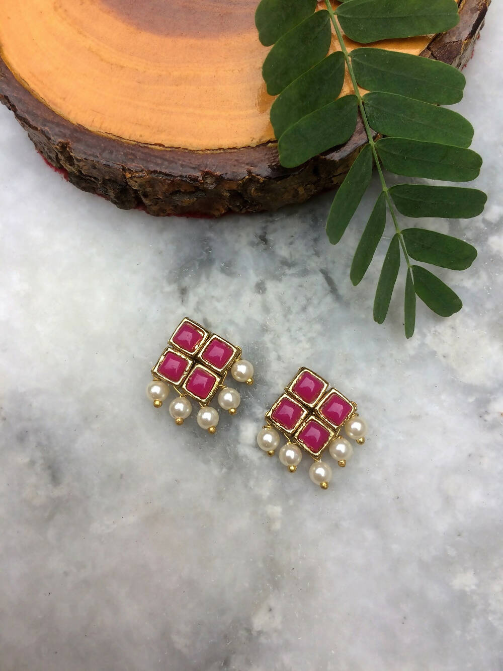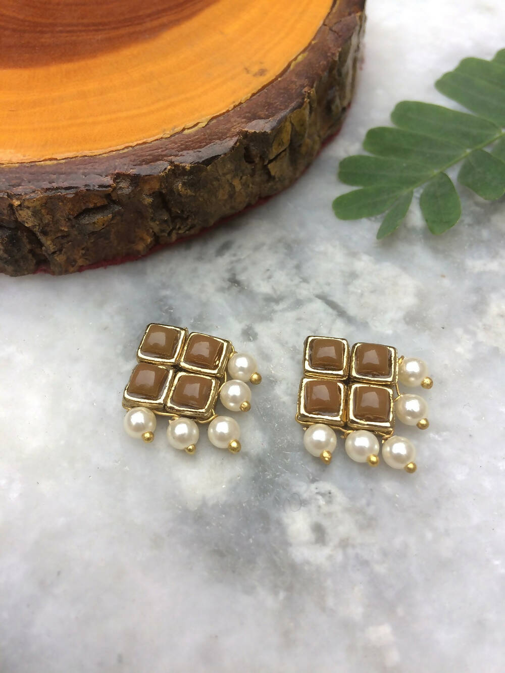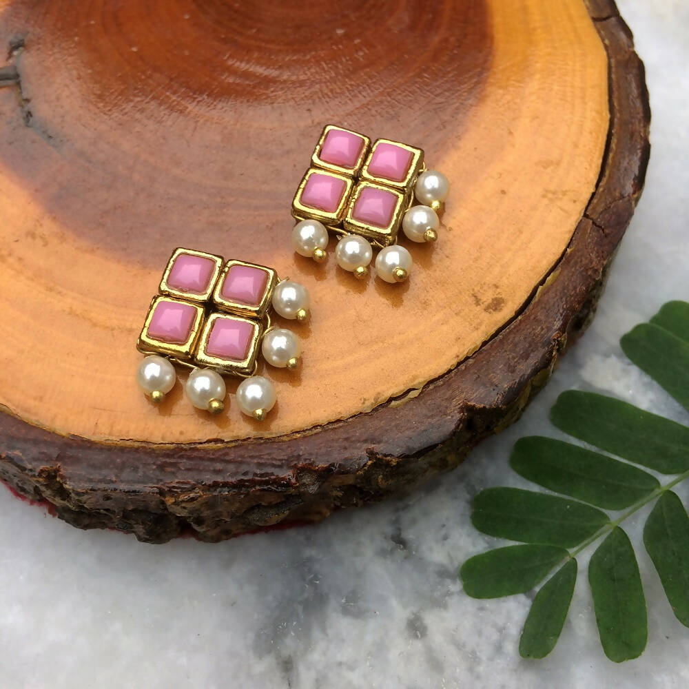 Add a touch of elegance to your everyday style with our resin stone and pearl stud earrings! Little pearls dangle playfully from four connected resin stones.