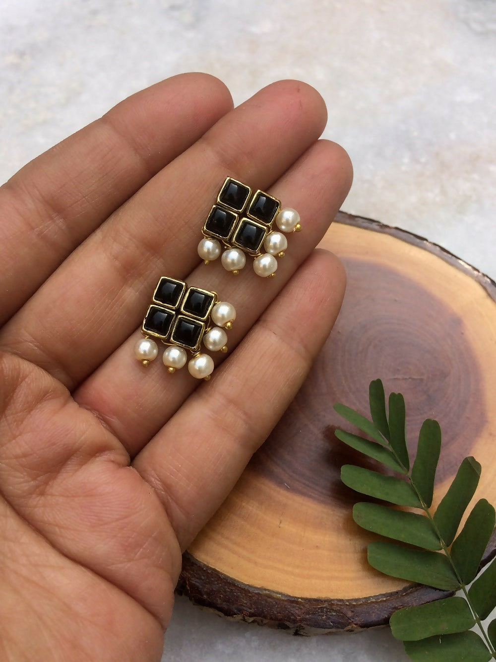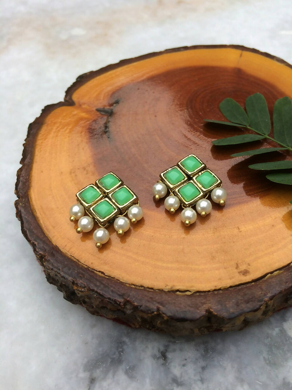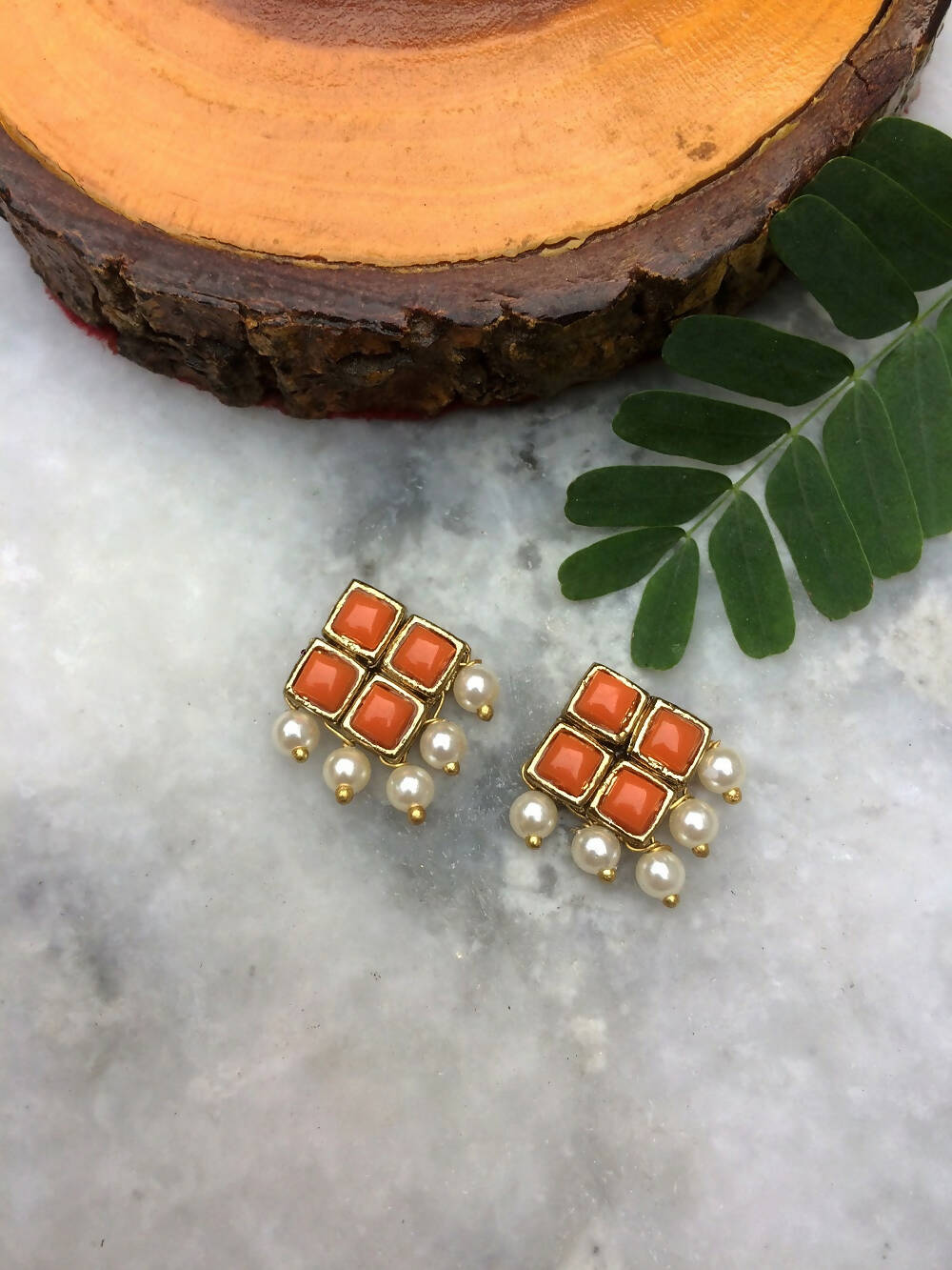 Add a touch of elegance to your everyday style with our resin stone and pearl stud earrings! Little pearls dangle playfully from four connected resin stones.