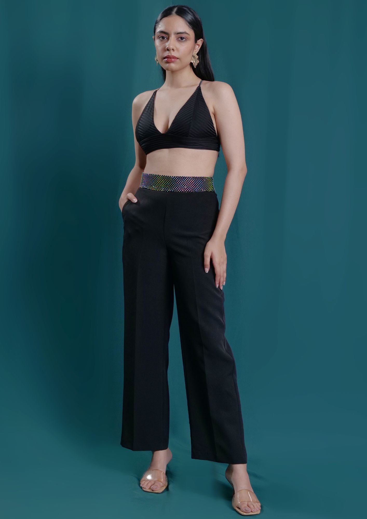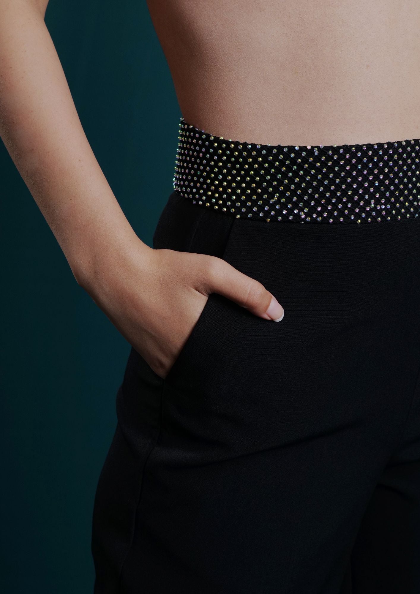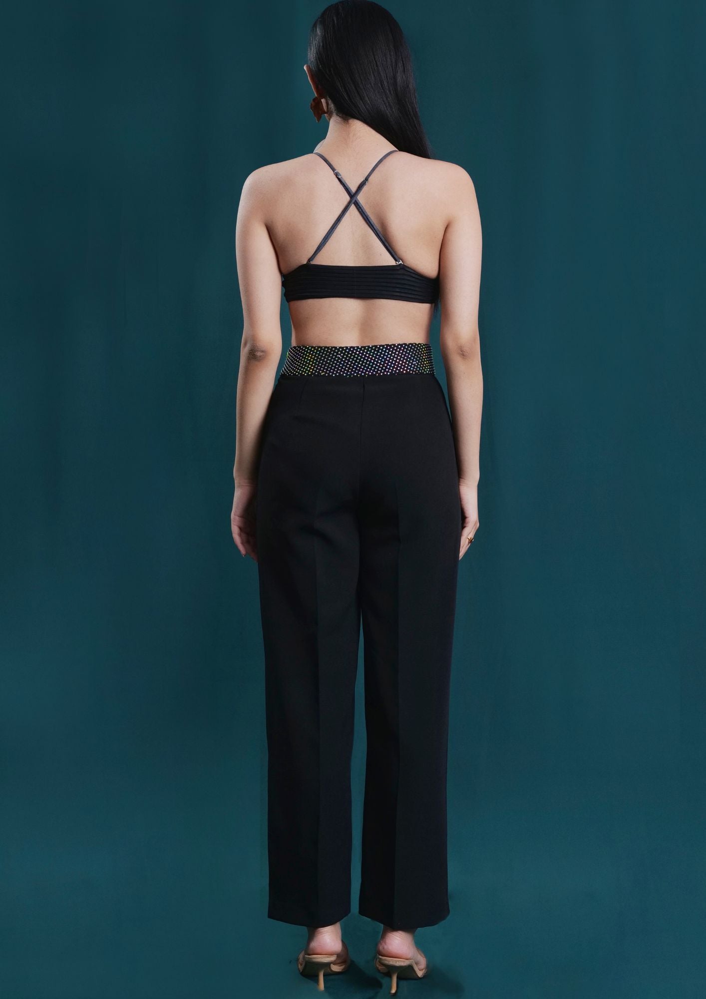 High waist straight trousers featuring rhinestone belt, cross pocket and side zipper opening.