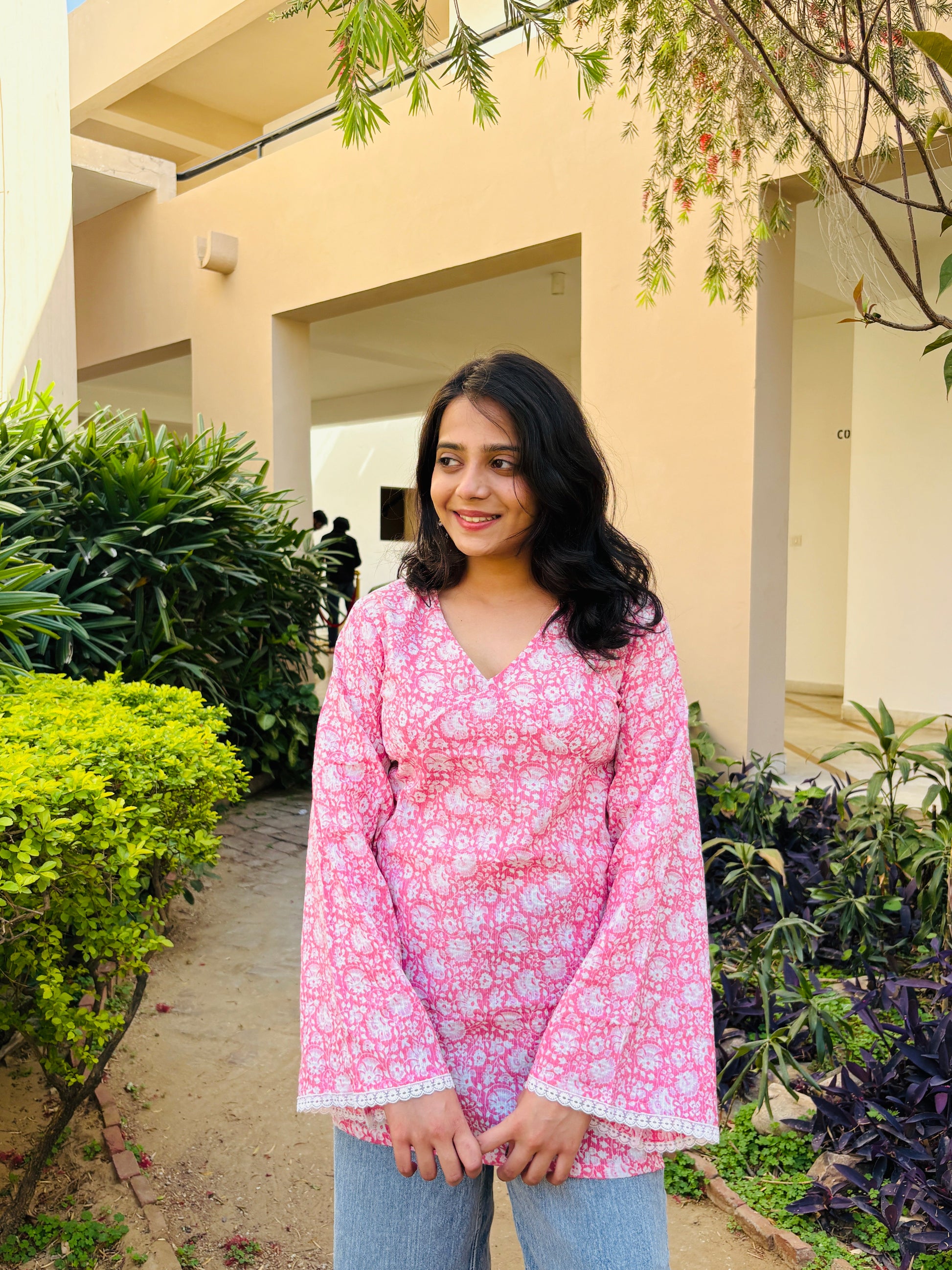 Delicate and dreamy, the Roohani Kurti in soft pink is an ode to vintage charm. The intricate white handblock print on the pastel pink fabric exudes an old-world elegance. The deep V-neckline flatters the frame, while the bell sleeves add a flowy, ethereal touch. Whether styled for a daytime outing or an intimate gathering, this kurti speaks of effortless grace.