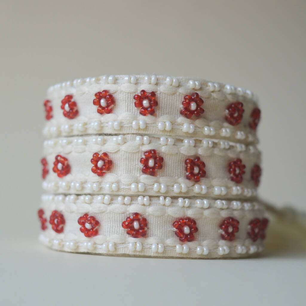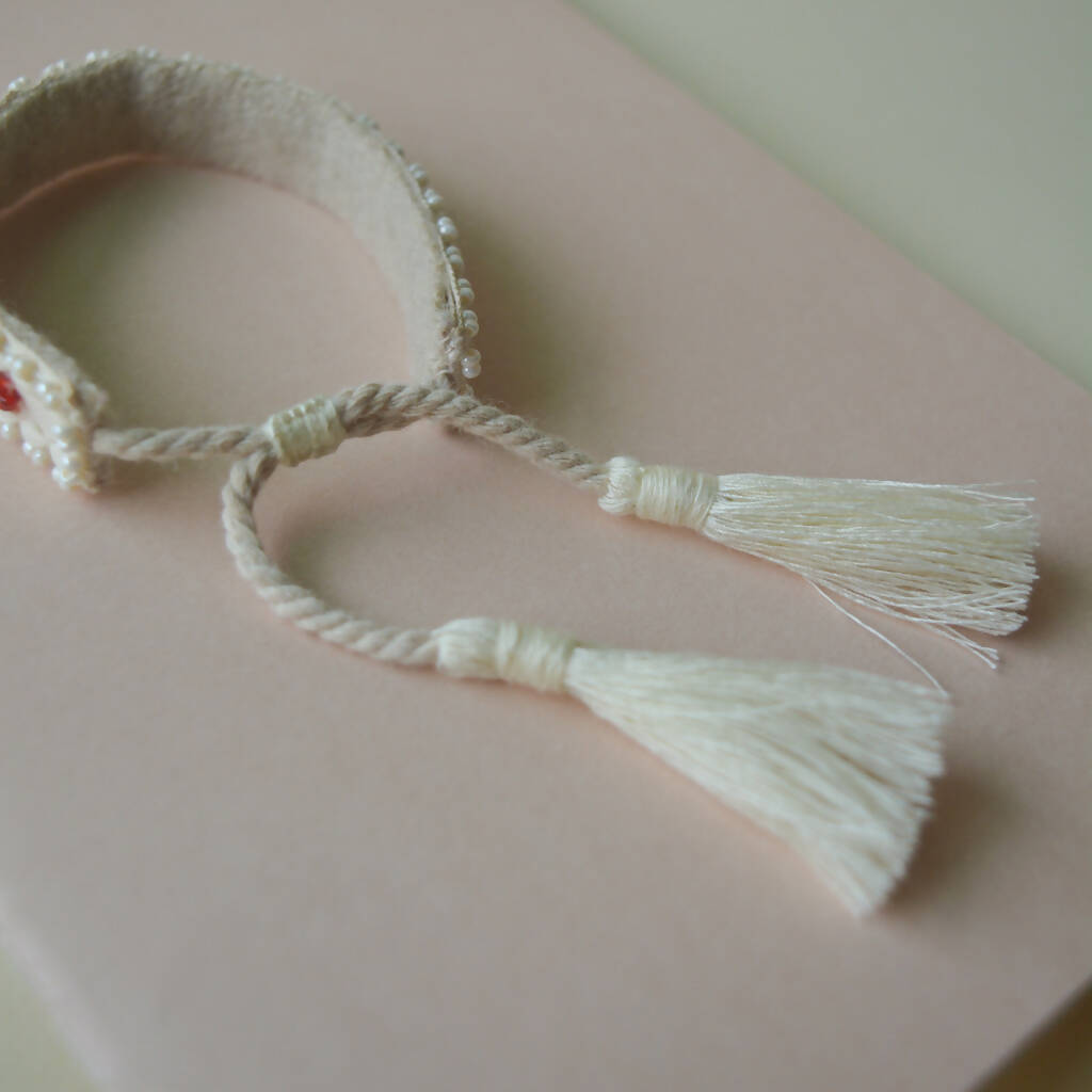 This one size fits all handwoven band has flower motifs embroidered on it using glass seed beads. The band has an ivory base with flowers in red and off white beaded on it and is outlined with mini off white beads. The band has tassel ends and comes with an adjuster to fit any wrist size perfectly. These beaded woven bracelets can be worn alone or stackedwith other hand accessories.