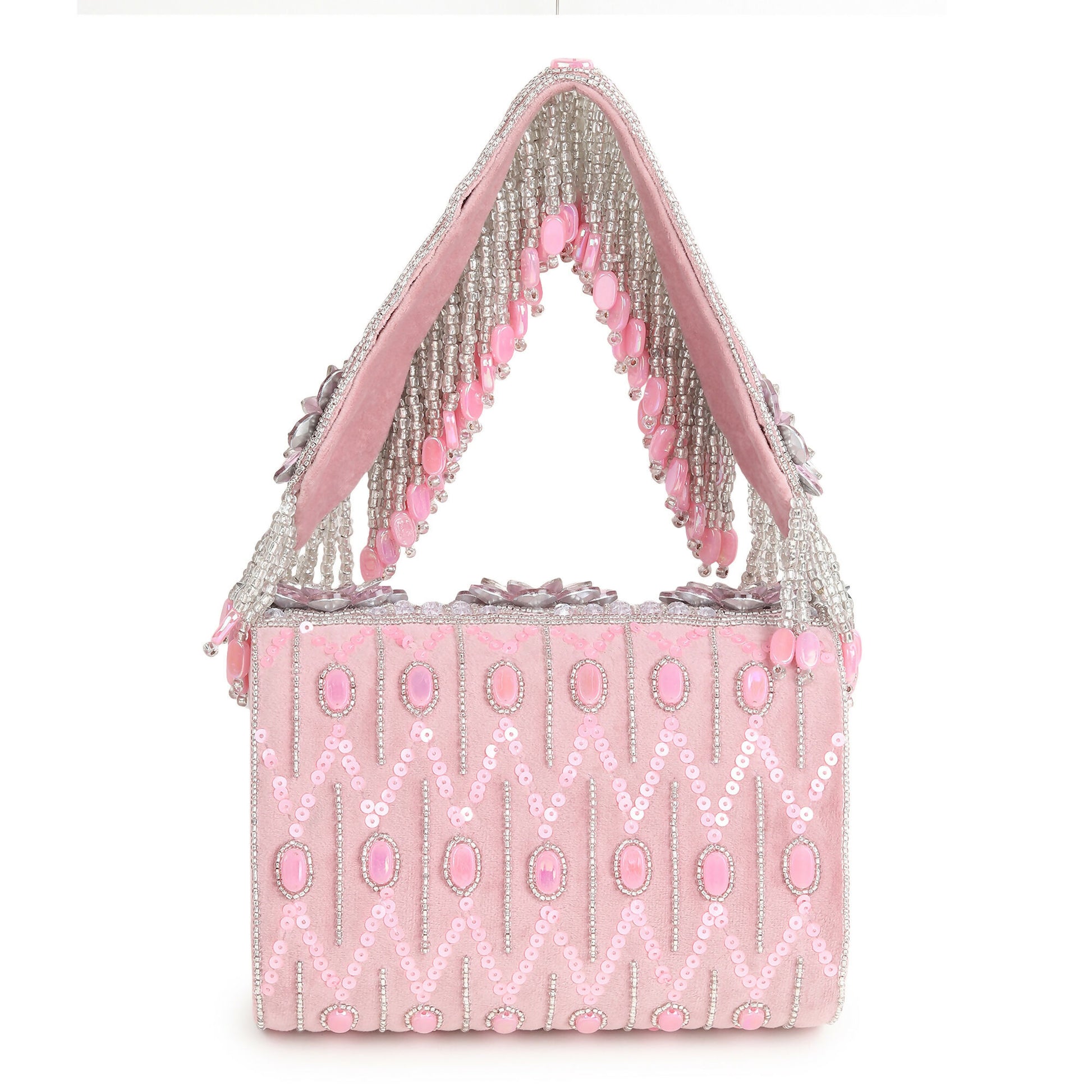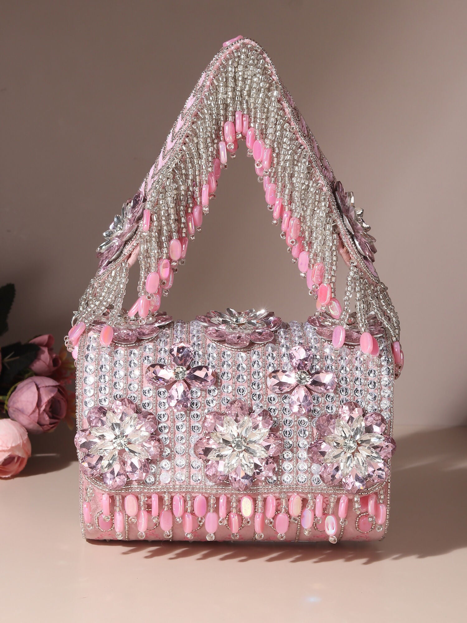 Rosy Chic Flap Bag is a stunning piece of craftsmanship, adorned with radiant pink and silver stones that shimmer with every movement. Its stylish tassel detail adds a playful touch to the design, while the intricately embroidered handle speaks to its refined elegance. This bag effortlessly combines sophistication with a hint of charm, making it a standout accessory for those with a taste for luxury.