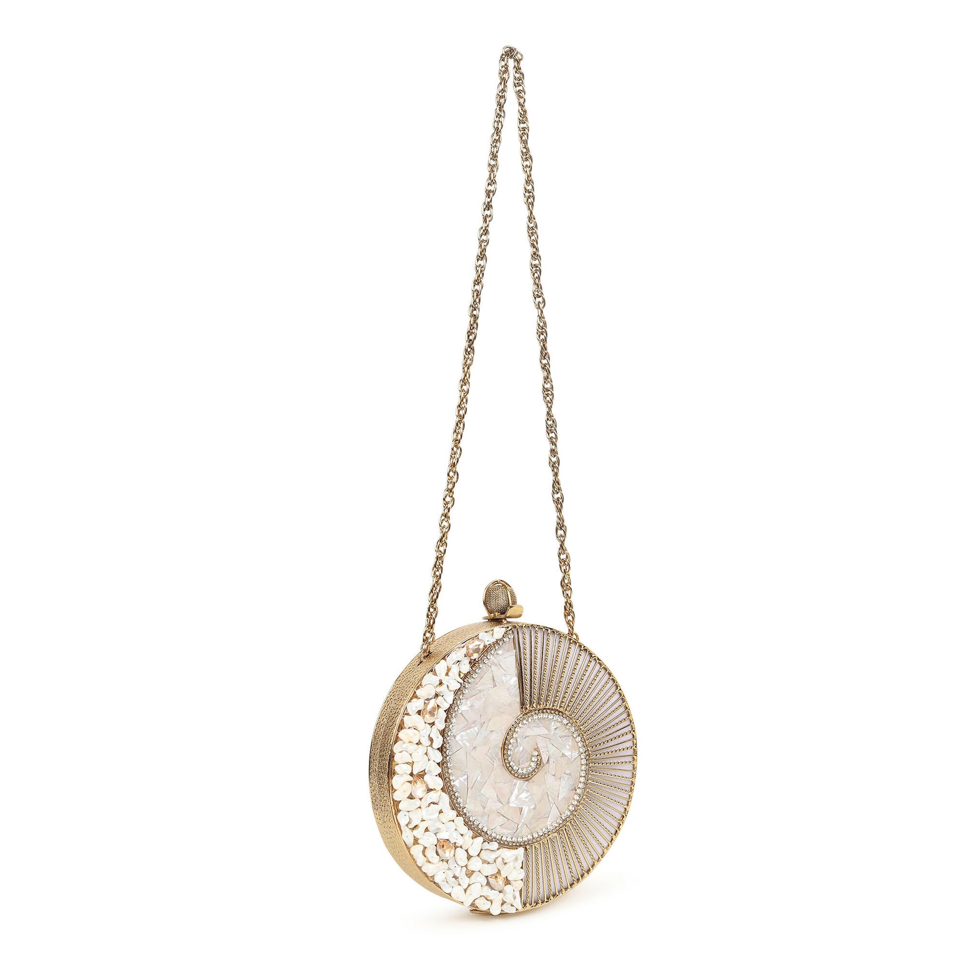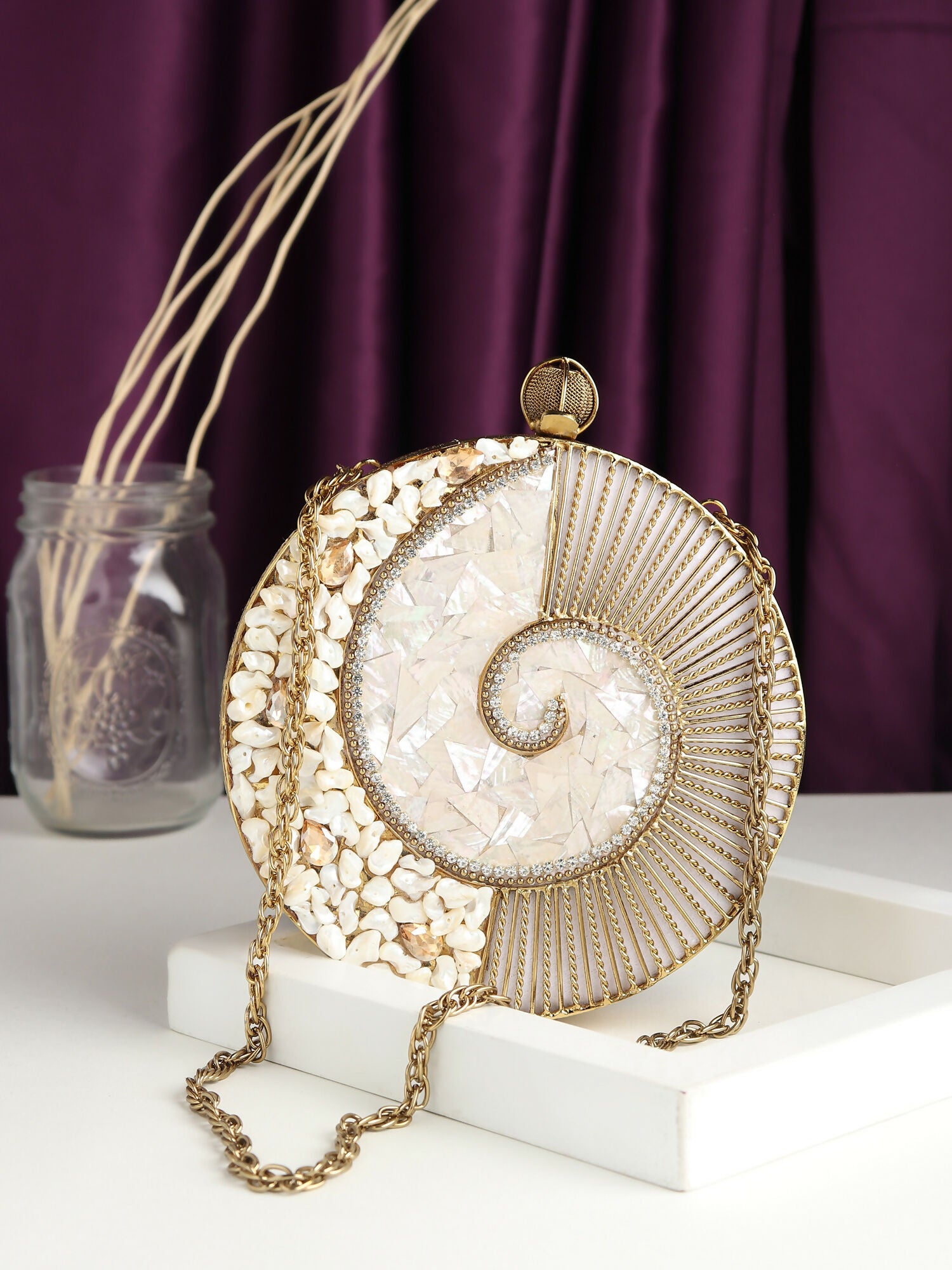 Discover the allure of the Round Seashell Bag, a stunning accessory that captures the essence of coastal charm. Adorned with shimmering stones and pearls on the front, this bag exudes sophistication and grace.