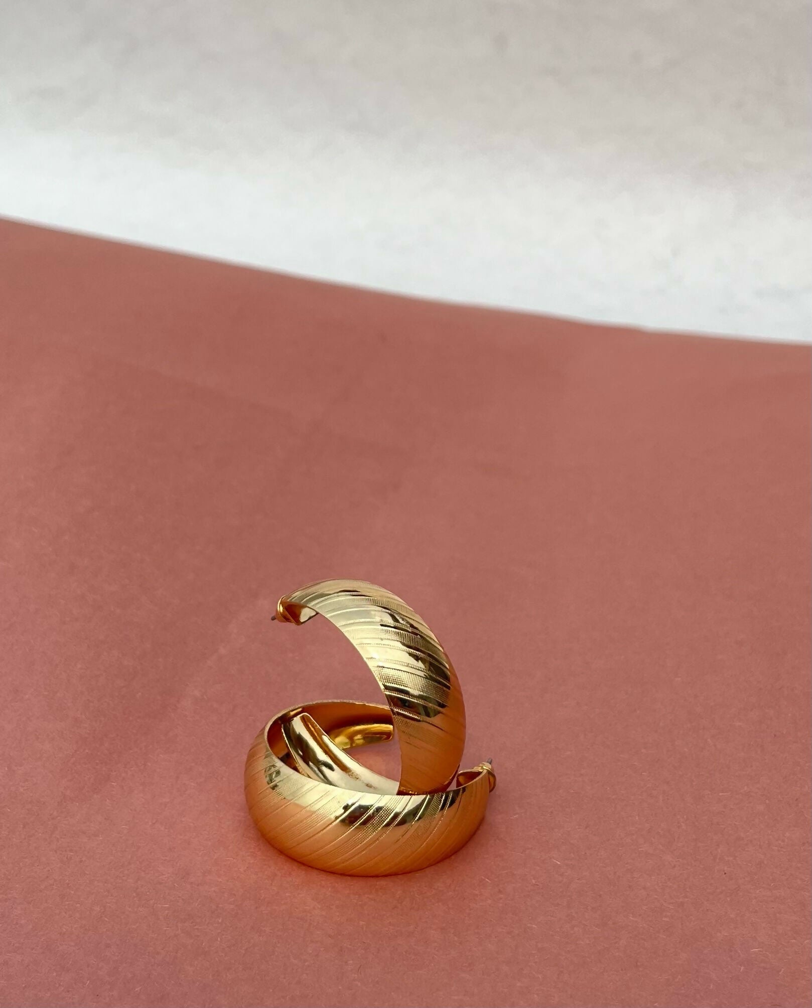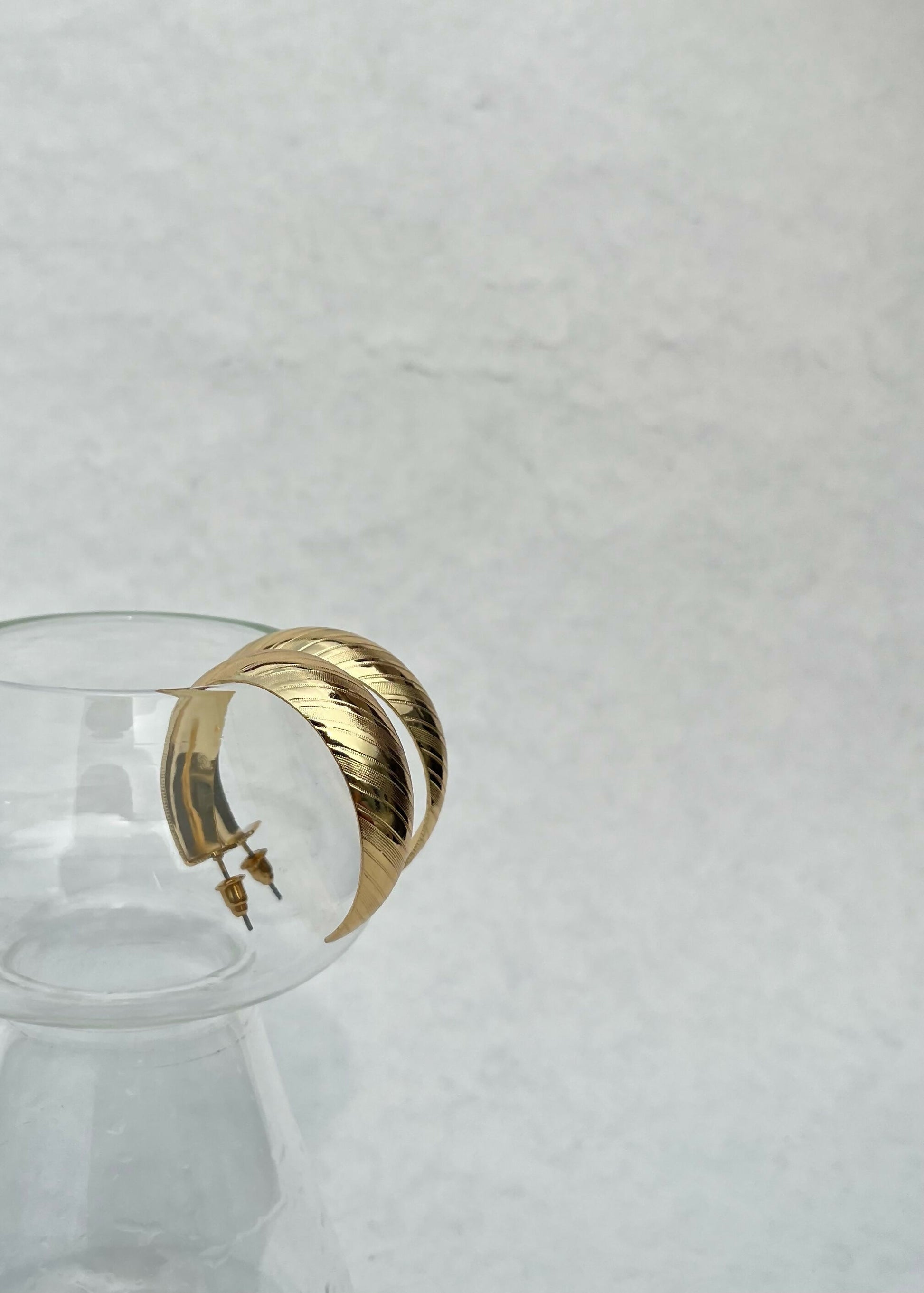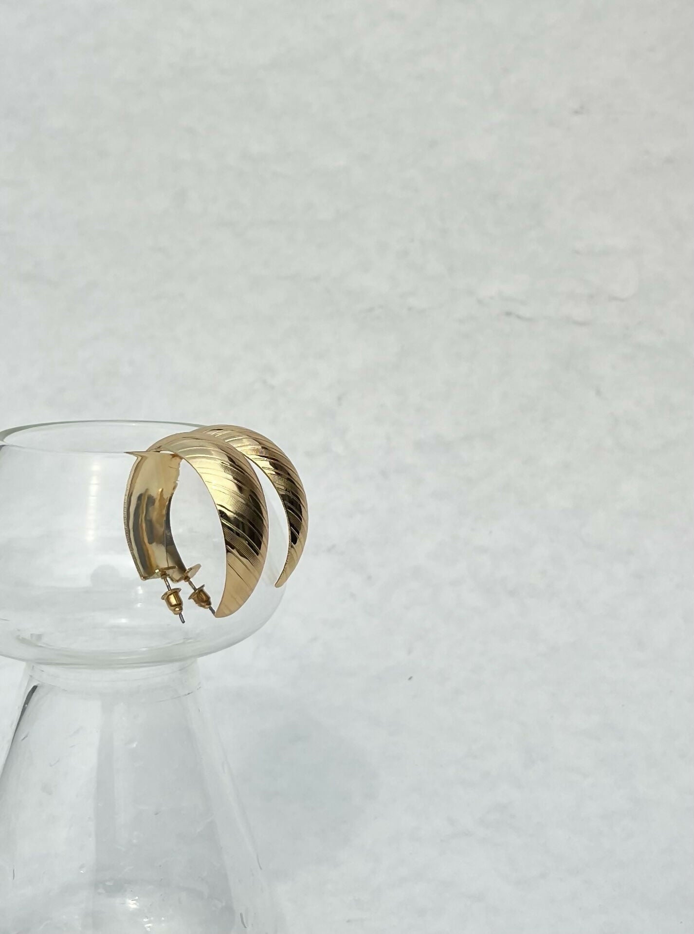 Gorgeous round gold earrings with a twist! Eye-catching design adds flair to any outfit. Versatile and chic, perfect for everyday wear or special occasions.