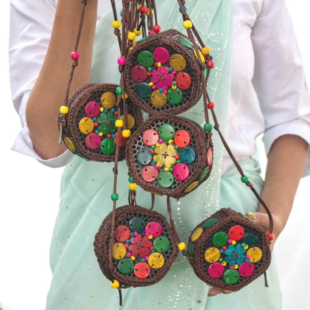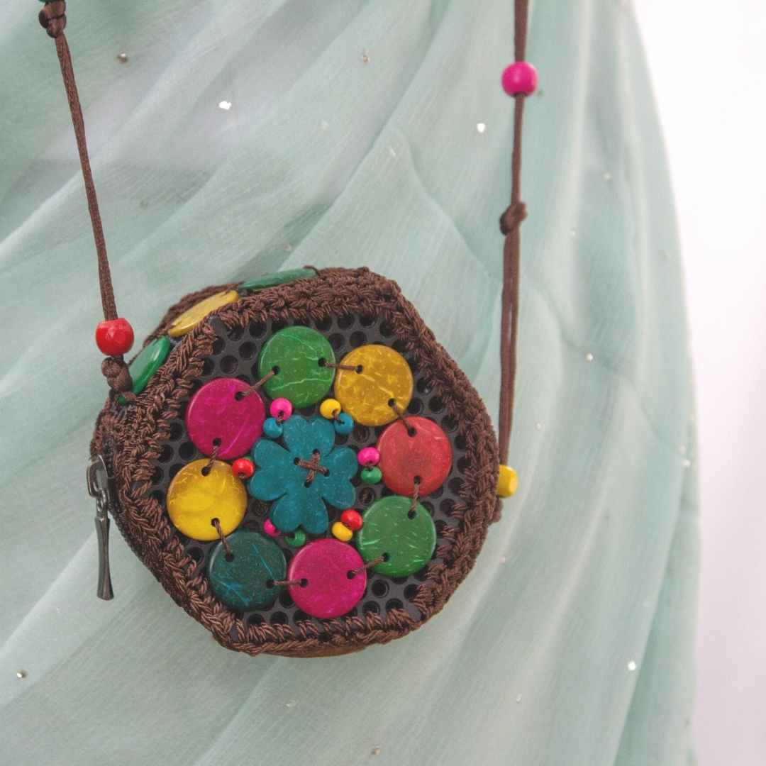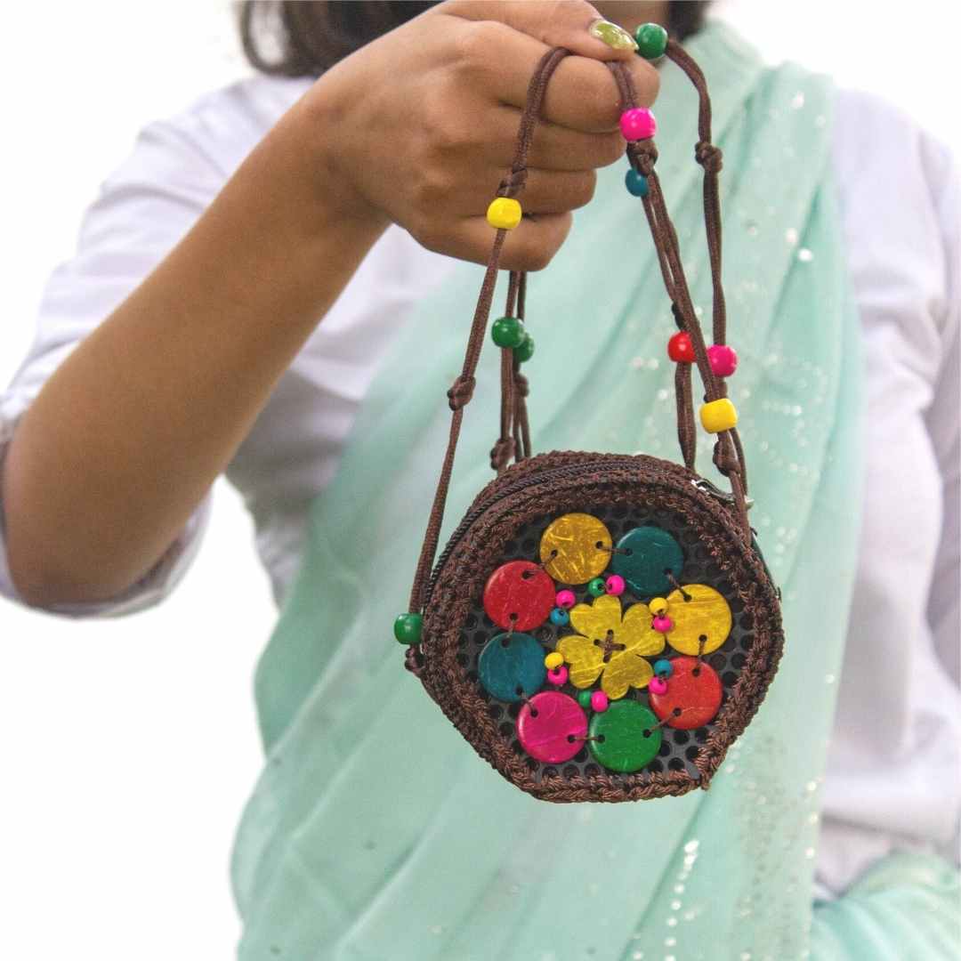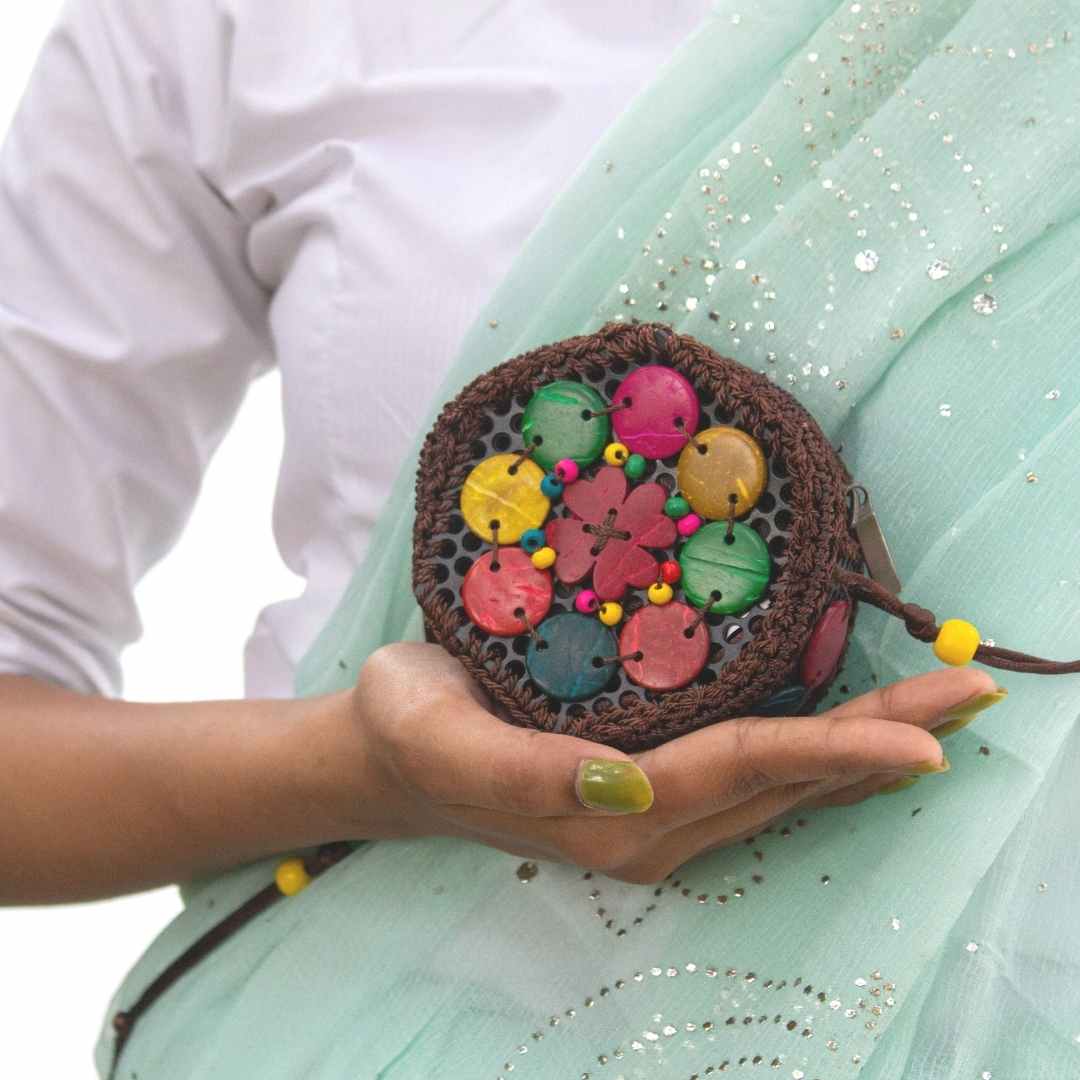 Purse- slingy and small. Sustainably light.Coconut shell bag in compact design for the small important stuff to carry at all times.