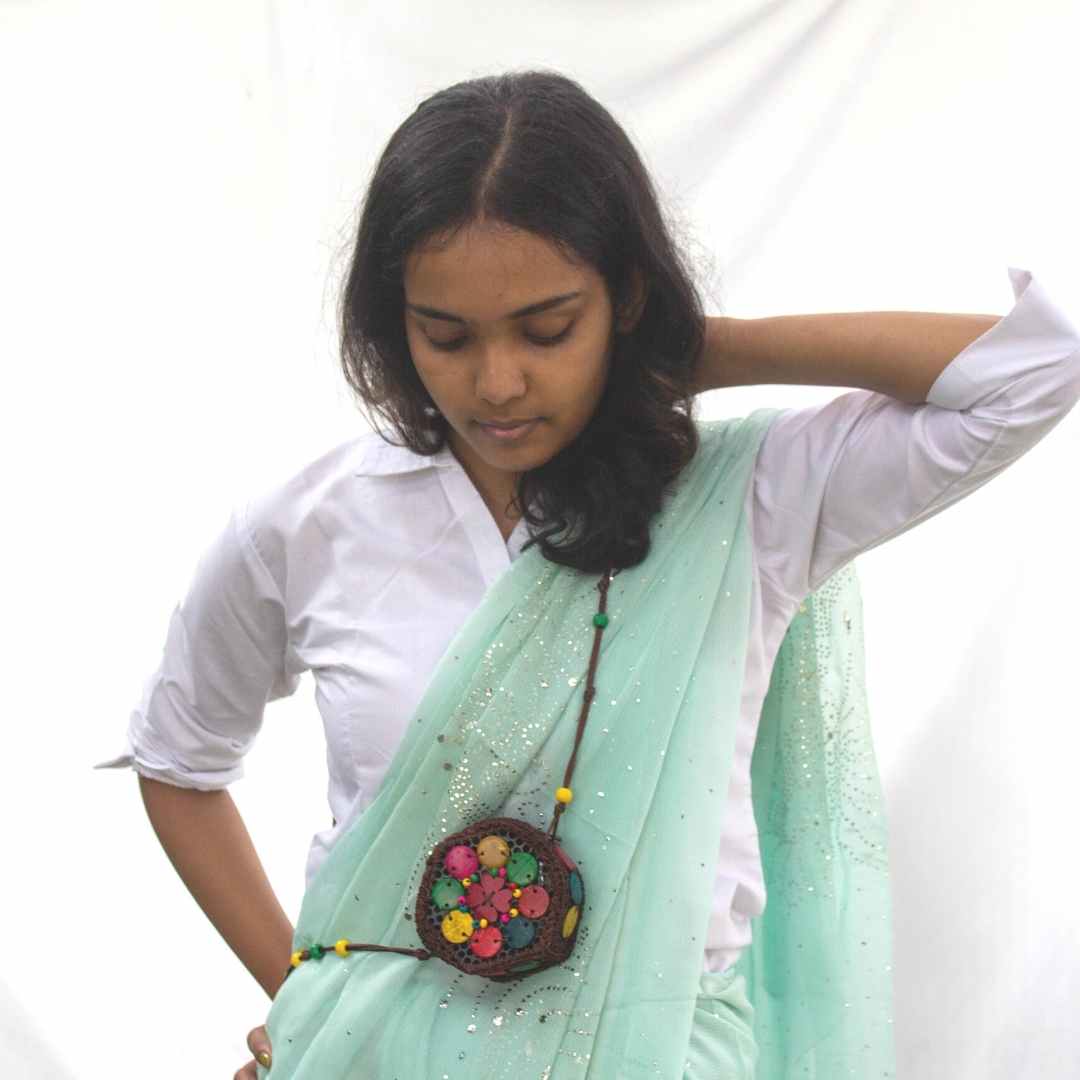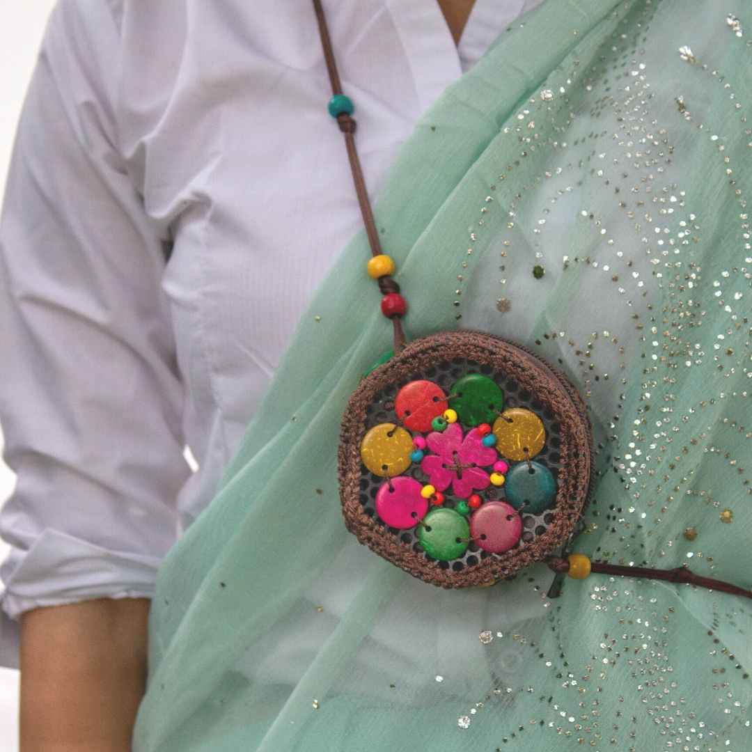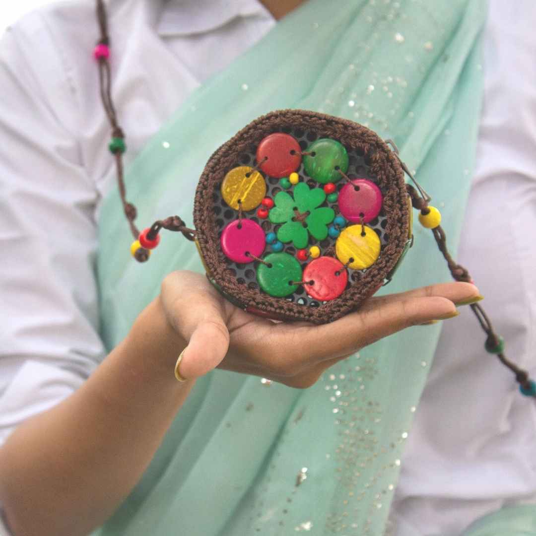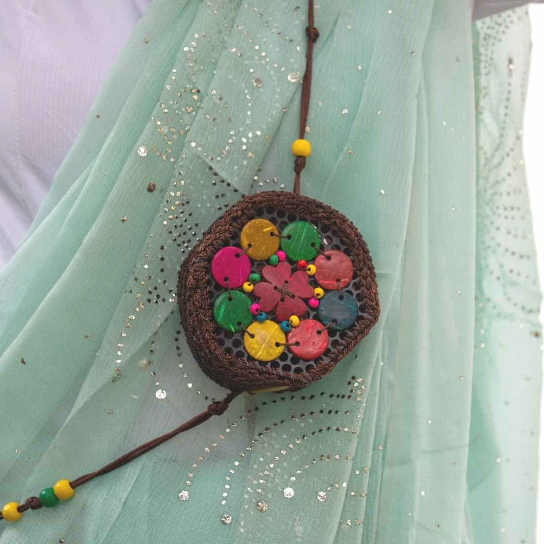 Purse- slingy and small. Sustainably light.Coconut shell bag in compact design for the small important stuff to carry at all times.