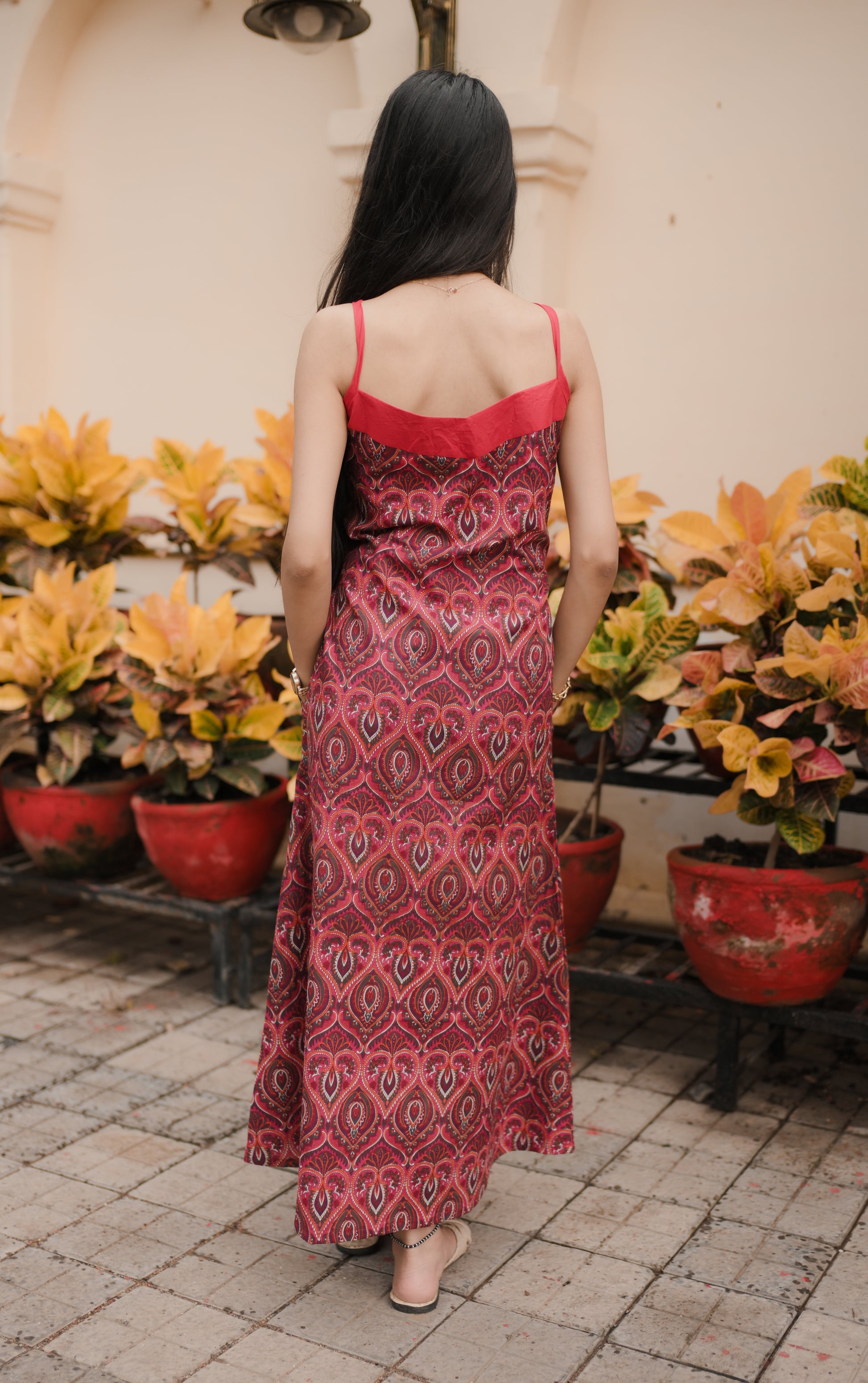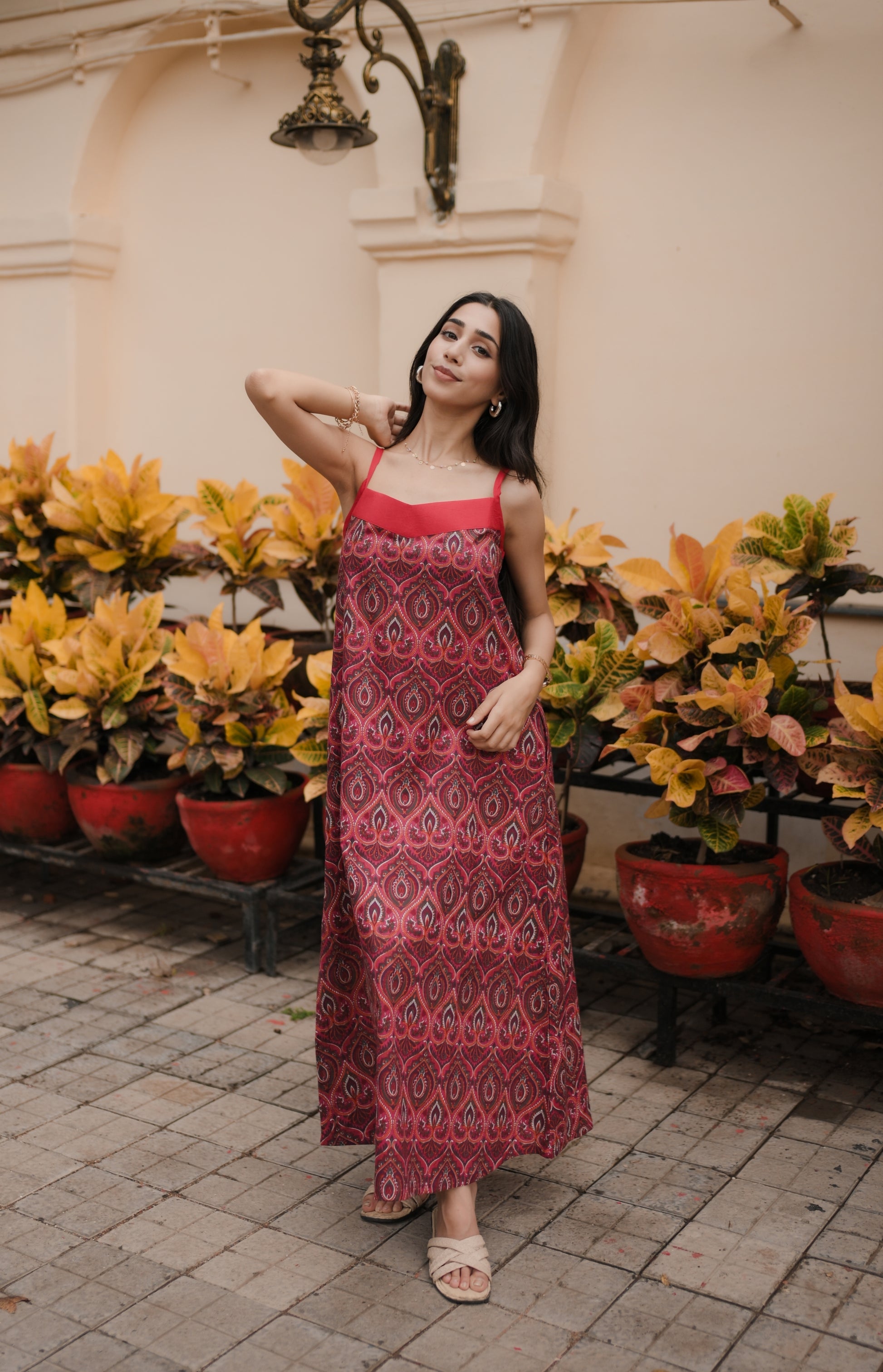 Grace meets ease in the Ruby Mirage Ethnic Print Dress, featuring a vibrant red base with traditional motifs, delicate spaghetti straps, and a breezy A-line silhouette. Full-length, lightweight, and pocket-equipped—perfect for sunlit strolls or serene evenings.
