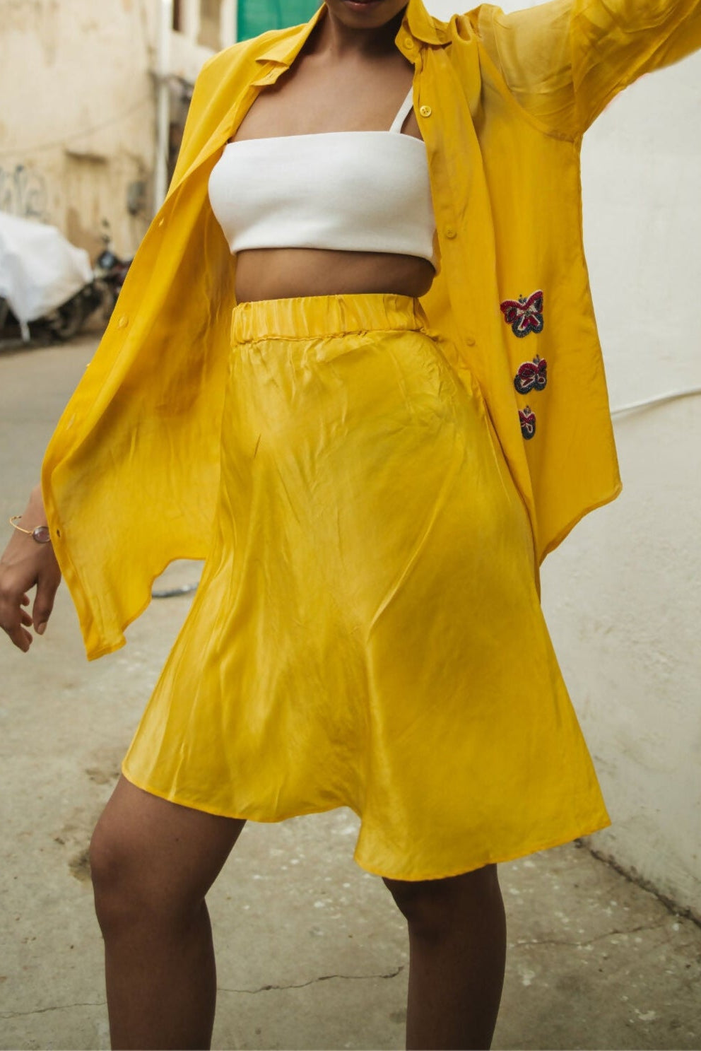 Introducing the Sage Golden Yellow Satin Crepe midi skirt, crafted from luxurious satin crepe, comes in a stunning golden yellow hue. Designed with an elastic waistband for a comfortable fit, the Sage skirt offers an elegant and stylish silhouette, perfect for any occasion