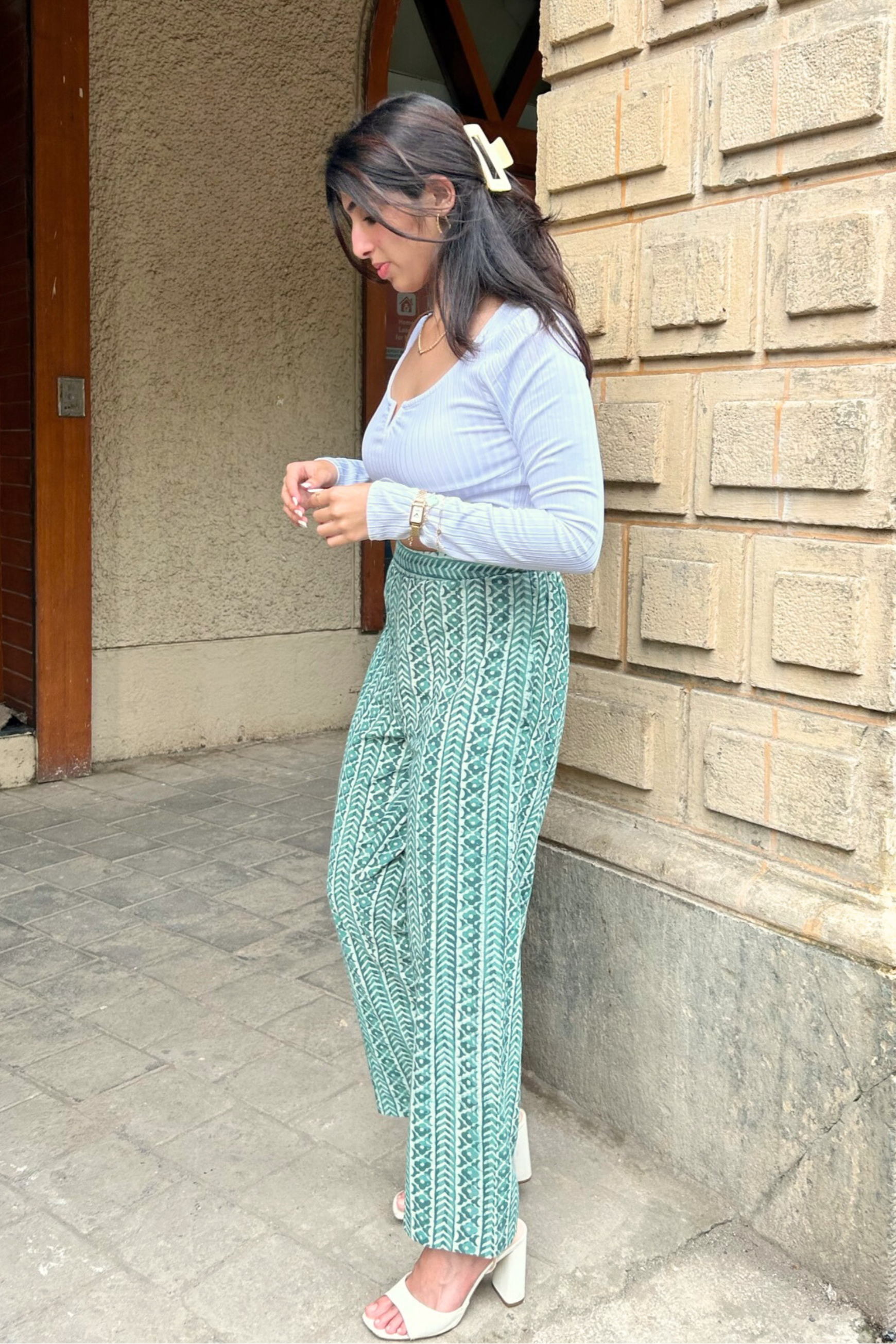 Sage Green Hand-Block Printed Pants with Pockets