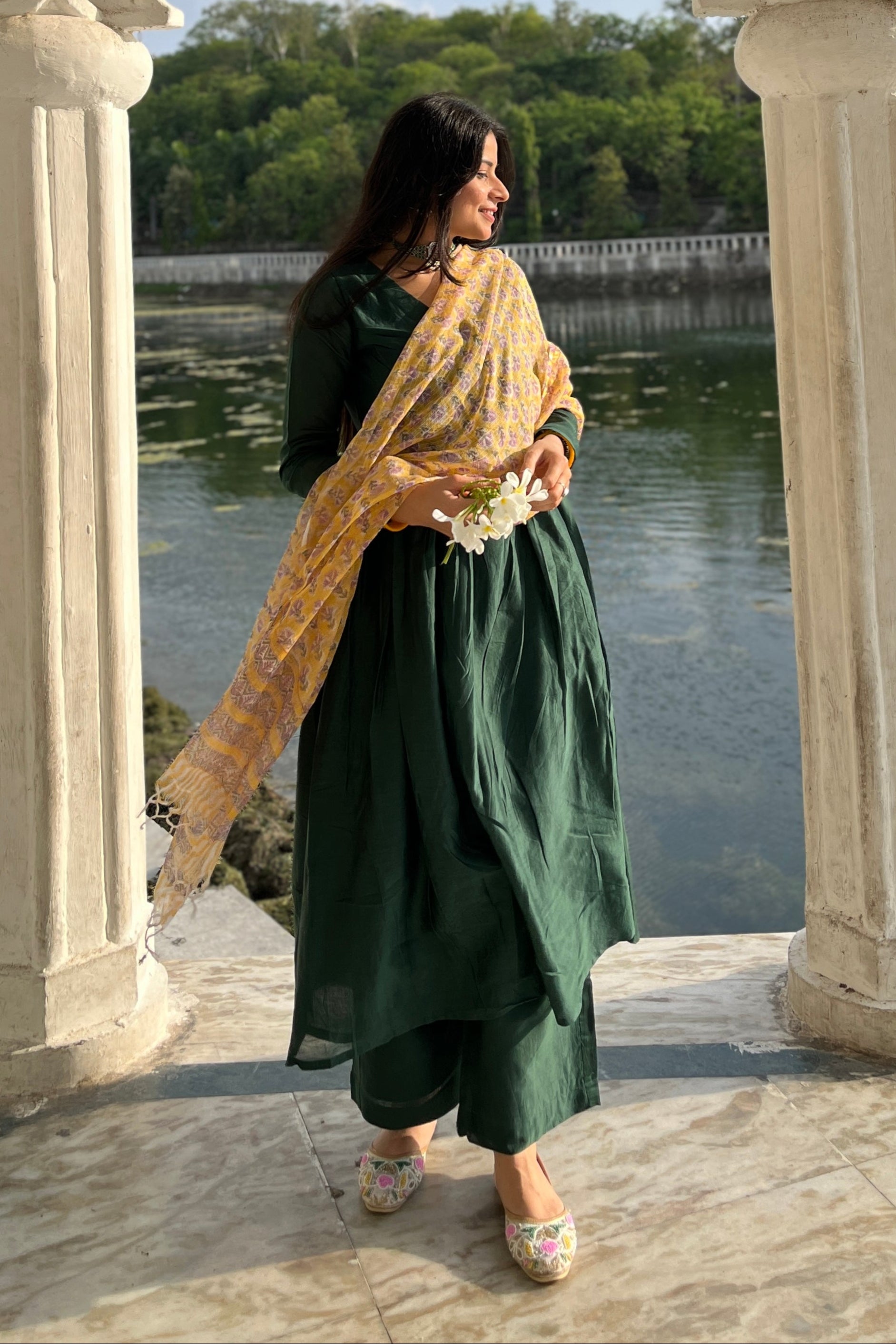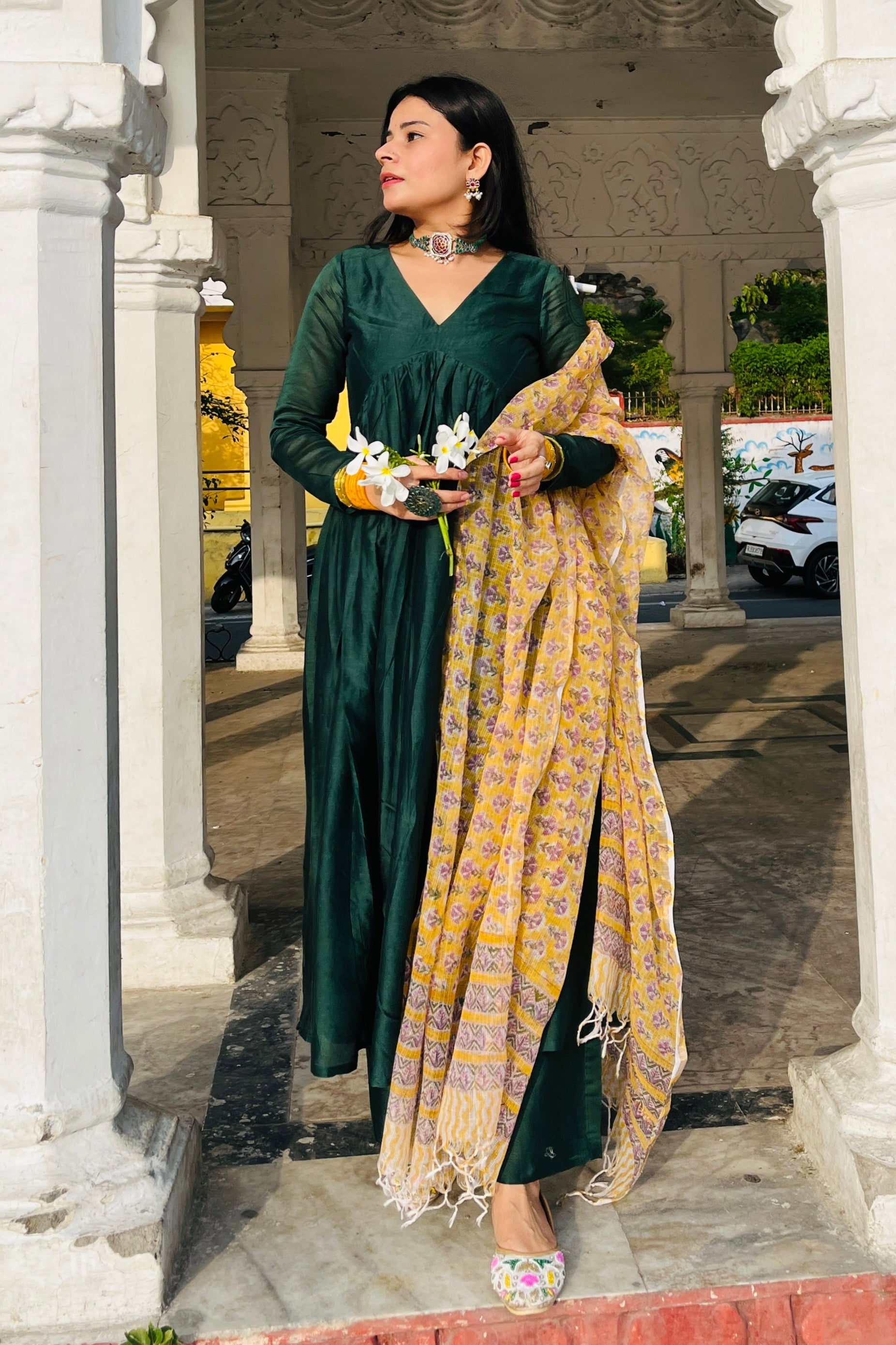 Handblock printed pure cotton floral anarkali suit with gota details comes with kota doriya dupatta. A perfect fit for those summery days!