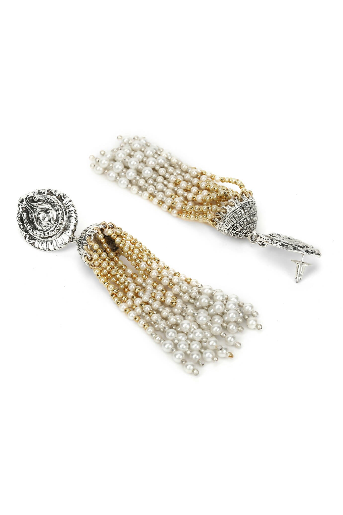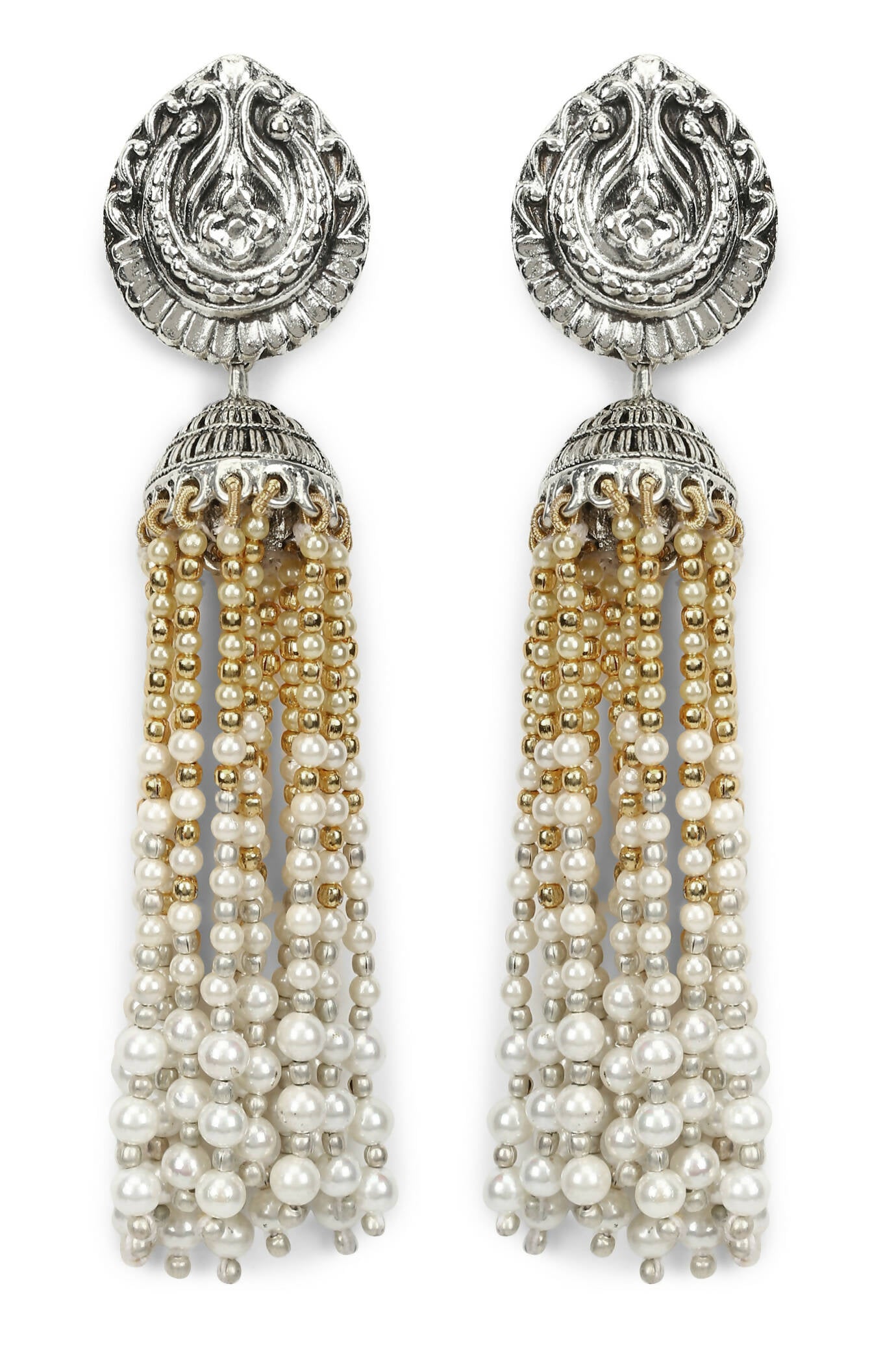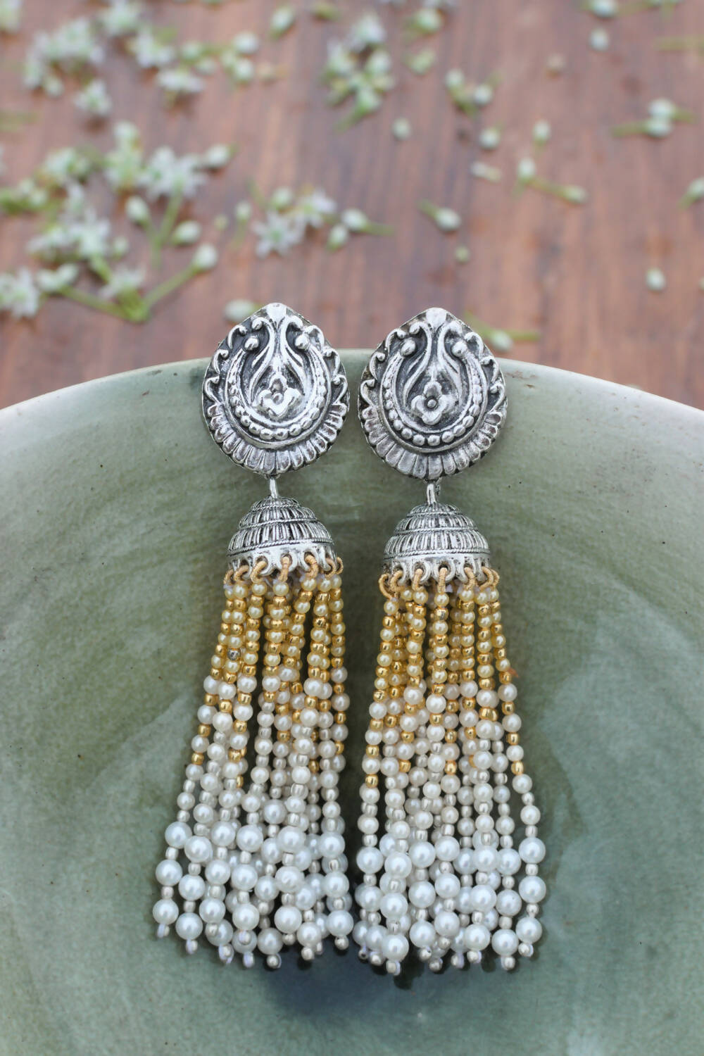 This is another name for twilight which is the basis of our collection. Here the phenomenon of day turning to night is shown by elements symbolic to the two times. The golden pearls and beads at the top of the tassel represent the golden sun, the lower portion’s white pearls and silver beads represent stars in the night sky and the middle portion is the mix of the two. So the actual transition of the sun making way for the moon is shown in these classic tassel jhumkas.