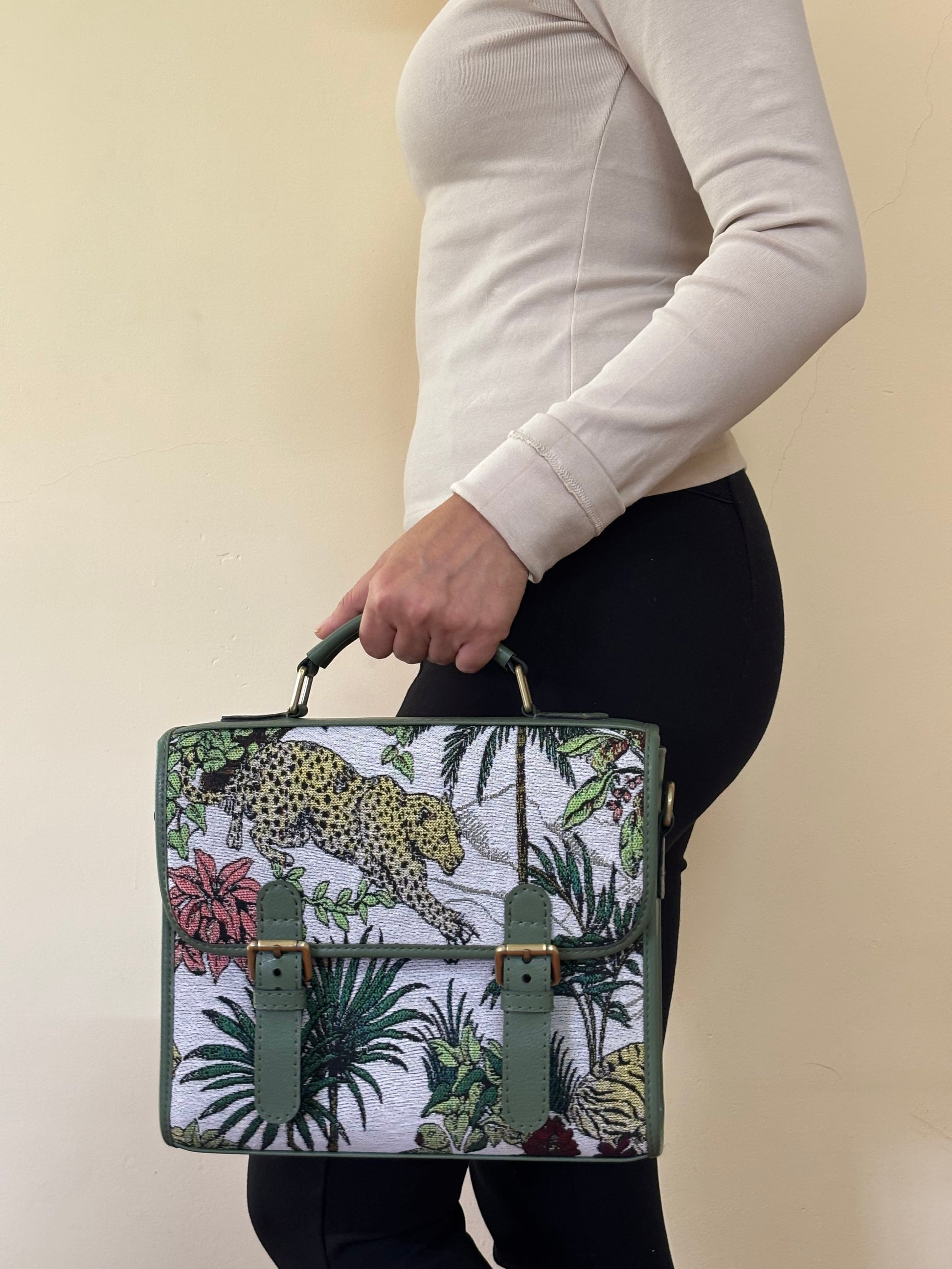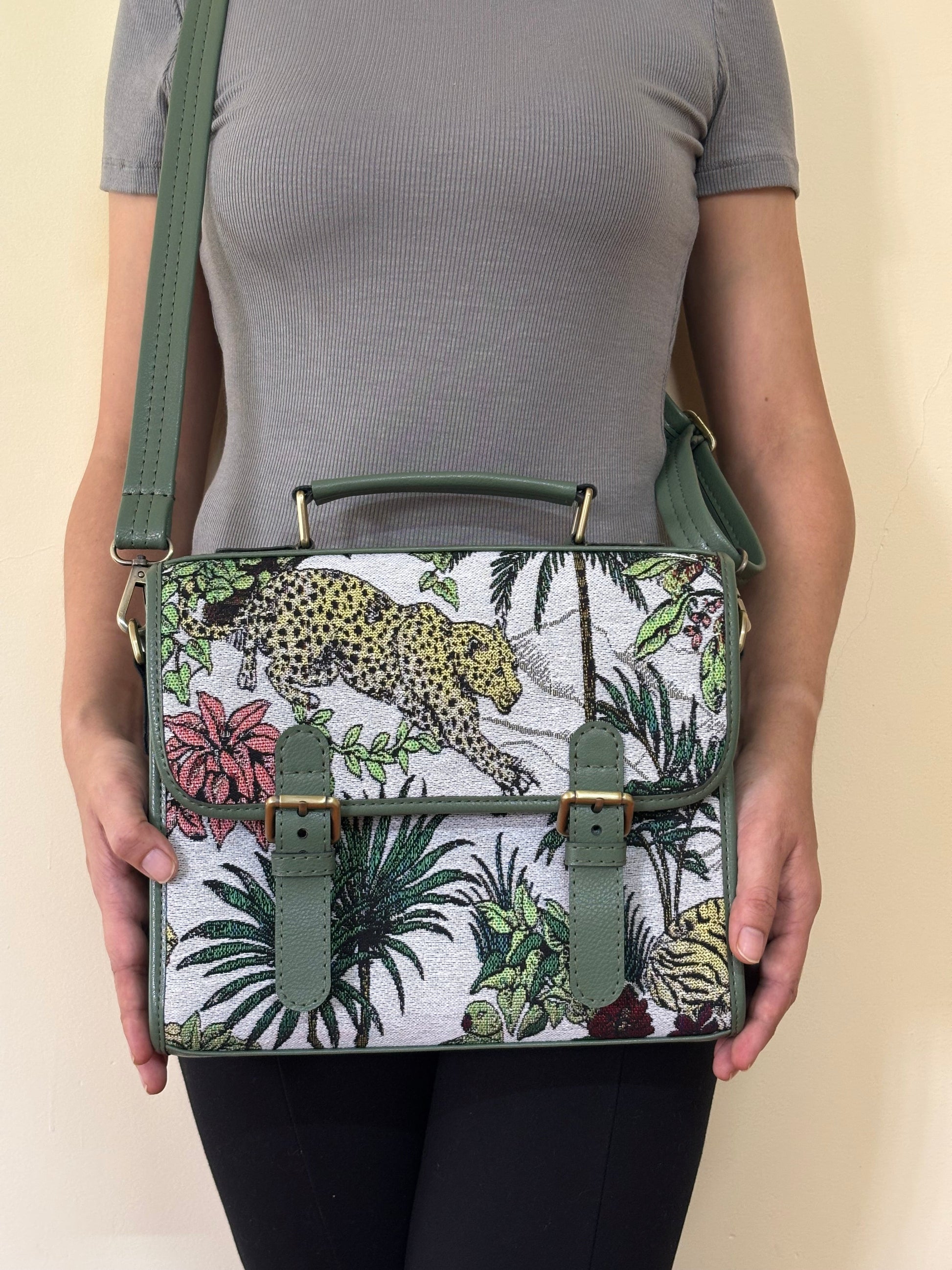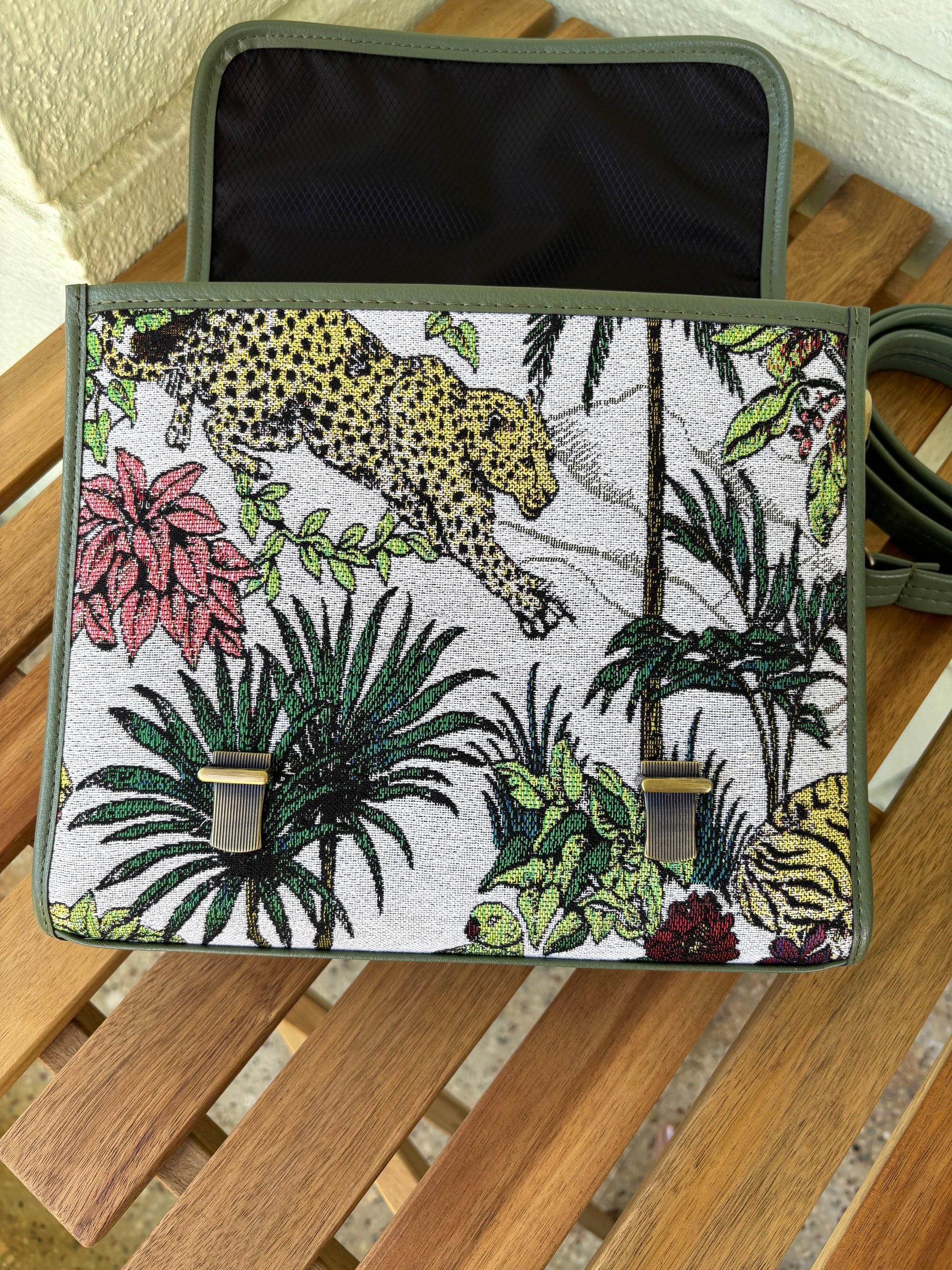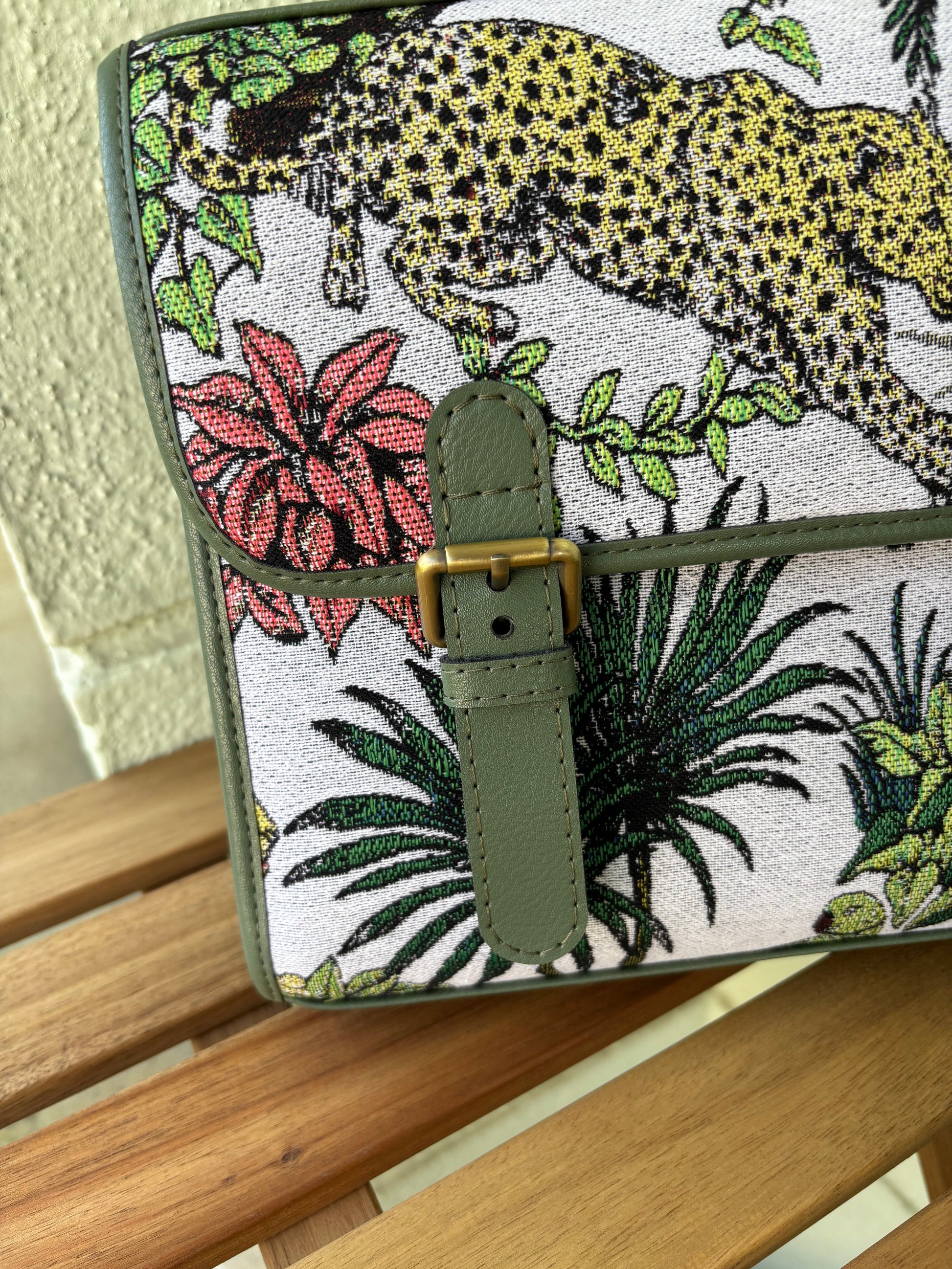 Wild yet refined, the Savanna Luxe Saddle Bag features a jungle-inspired tapestry with a resting leopard framed by lush greenery. Paired with deep green faux leather, it balances bold design with elegance. With a top handle, adjustable strap, and smart compartments, it’s a versatile piece that brings adventurous charm to everyday style.