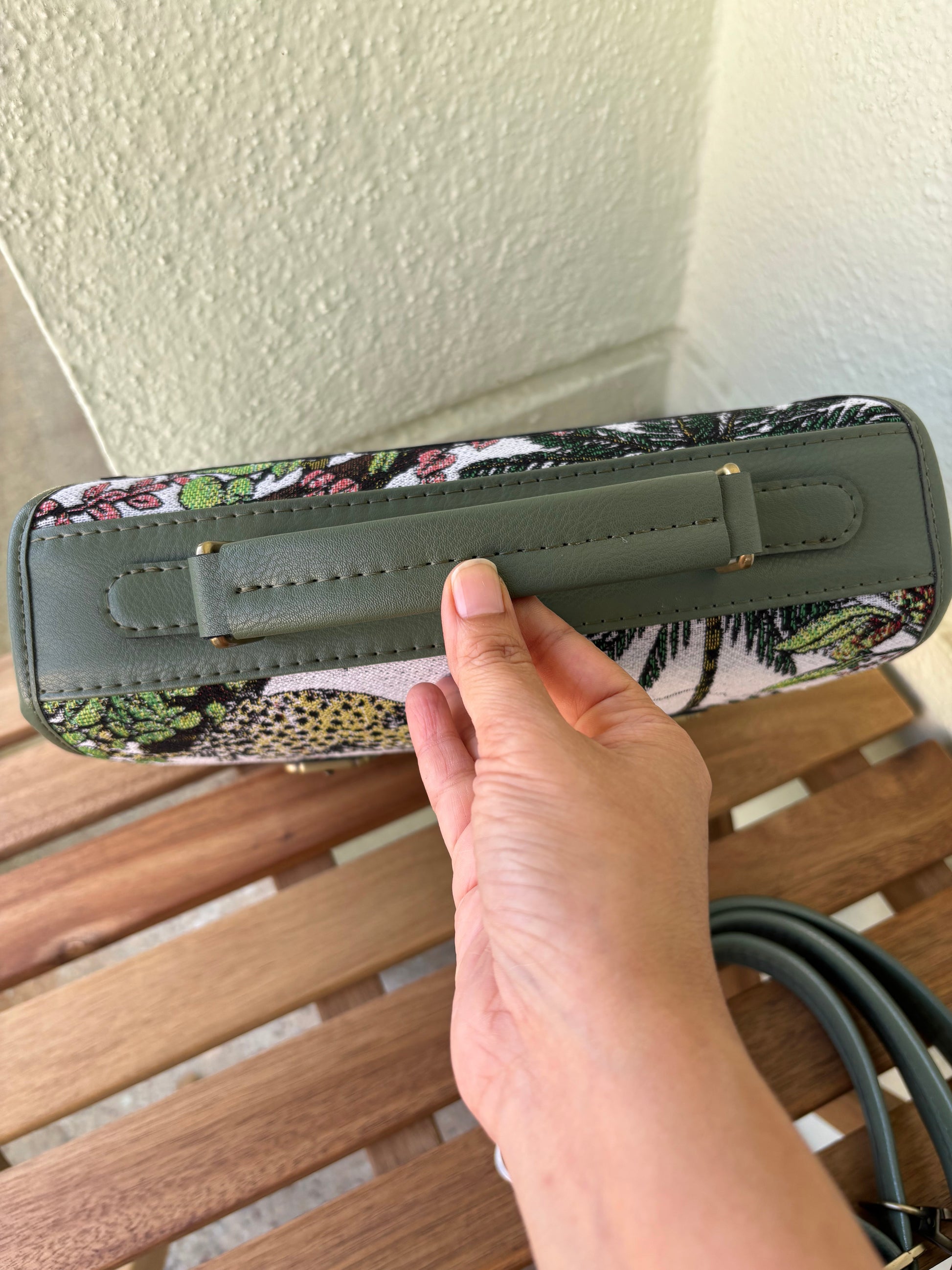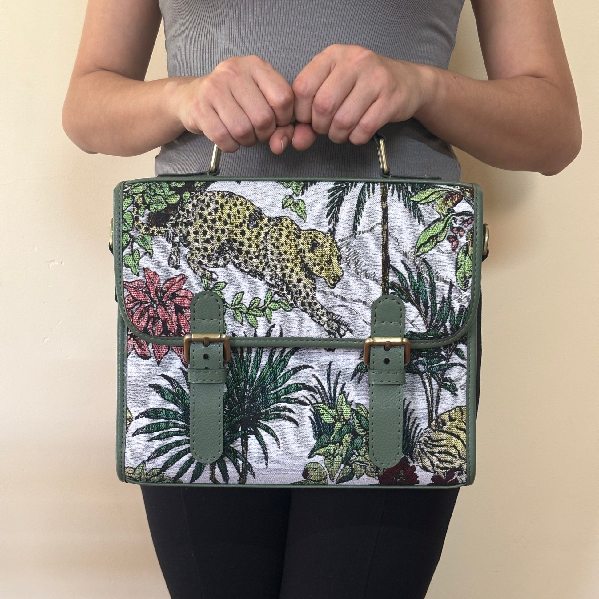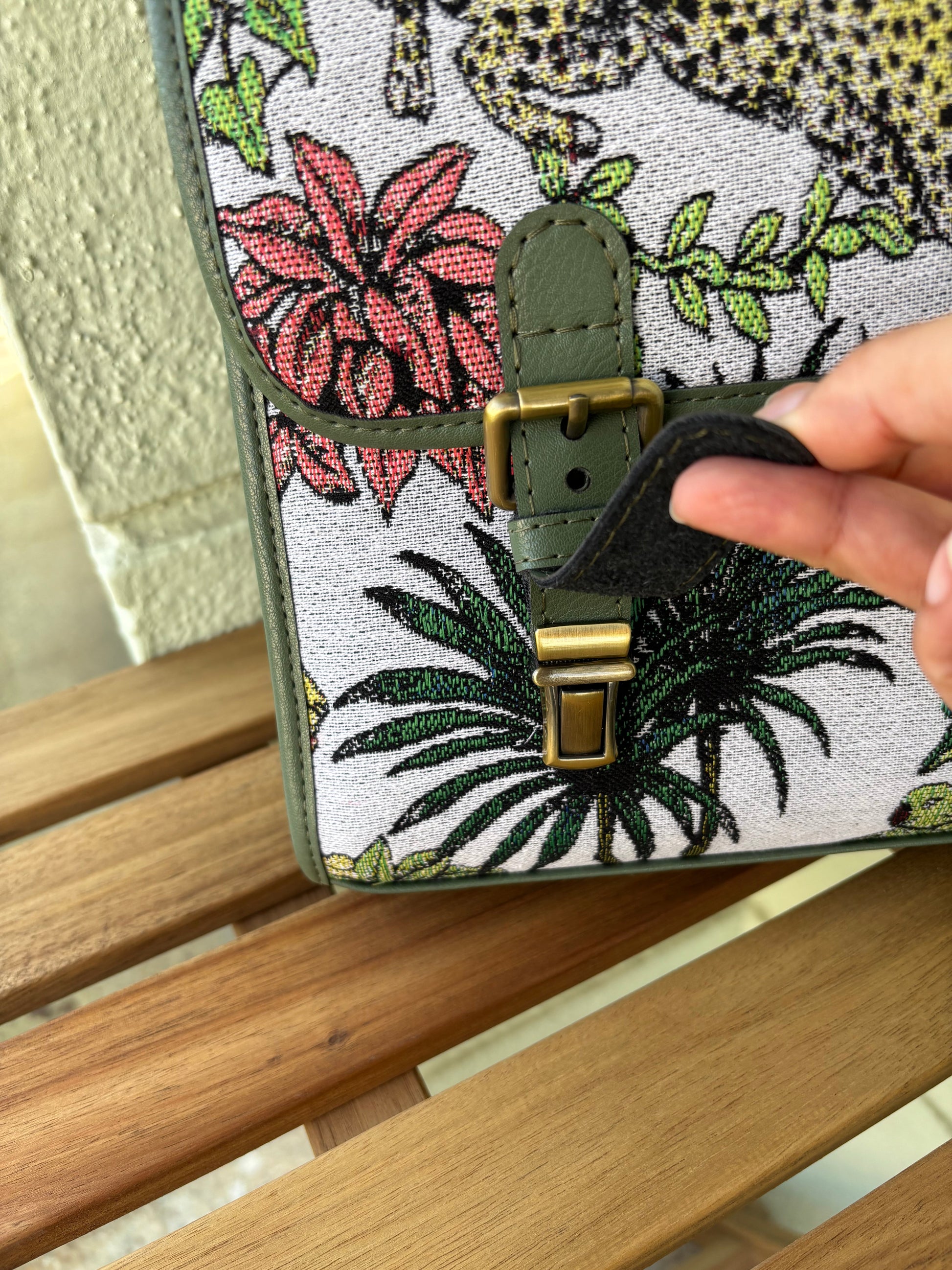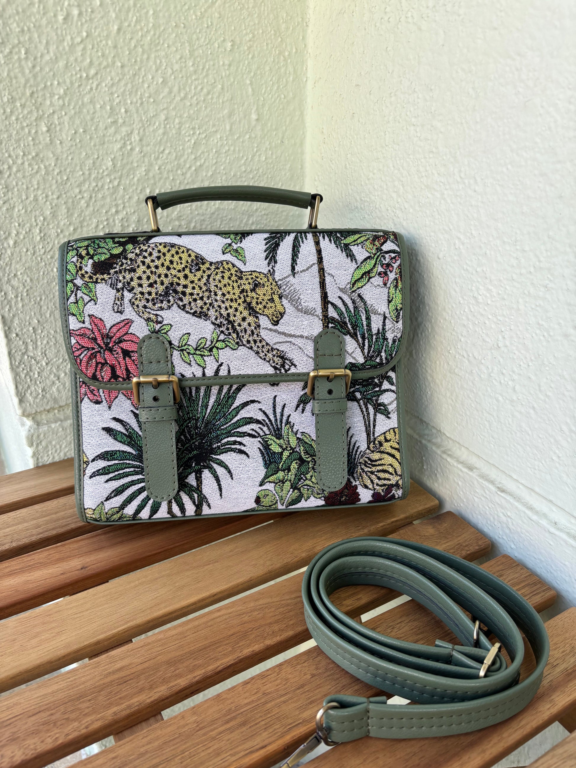 Wild yet refined, the Savanna Luxe Saddle Bag features a jungle-inspired tapestry with a resting leopard framed by lush greenery. Paired with deep green faux leather, it balances bold design with elegance. With a top handle, adjustable strap, and smart compartments, it’s a versatile piece that brings adventurous charm to everyday style.