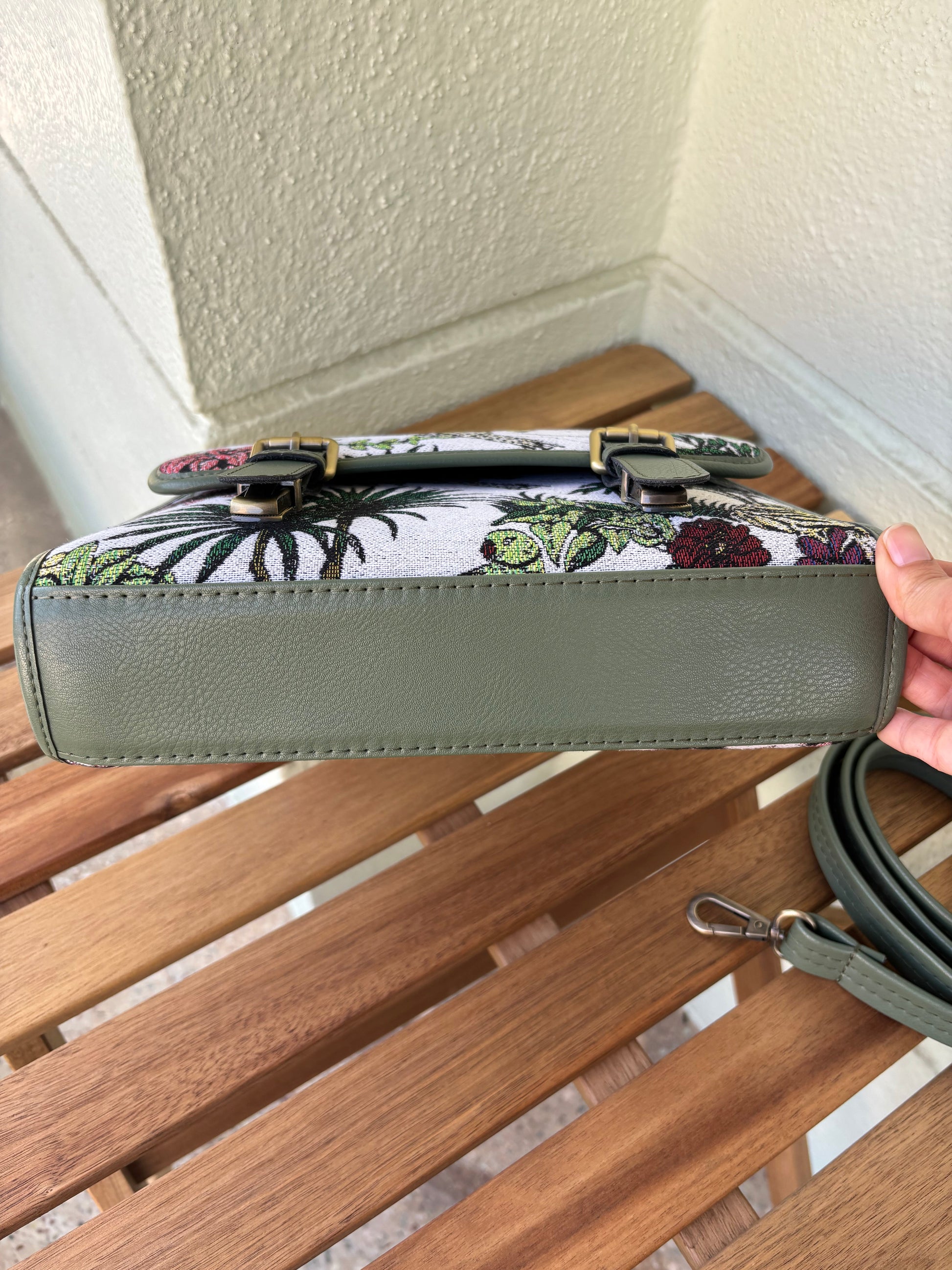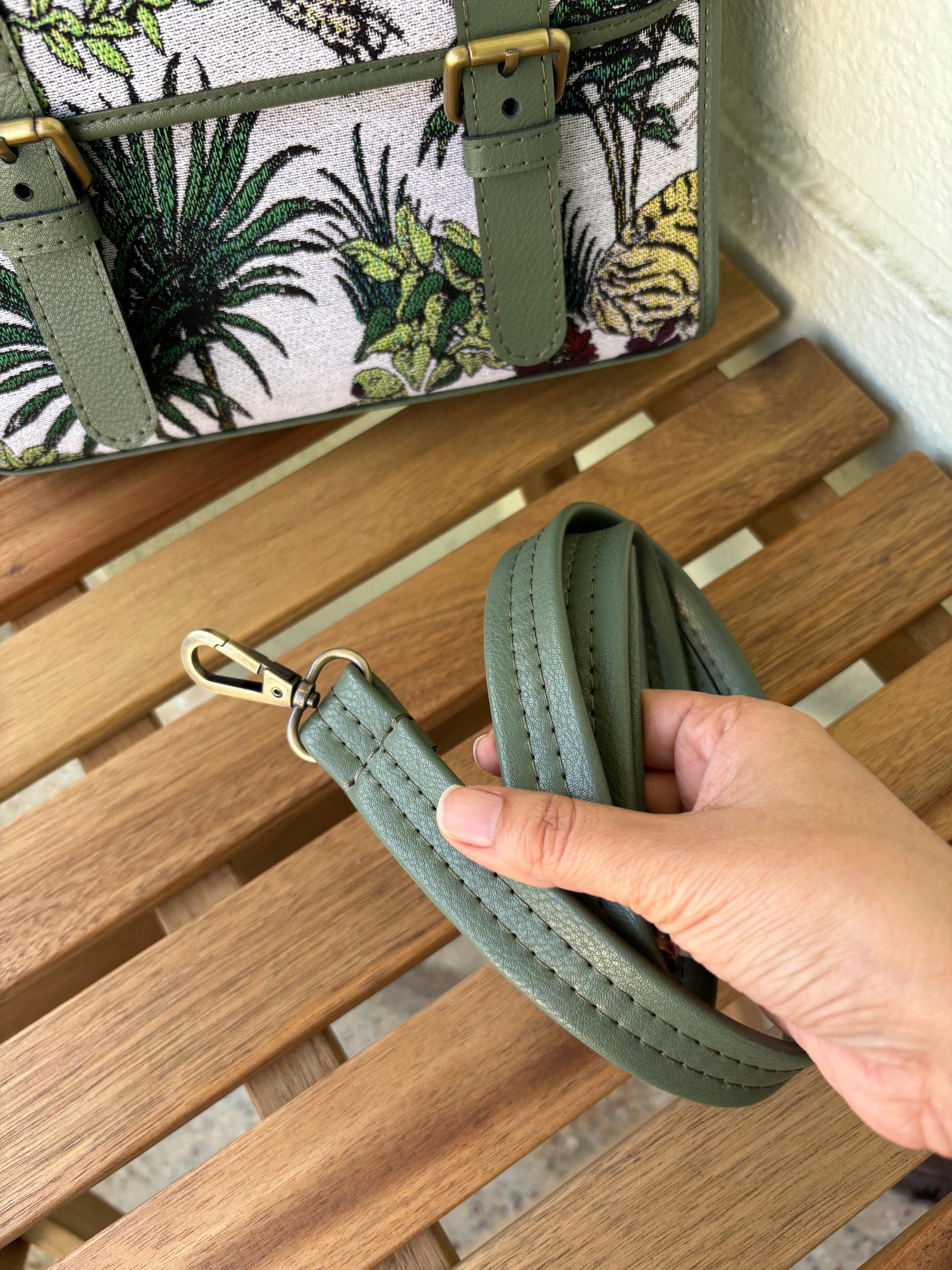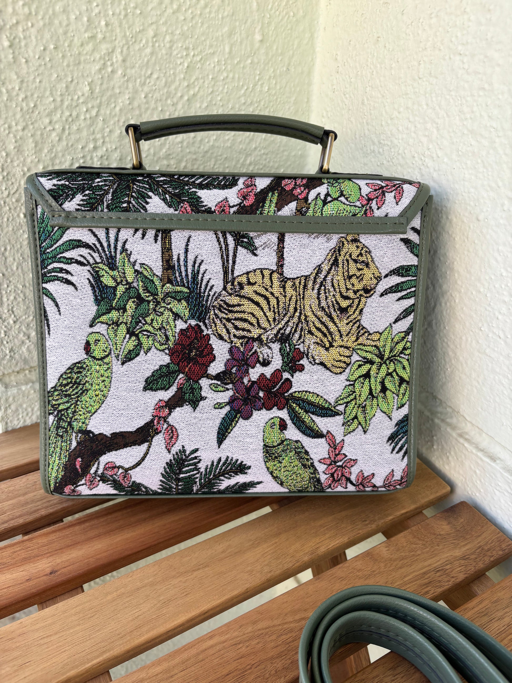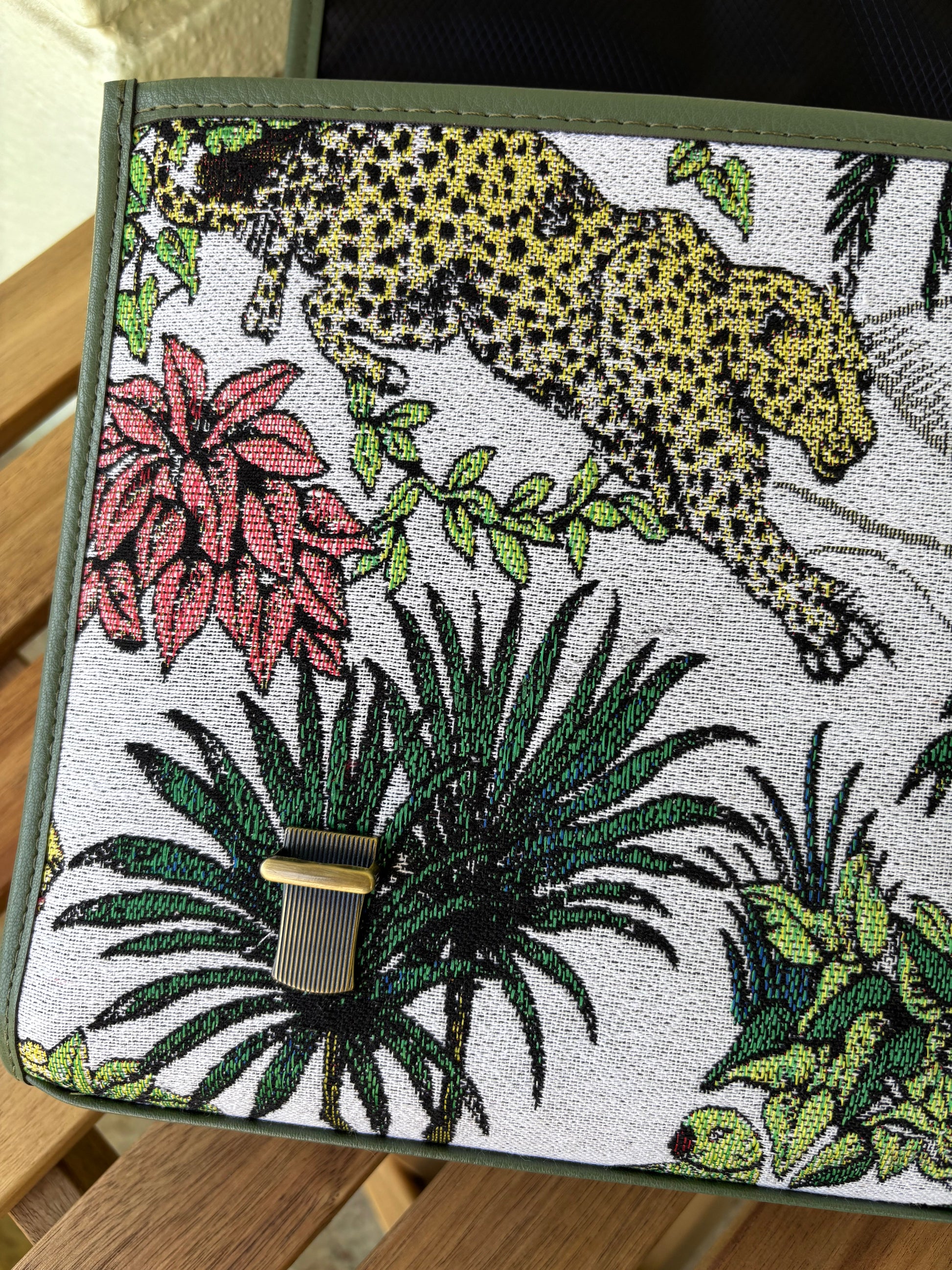 Wild yet refined, the Savanna Luxe Saddle Bag features a jungle-inspired tapestry with a resting leopard framed by lush greenery. Paired with deep green faux leather, it balances bold design with elegance. With a top handle, adjustable strap, and smart compartments, it’s a versatile piece that brings adventurous charm to everyday style.