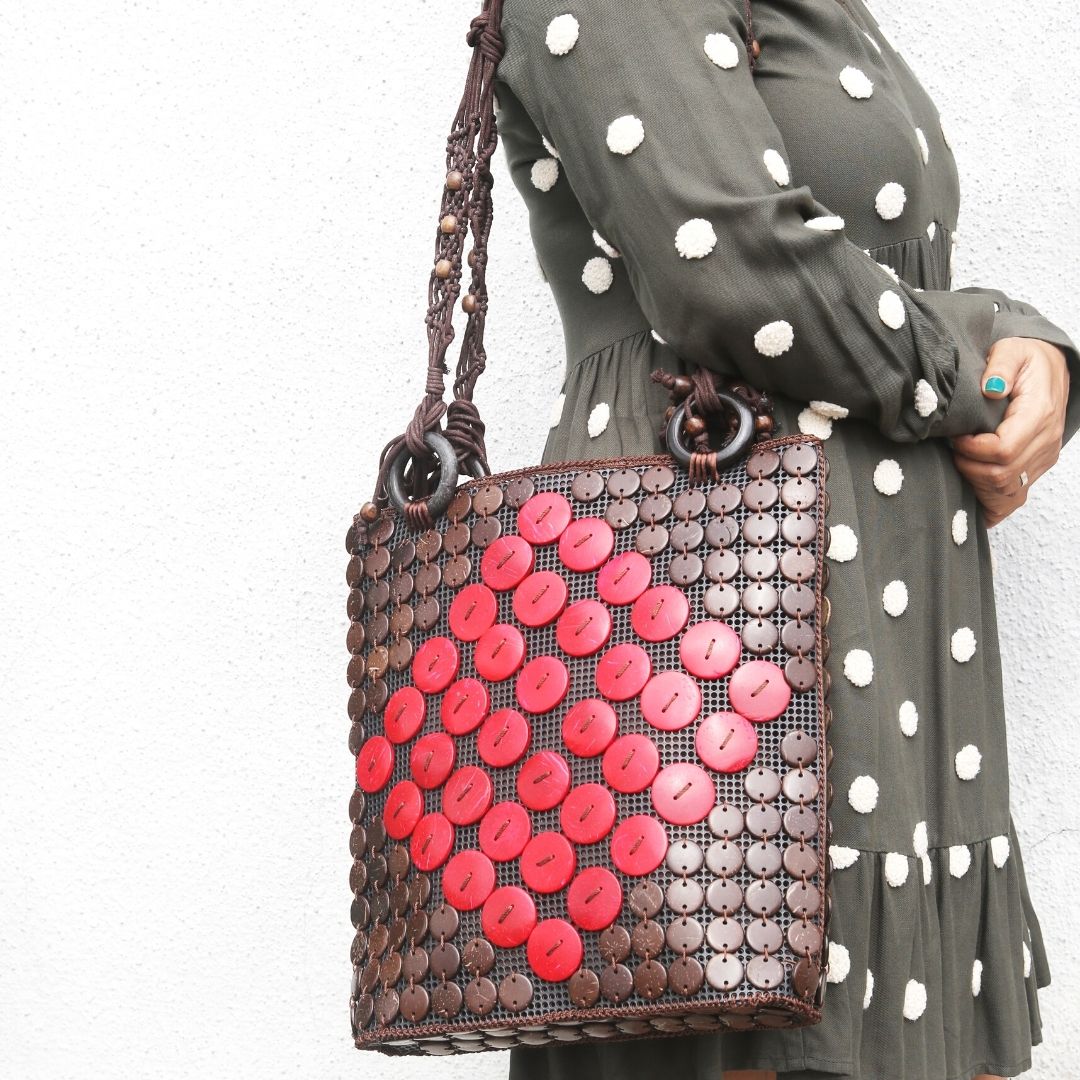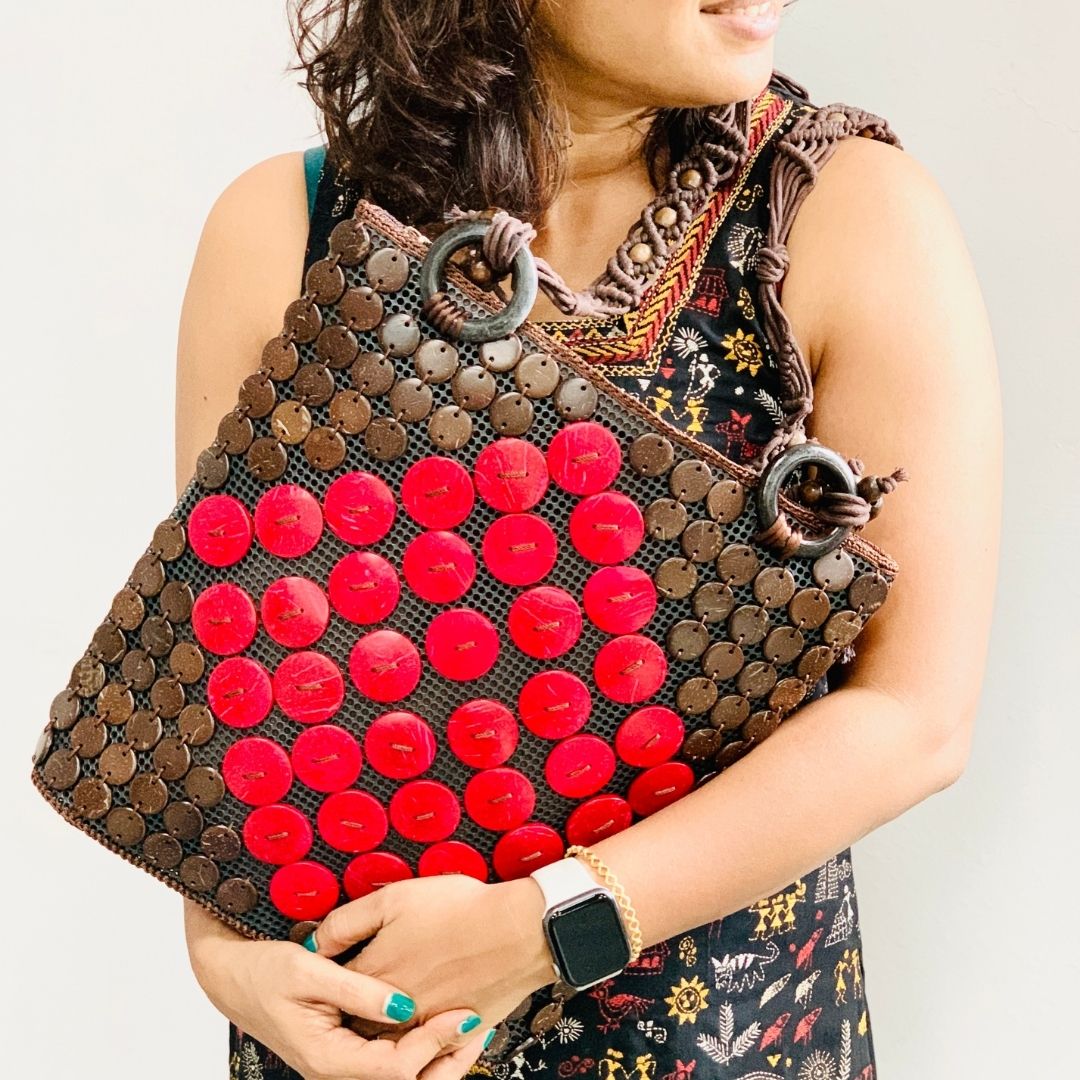 Natural, premium quality coconut shells with a smooth, glowing finish dyed in beautiful red and teamed up with rustic natural coconut. Well hand-stitched in a geometric pattern on recycled PU mesh with silk trims.