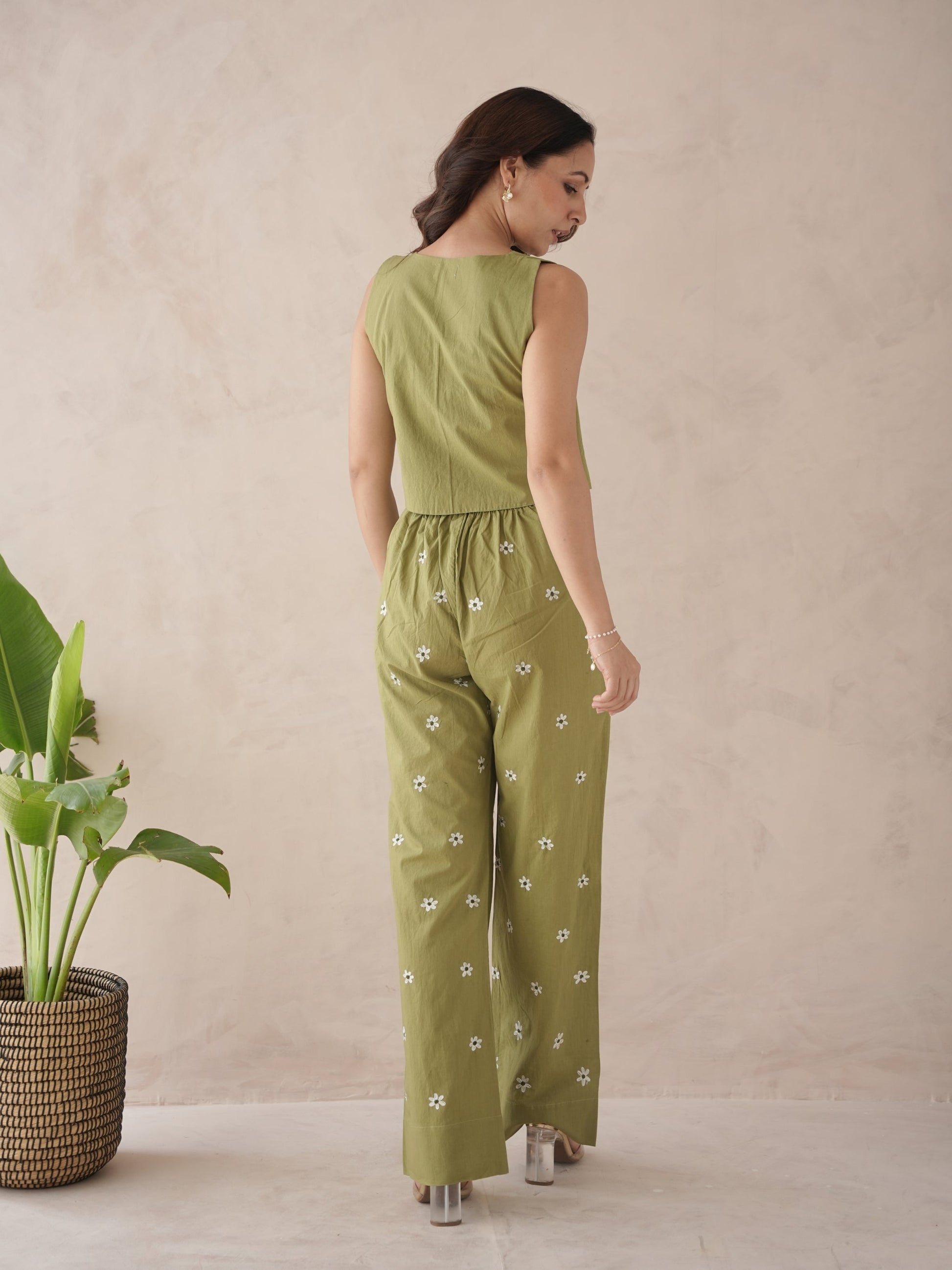 Elevate your everyday summer style with our Serra Olive Embroidery Co-ord Set. Crafted from soft, breathable cotton, this two-piece ensemble features a sleeveless V-neck top with front buttons and an asymmetrical hem, paired effortlessly with relaxed, wide-leg pants. The soothing olive hue is adorned with delicate white floral embroidery, adding a touch of charm and femininity to the look.