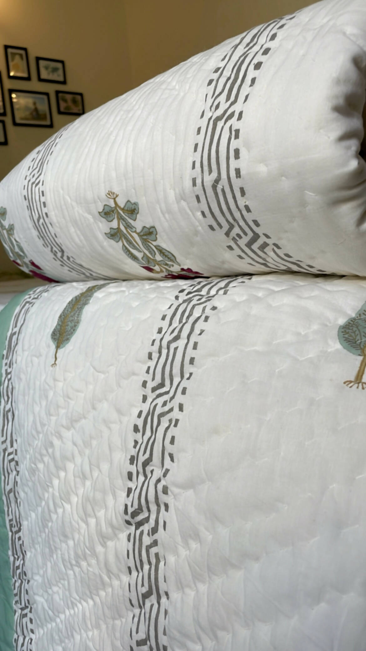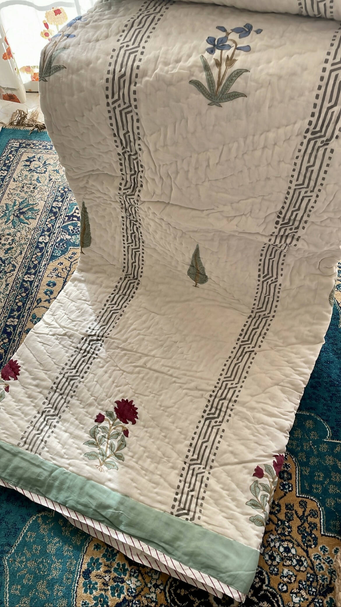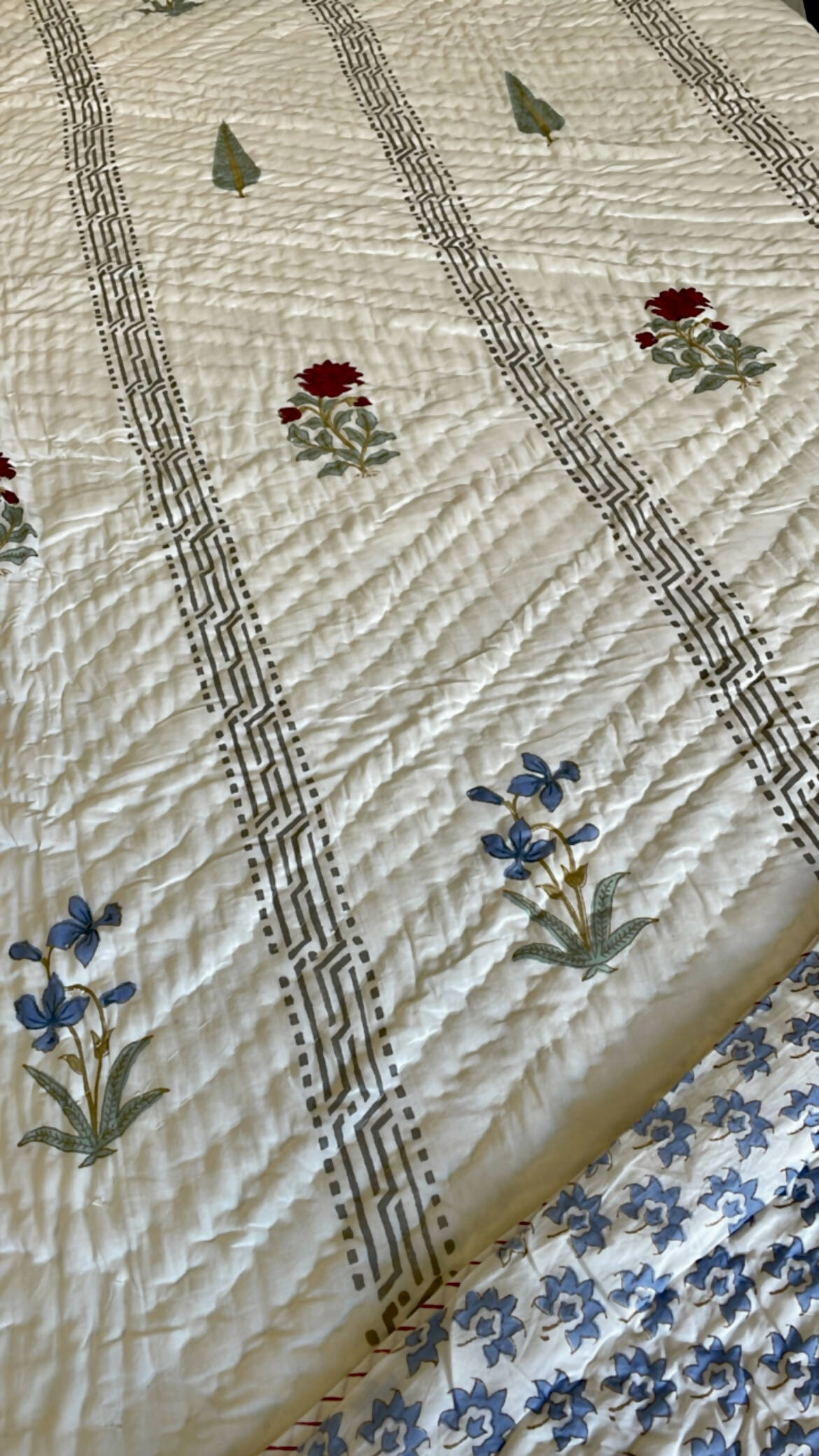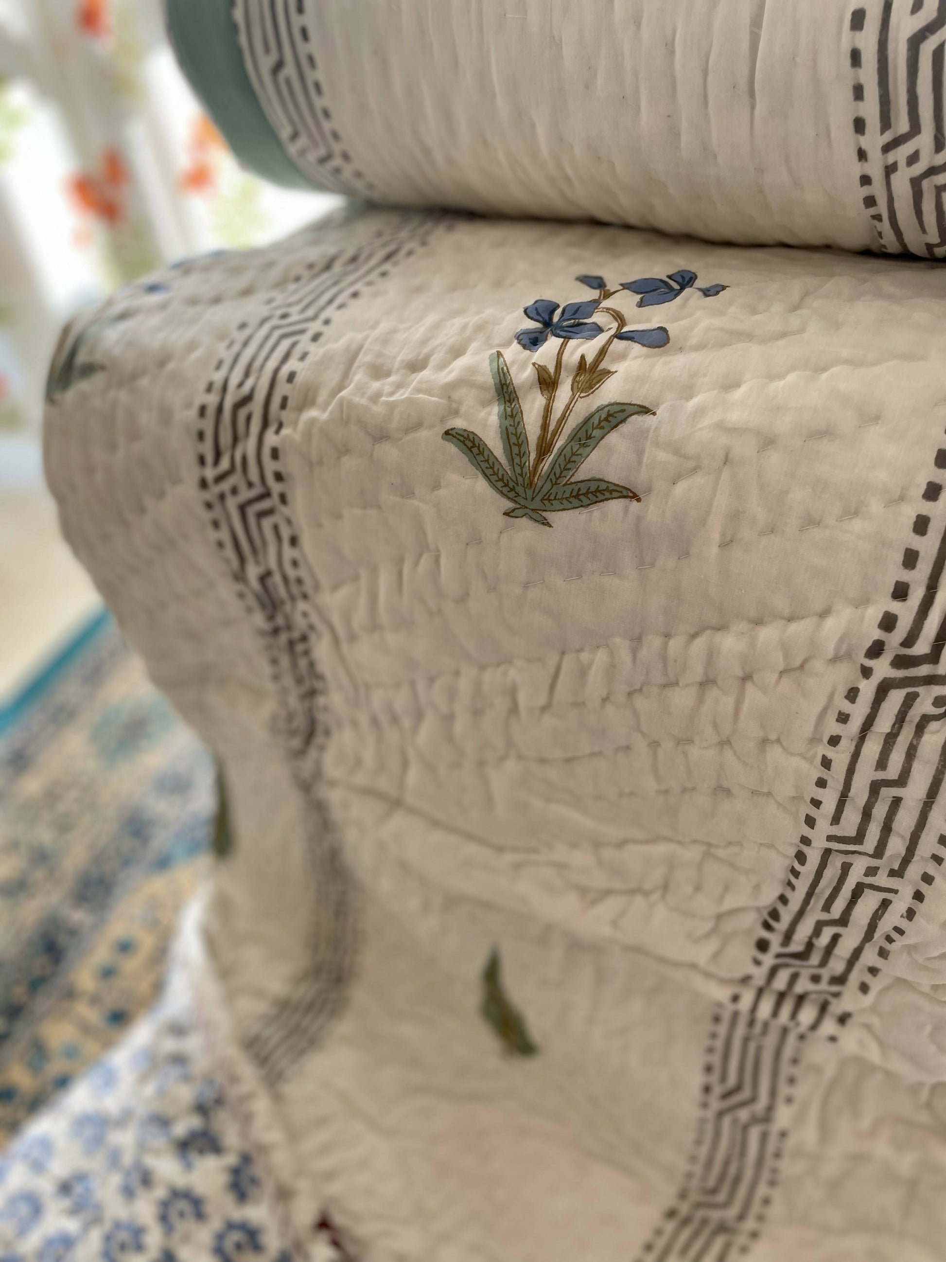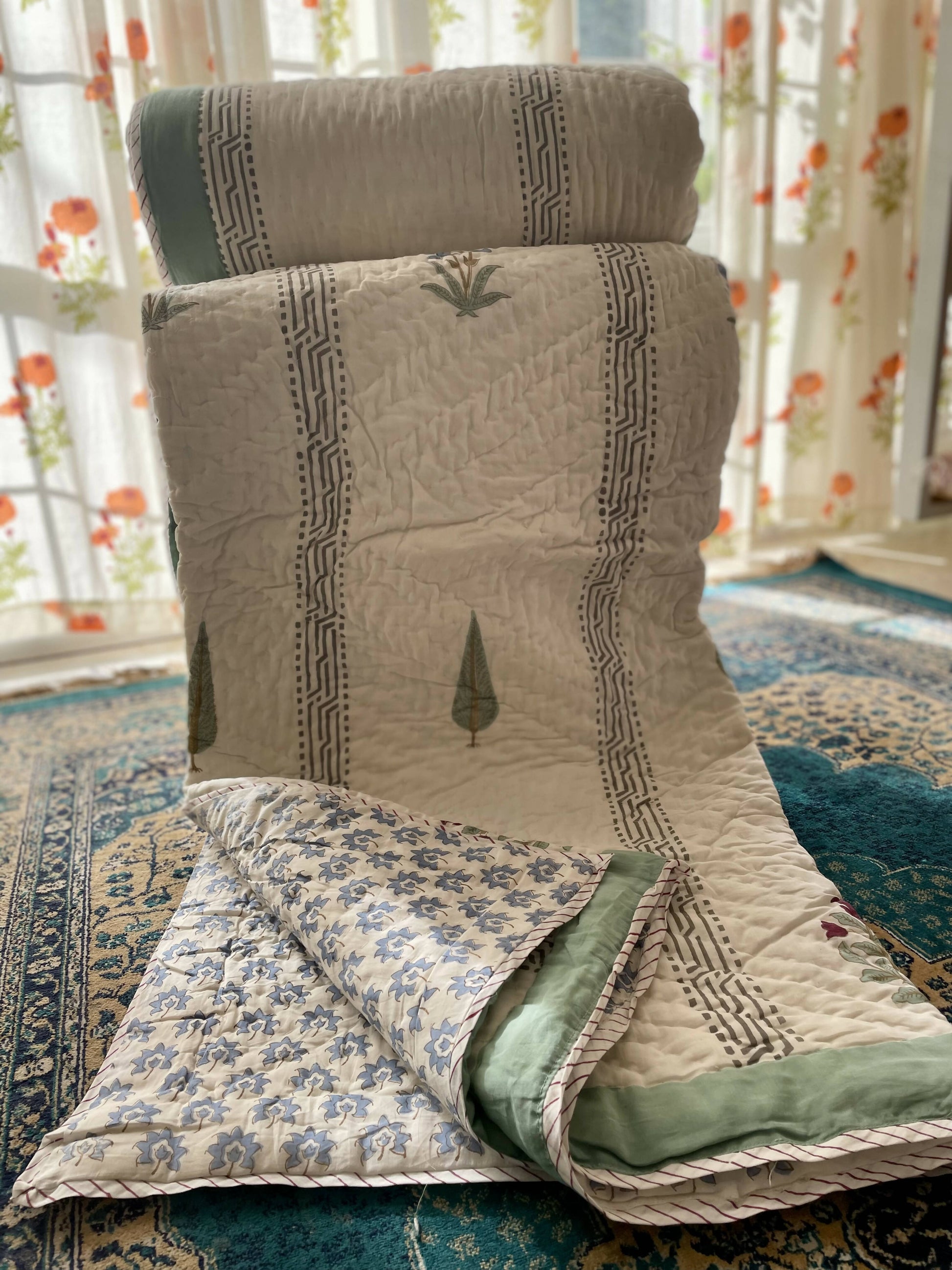 A fine hand quilted Jaipuri razai or quilt. This handmade product can be used as bedcover as well or a A/C comforter. 100% premium cotton sheets used inside out, this is an extremely light yet cozy handmade product. Hand block printed on both sides with different design.