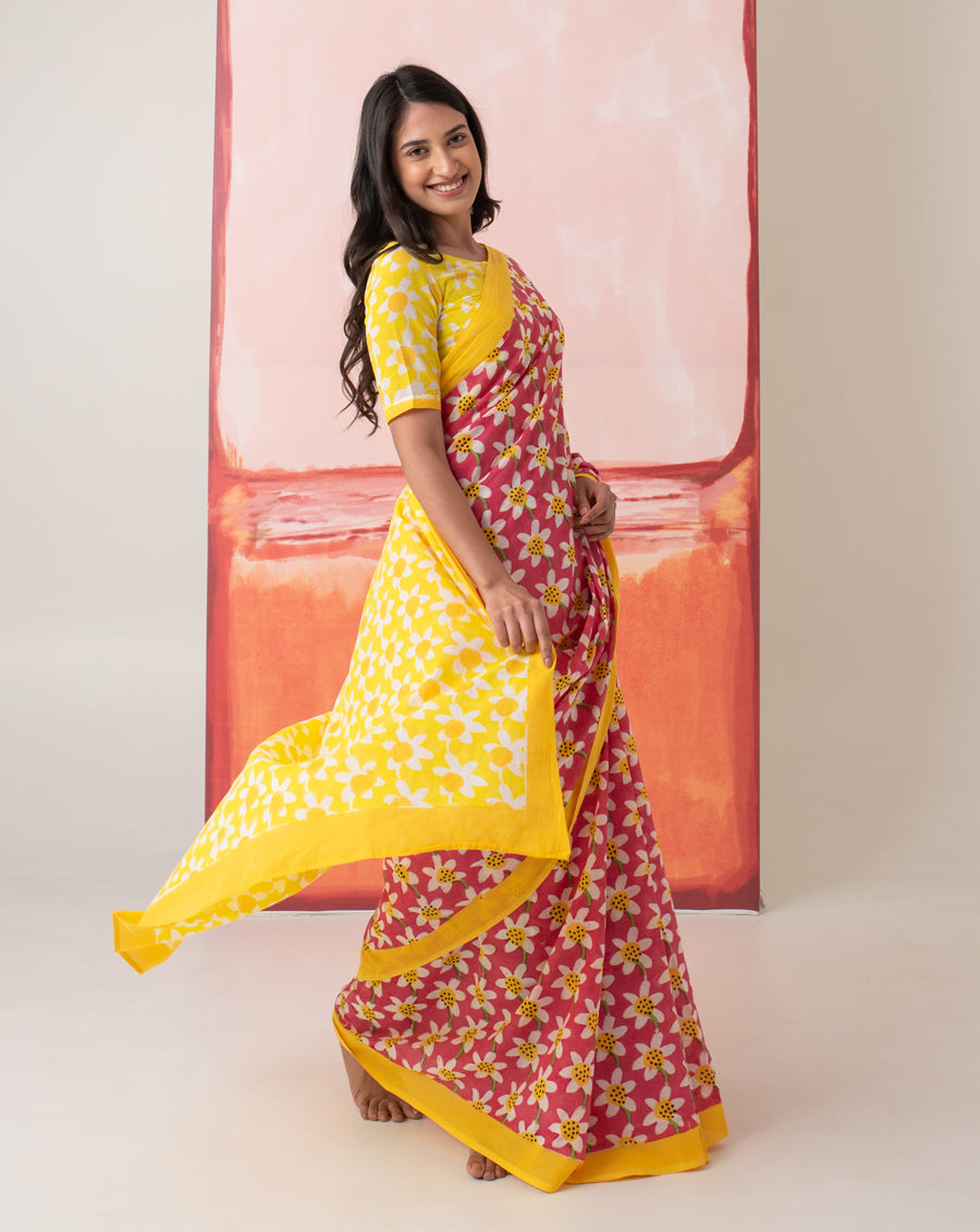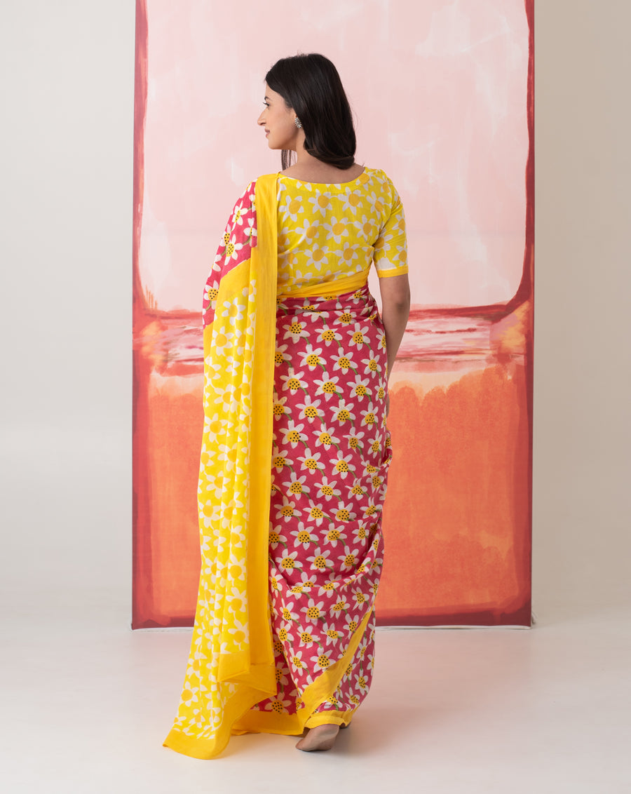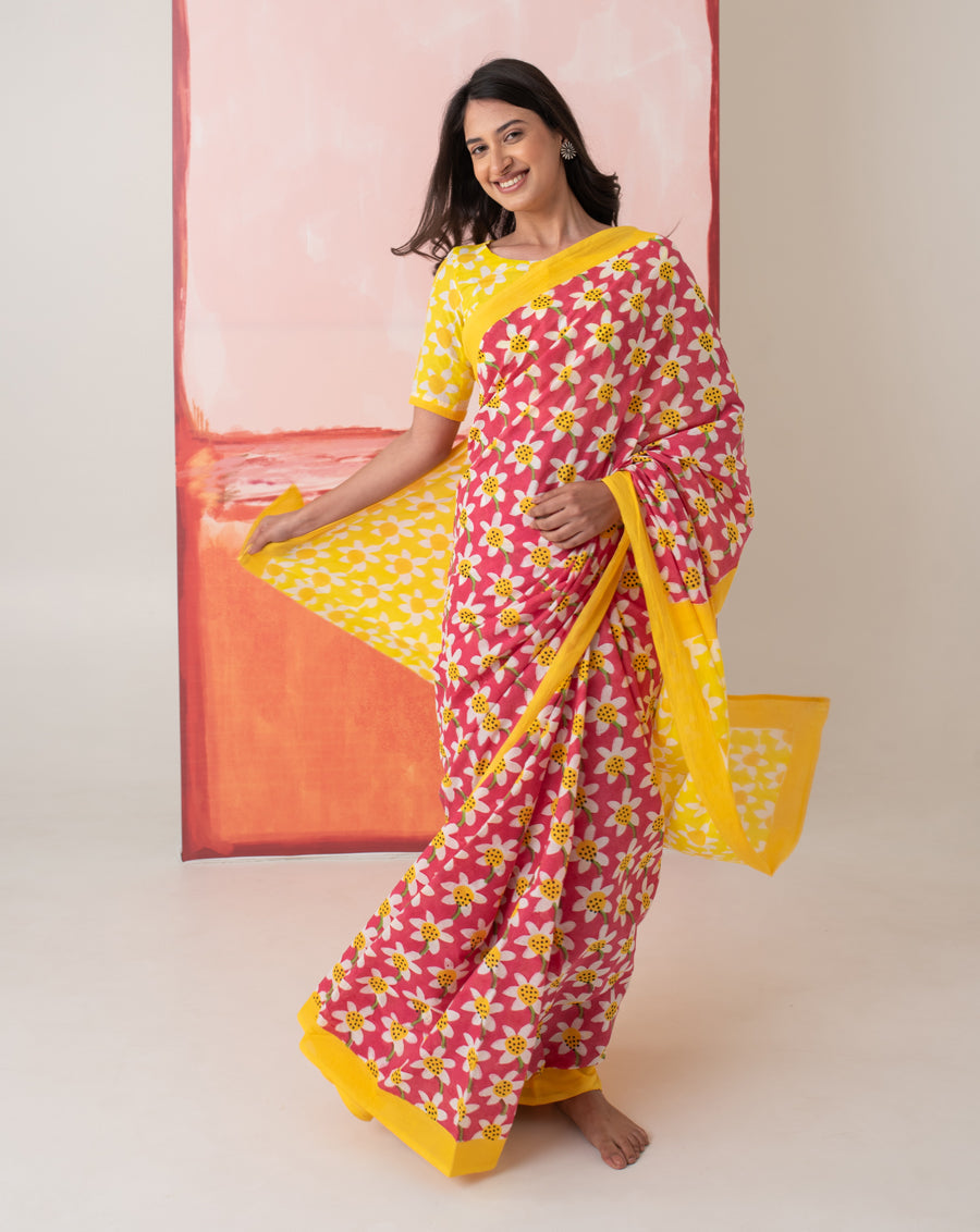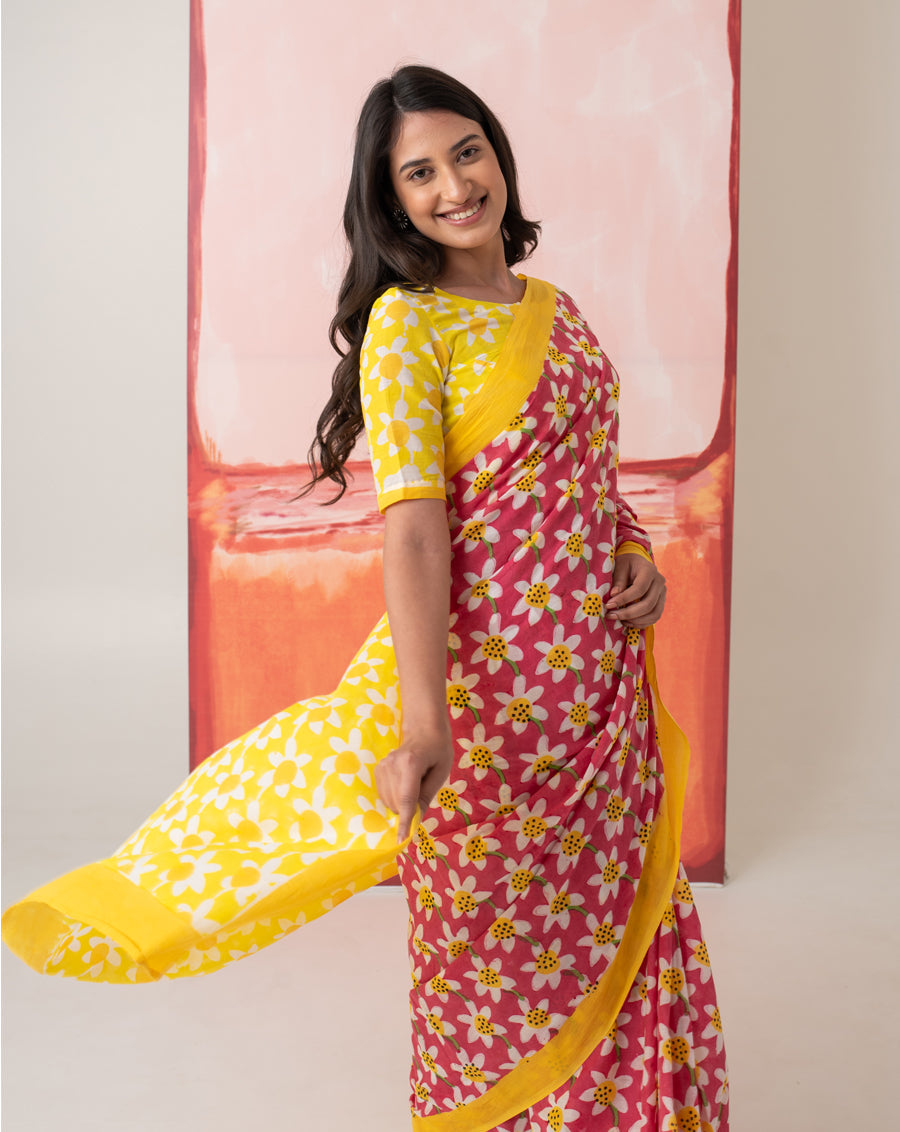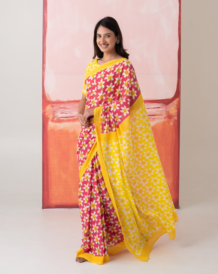 Bloom in elegance with Sharmila’s Daffodil Mul Cotton Saree. Handblock printed with delicate daffodil patterns, this saree brings a fresh and vibrant touch to your wardrobe. Crafted from luxurious mul cotton, it combines breathability with a refined, timeless appeal—perfect for those who cherish comfort without compromising on style.