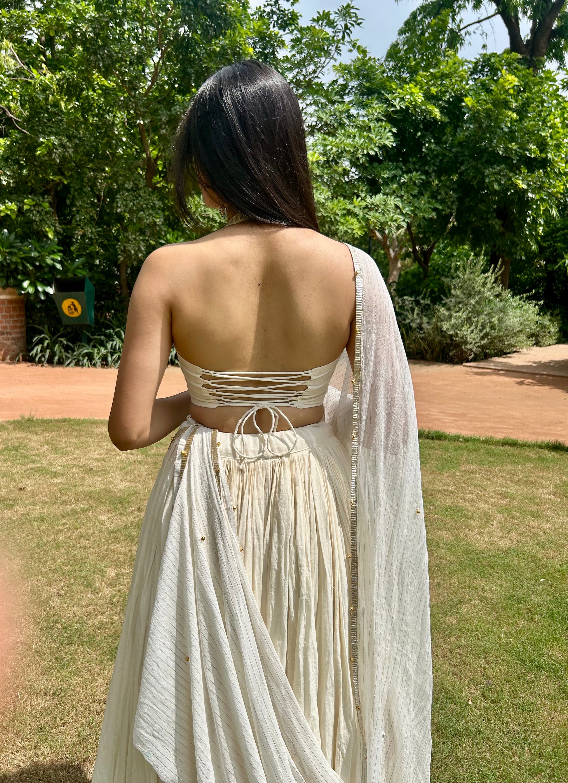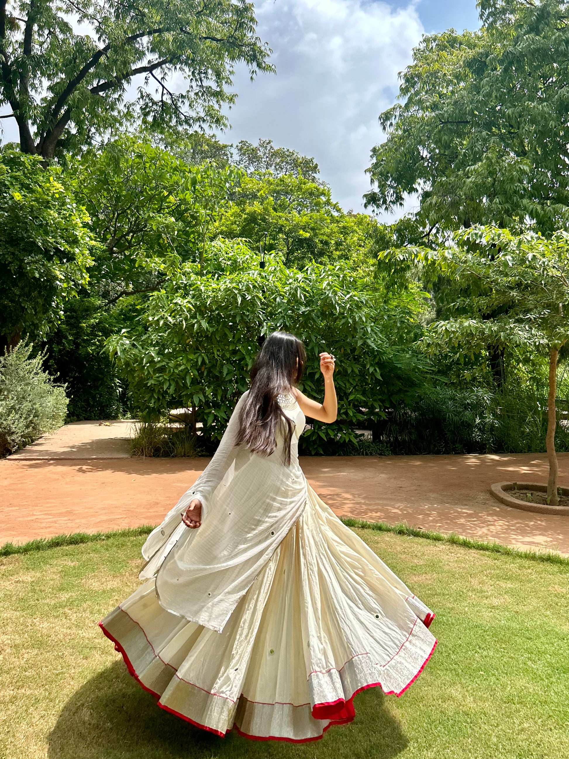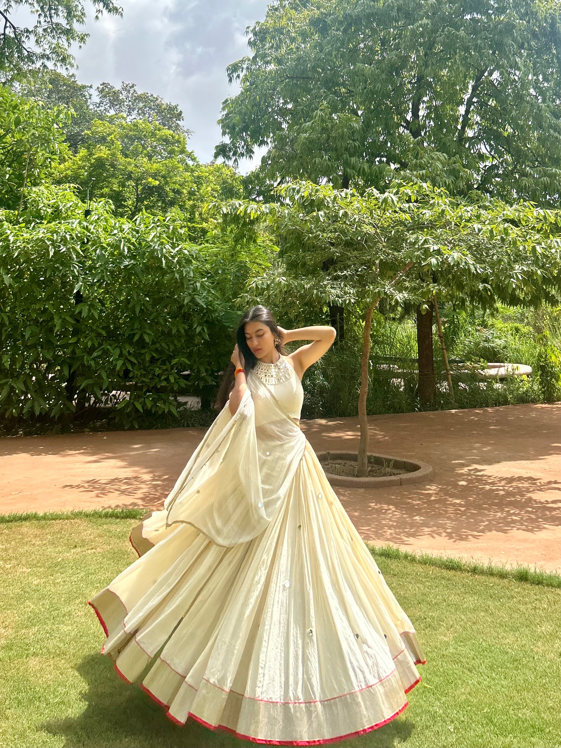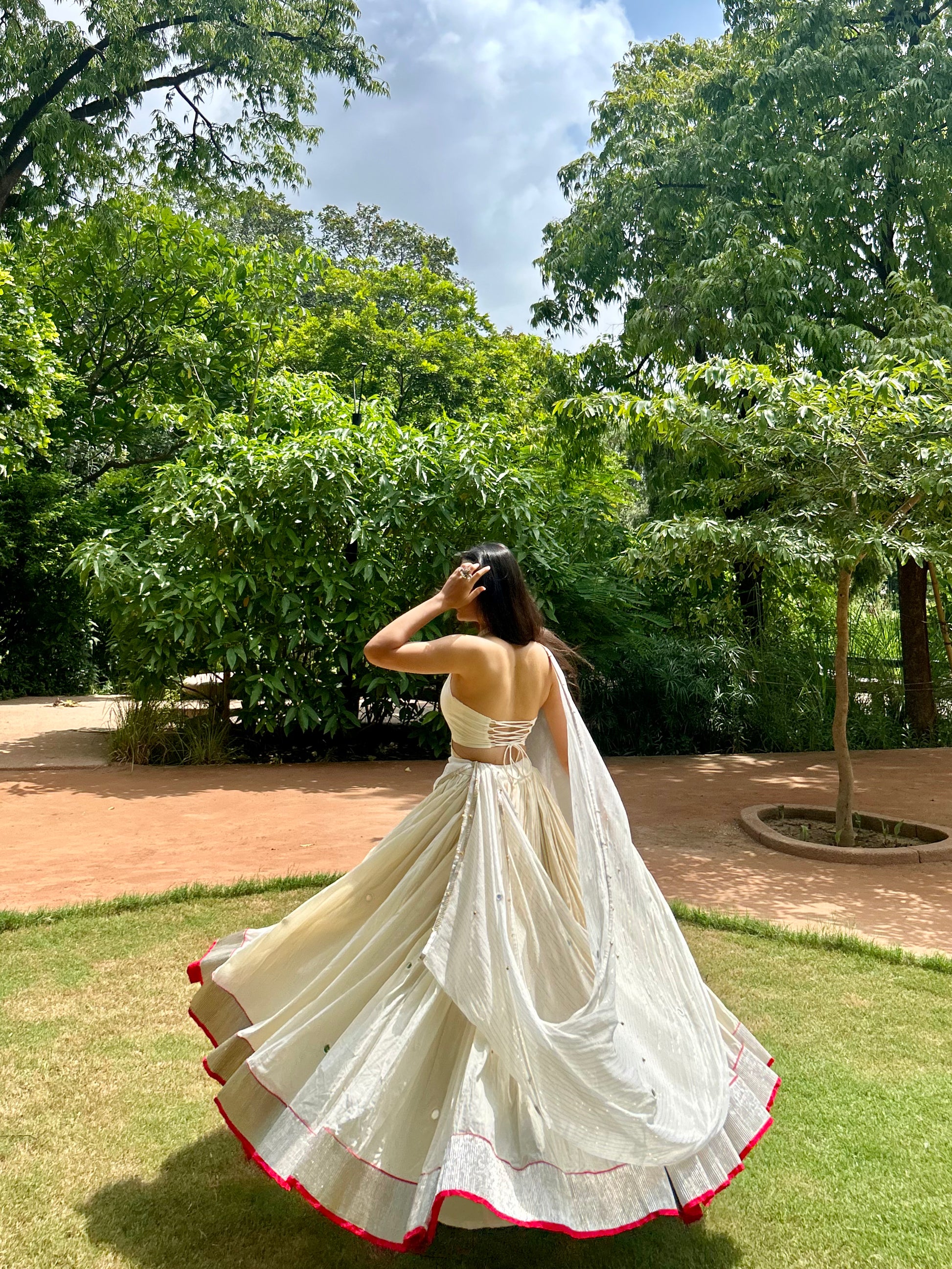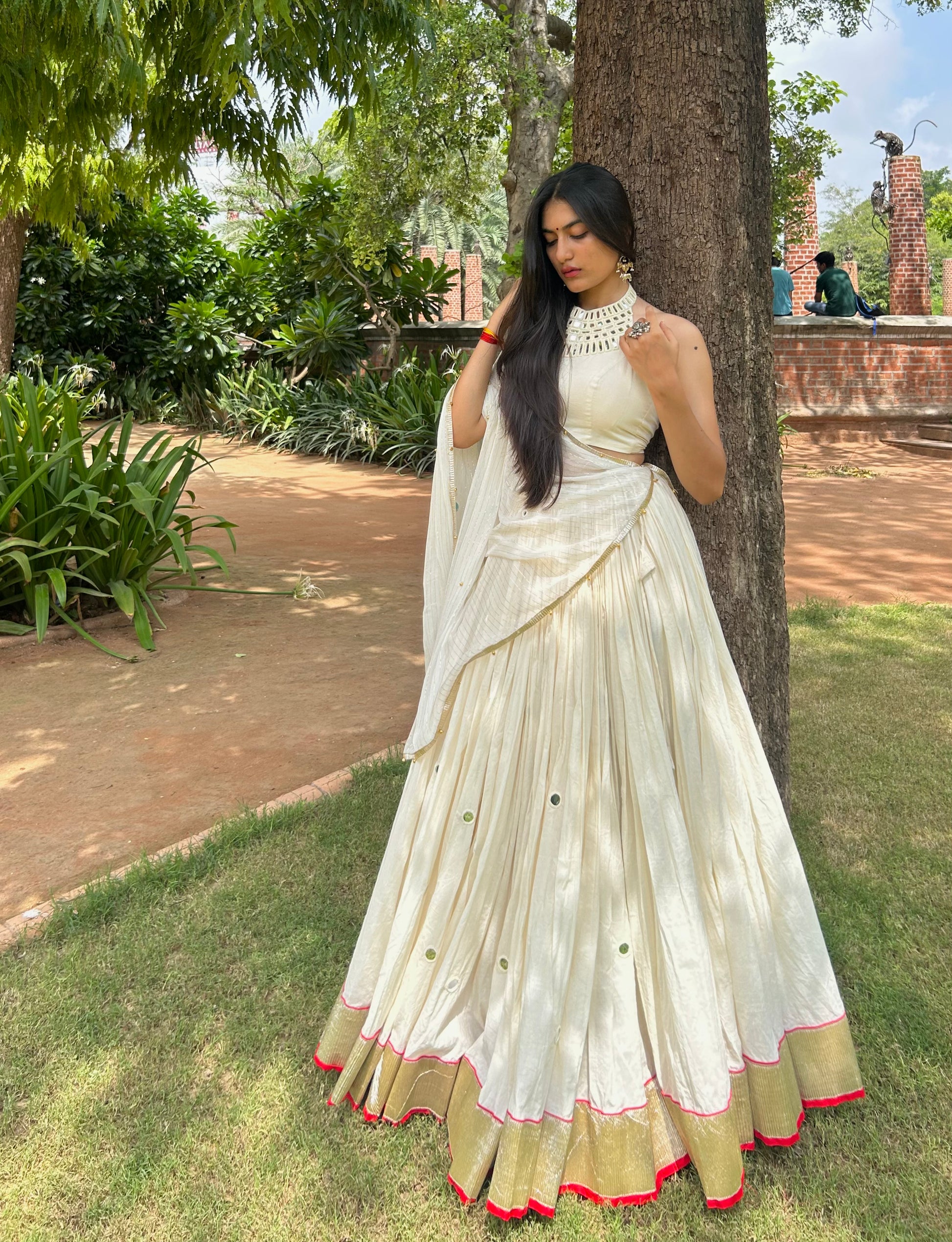 This shimmer lehenga shines with intricate mirror work adding glamour to your outfit. With its comfortable fabric and elegant design, it's perfect for any celebration or gathering, making you stand out beautifully.