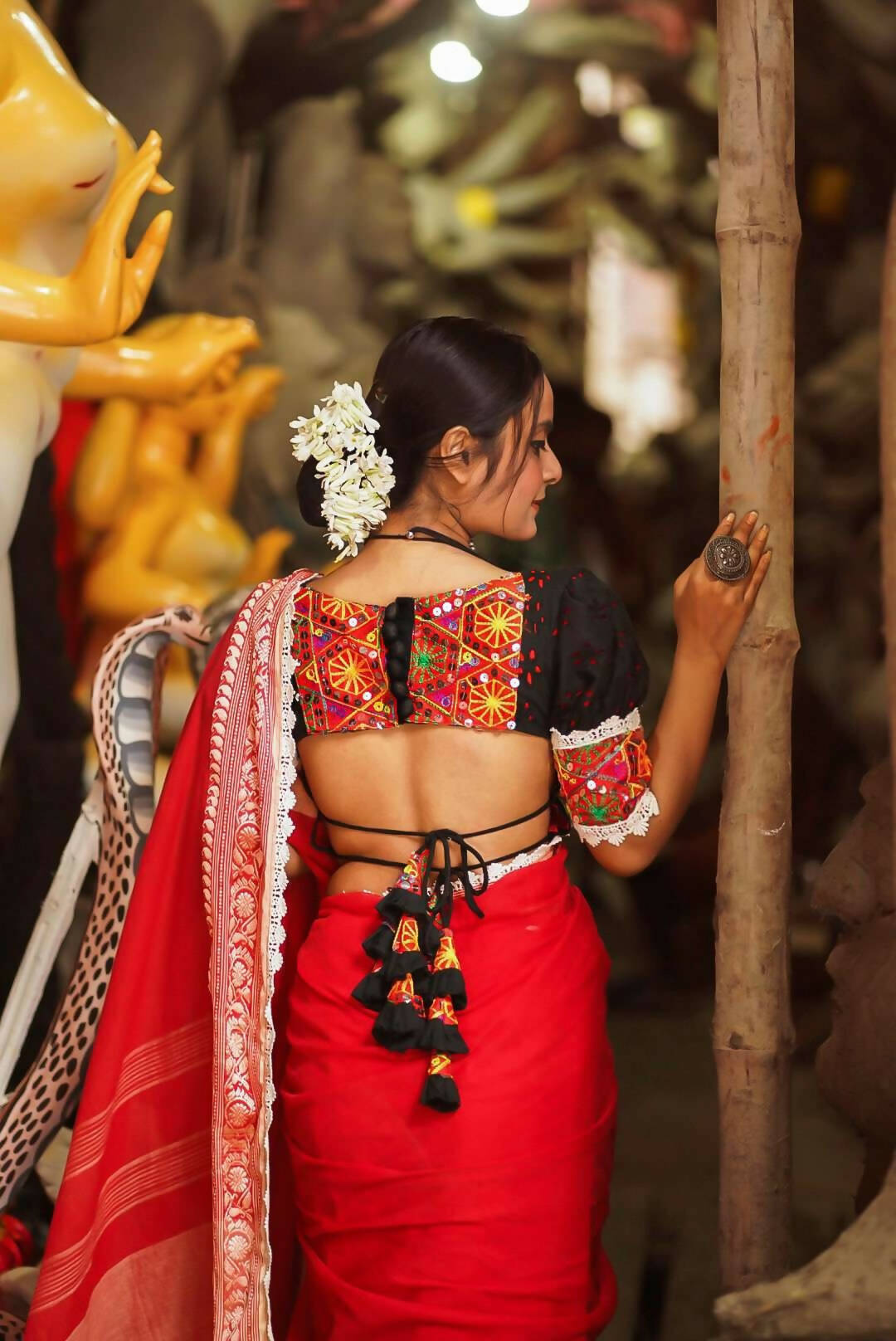 Elegantly designed to complement any saree, this blouse is a timeless fusion of tradition and style. And a perfect piece to add a statement to your attire! Pair it with a monotone saree or go all over by pairing it with a contrast saree. This one will surely will be a statement piece in your wardrobe.