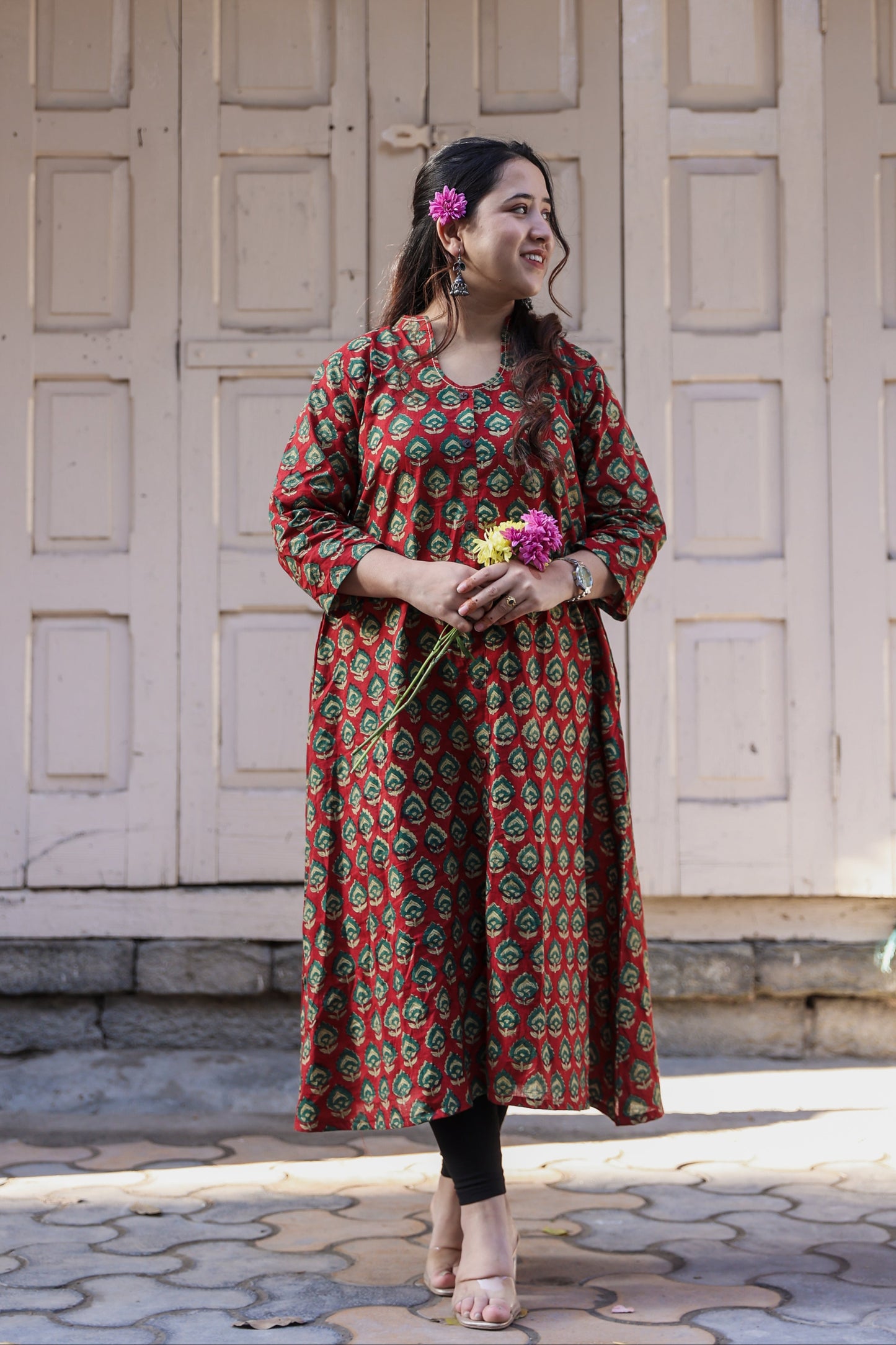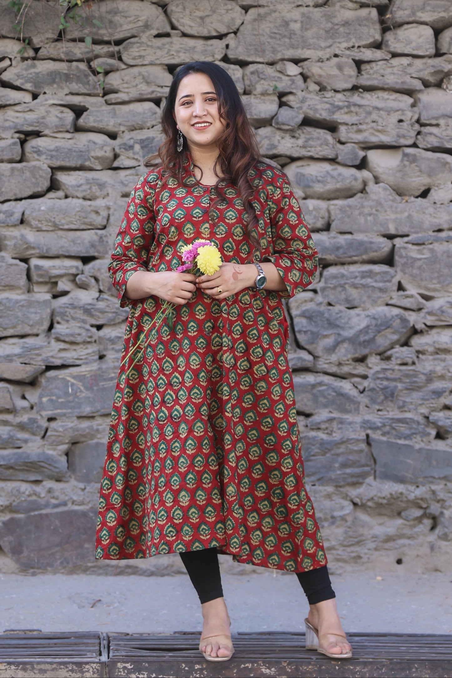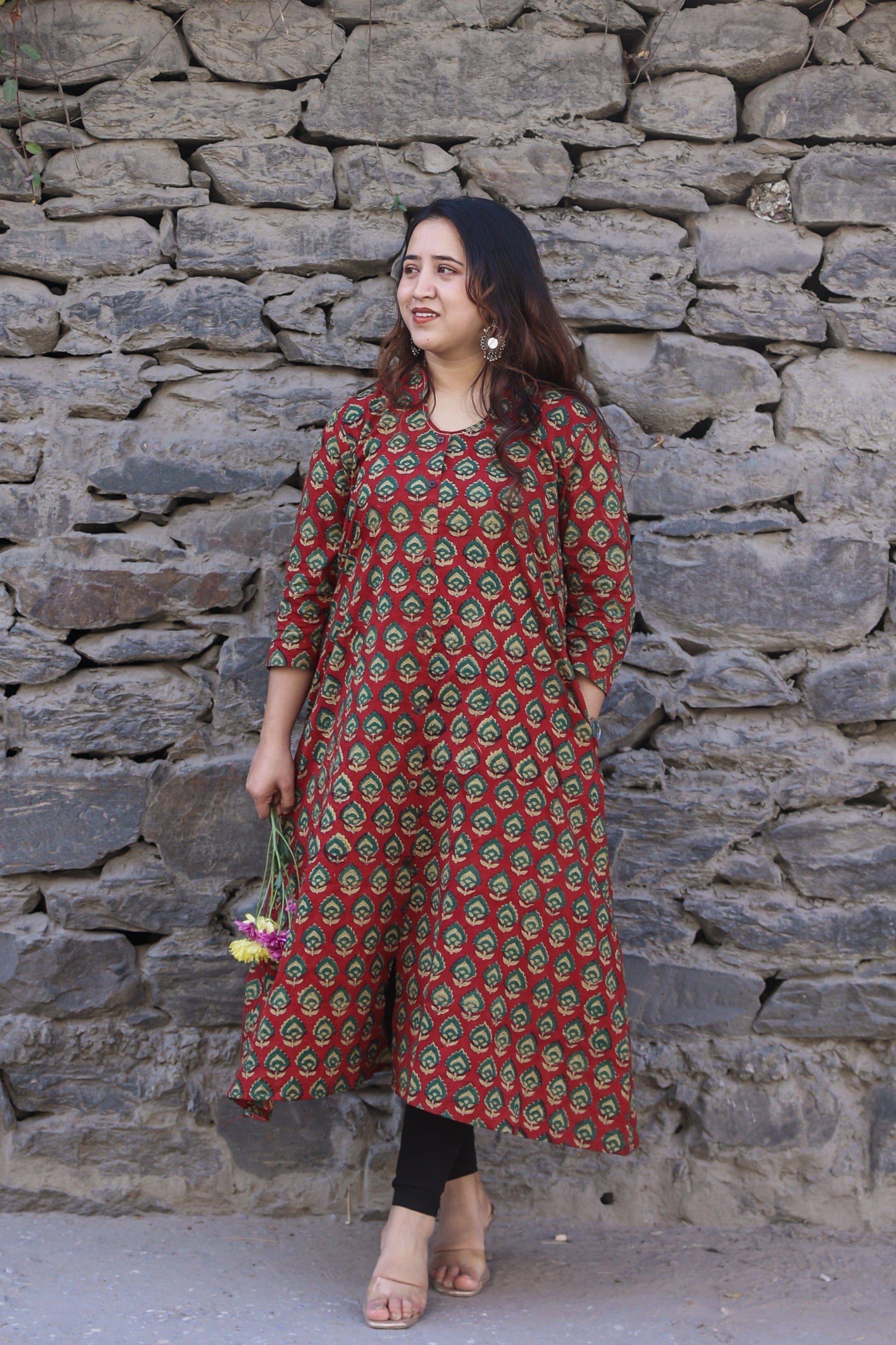 The Shivani Bagru A-line Long Kurta showcases exquisite Bagru block-printed floral patterns on soft cotton fabric. Designed with a flattering Kali cut and convenient pockets, this kurta combines traditional charm with modern comfort for a stylish and functional look.