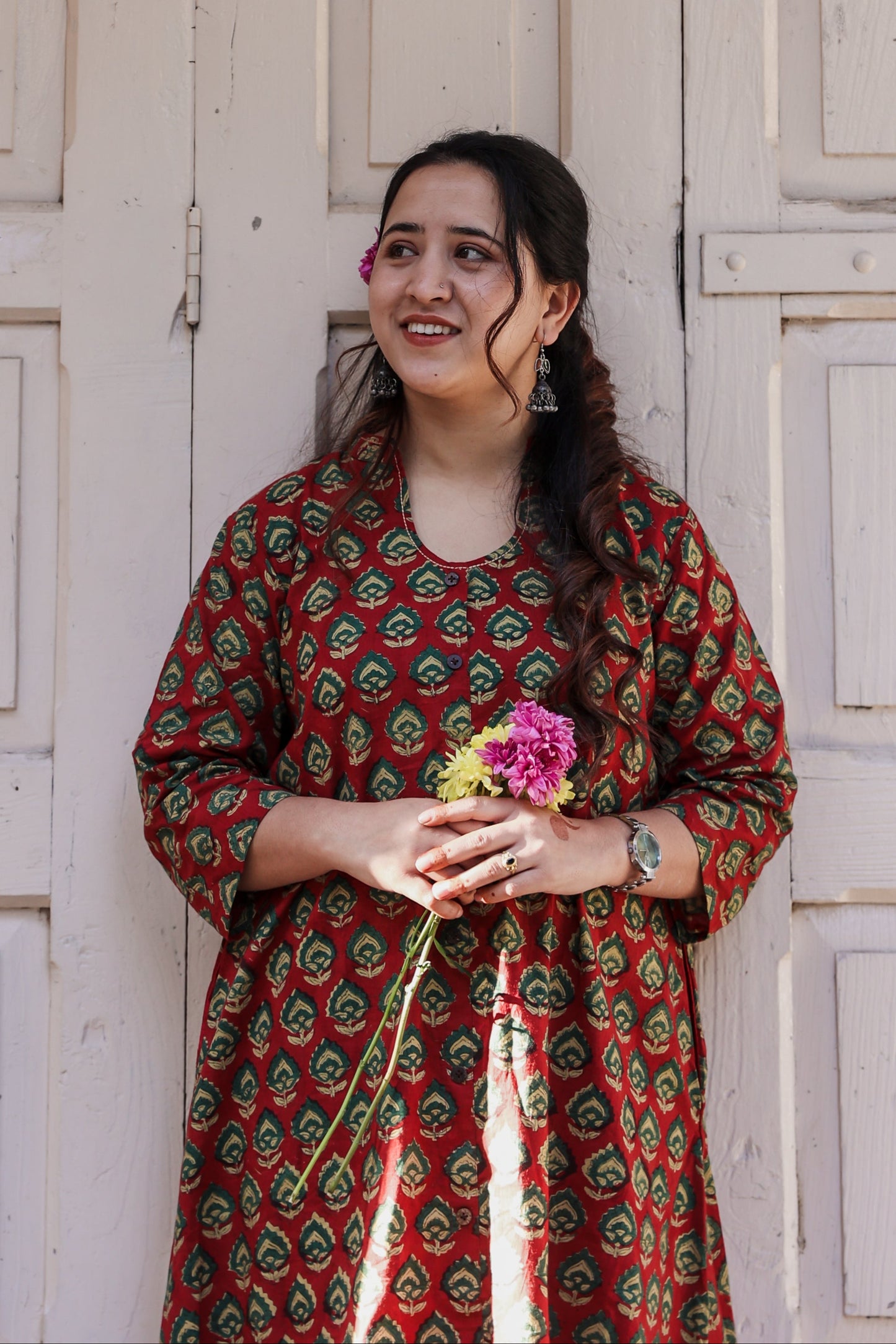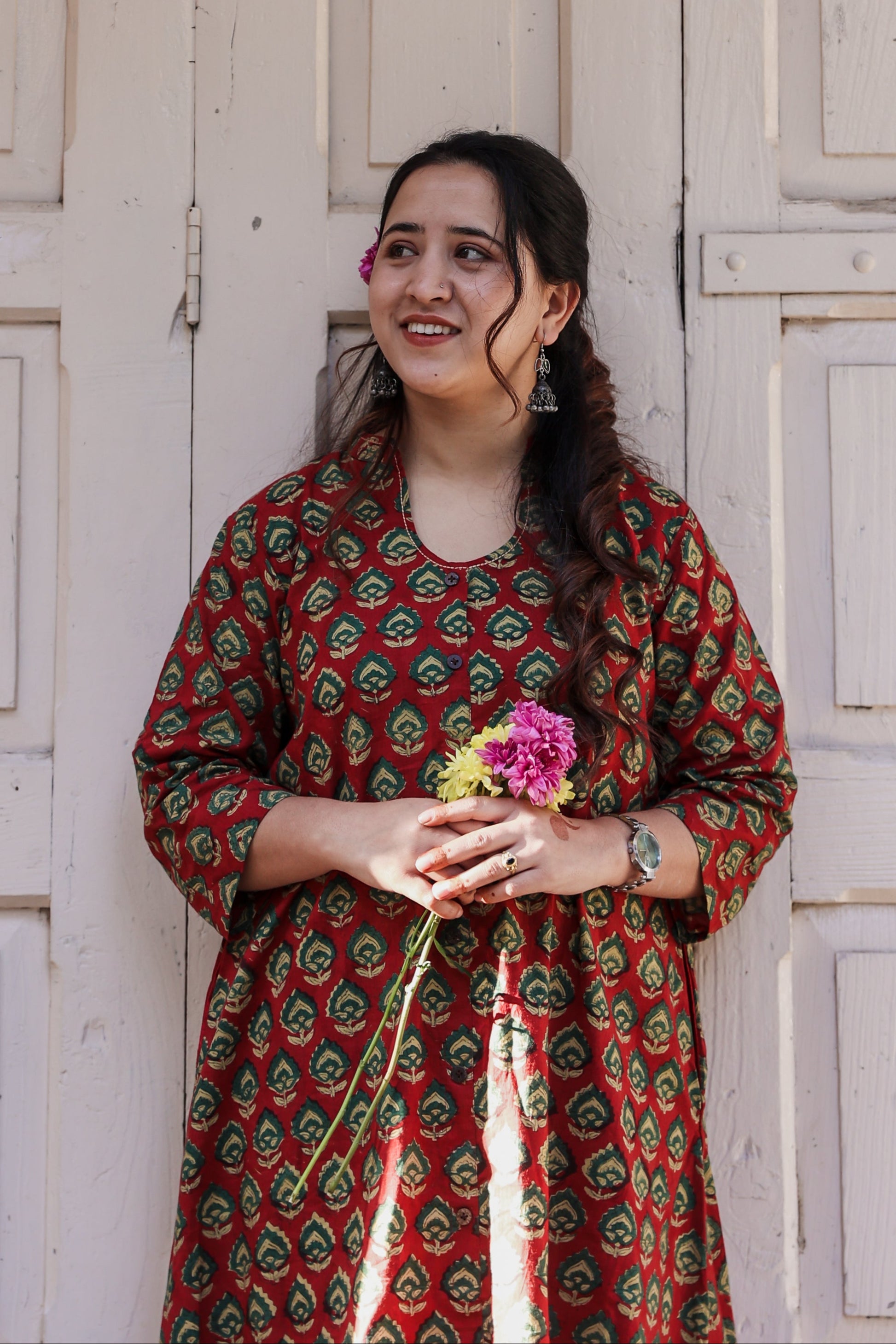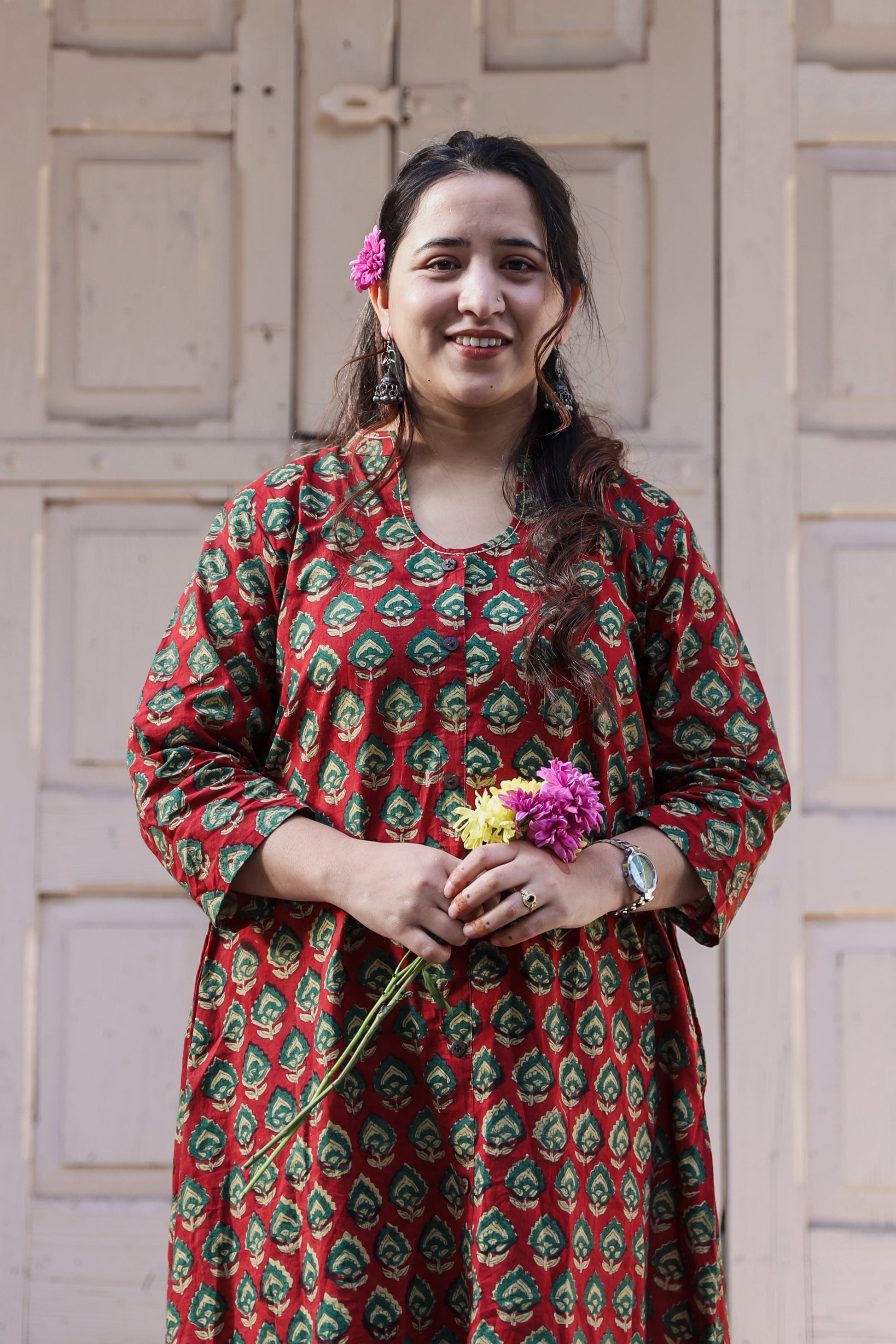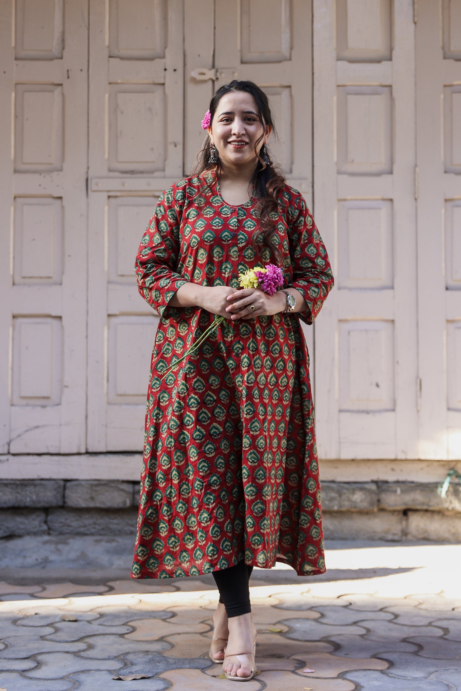 The Shivani Bagru A-line Long Kurta showcases exquisite Bagru block-printed floral patterns on soft cotton fabric. Designed with a flattering Kali cut and convenient pockets, this kurta combines traditional charm with modern comfort for a stylish and functional look.