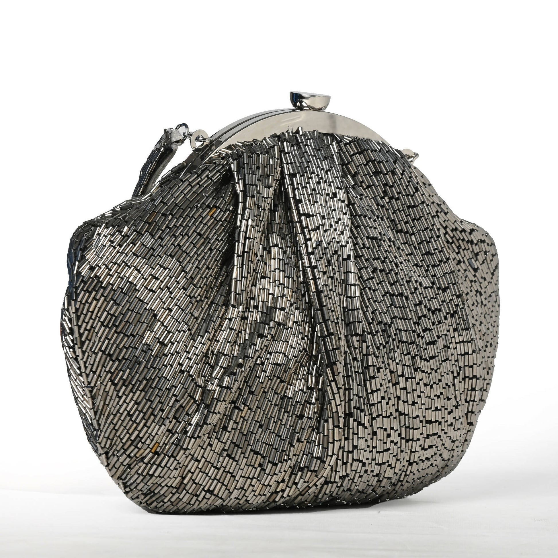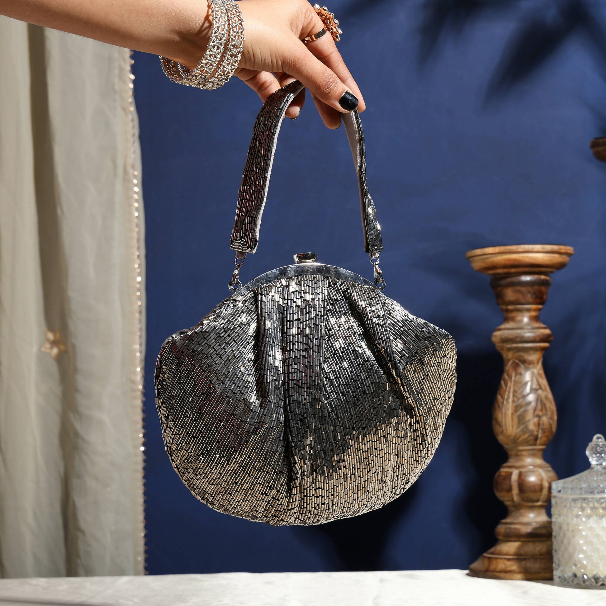 Chic Gun Metal Cutdana Batua Bag featuring shimmering detailing and an embroidered handle. Spacious enough to fit most phone sizes, it's your stylish essential for any occasion.