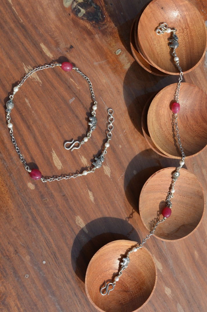 Carved silver elephants have been strung with chains, pearls and red cabochon stones to create this pair of bohemian looking anklets. Wear these as a pair to make a statement or even around one ankle for a contemporary look.