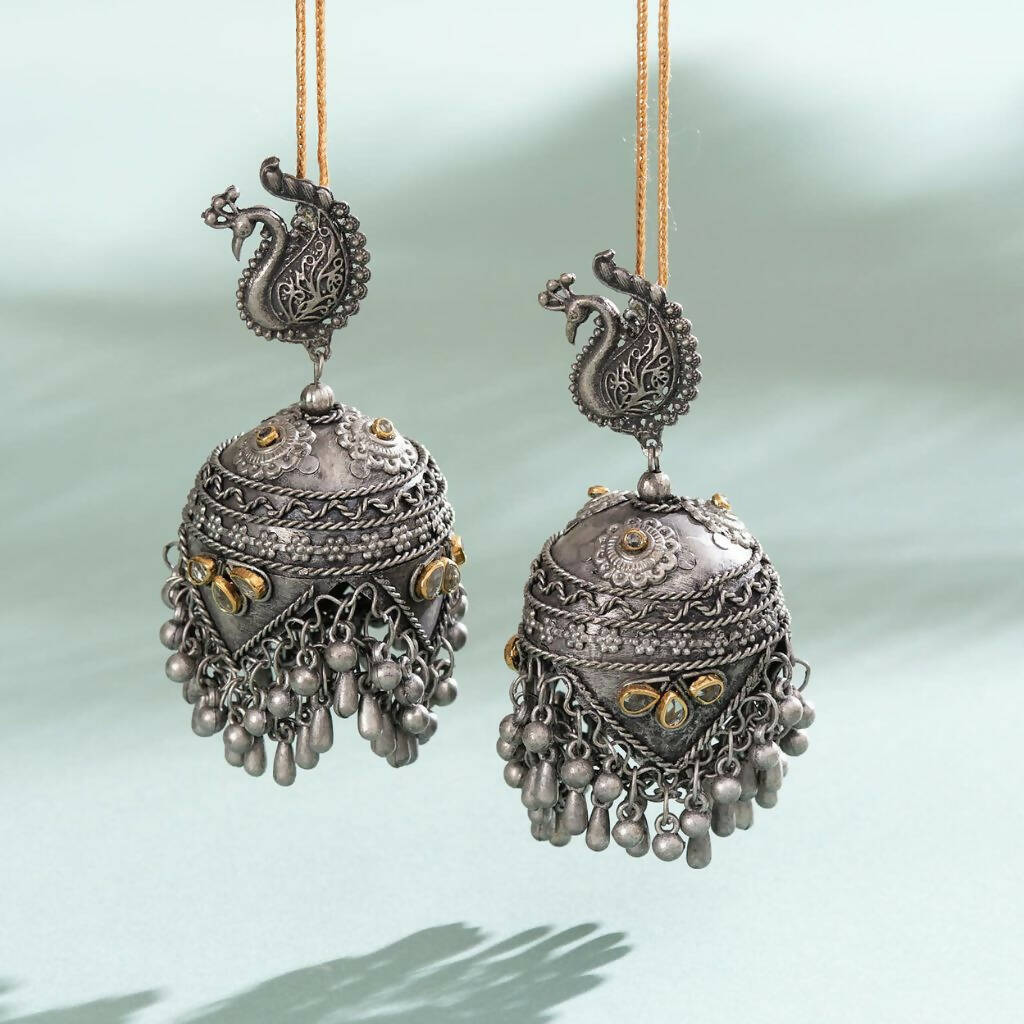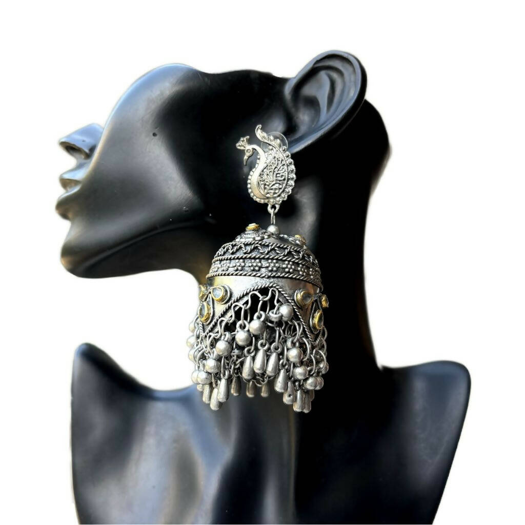 Silver Oxidised Panash Jhumkas/Peacock Oversized Jhumkas