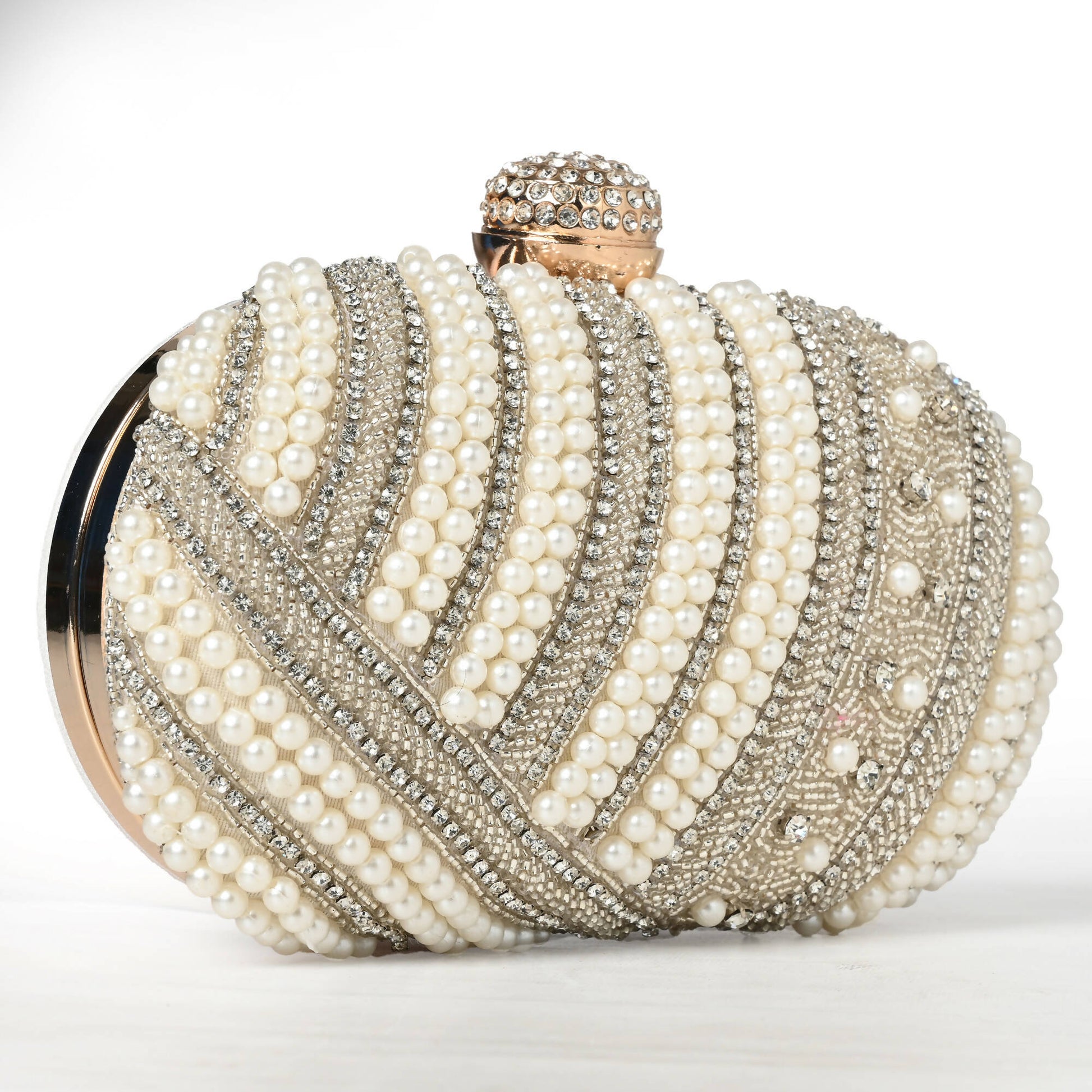 Silver Studded Oval Clutch Bag, crafted on silk with pearls and stones. Includes a sling chain for effortless elegance.