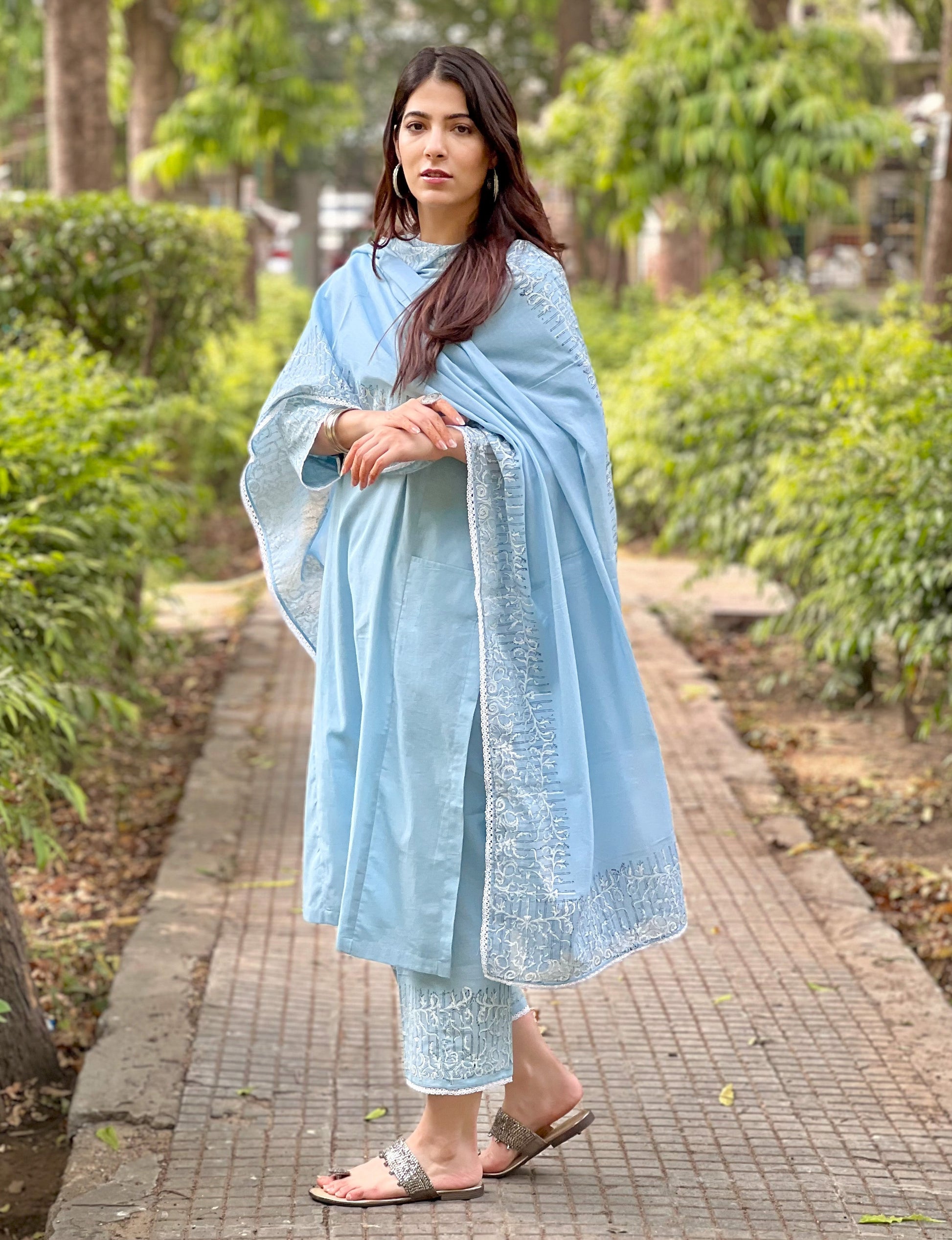 Our sky blue cotton set comes with black white block printing detailing and a block printed dupatta. Style it for a casual event or pair it with heavy jewellery for an intimate gathering!