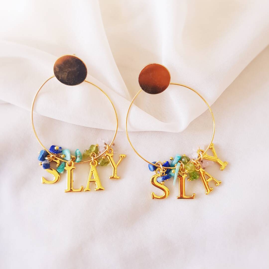 Our Slay-Slay Words Earrings, where romance meets elegance. These enchanting pieces feature delicate charms with the sweetest love-inspired words. Crafted with precision and adorned with a touch of sparkle, these earrings speak volumes about your affection. Whether a gift or a personal indulgence, wear your sentiments with grace. Elevate your style with this ode to love, a timeless addition to your jewelry collection. Let every glance at the Love-Love Words Earrings remind you of cherished moments and celebrate the beauty of affection in a subtle and stylish way.